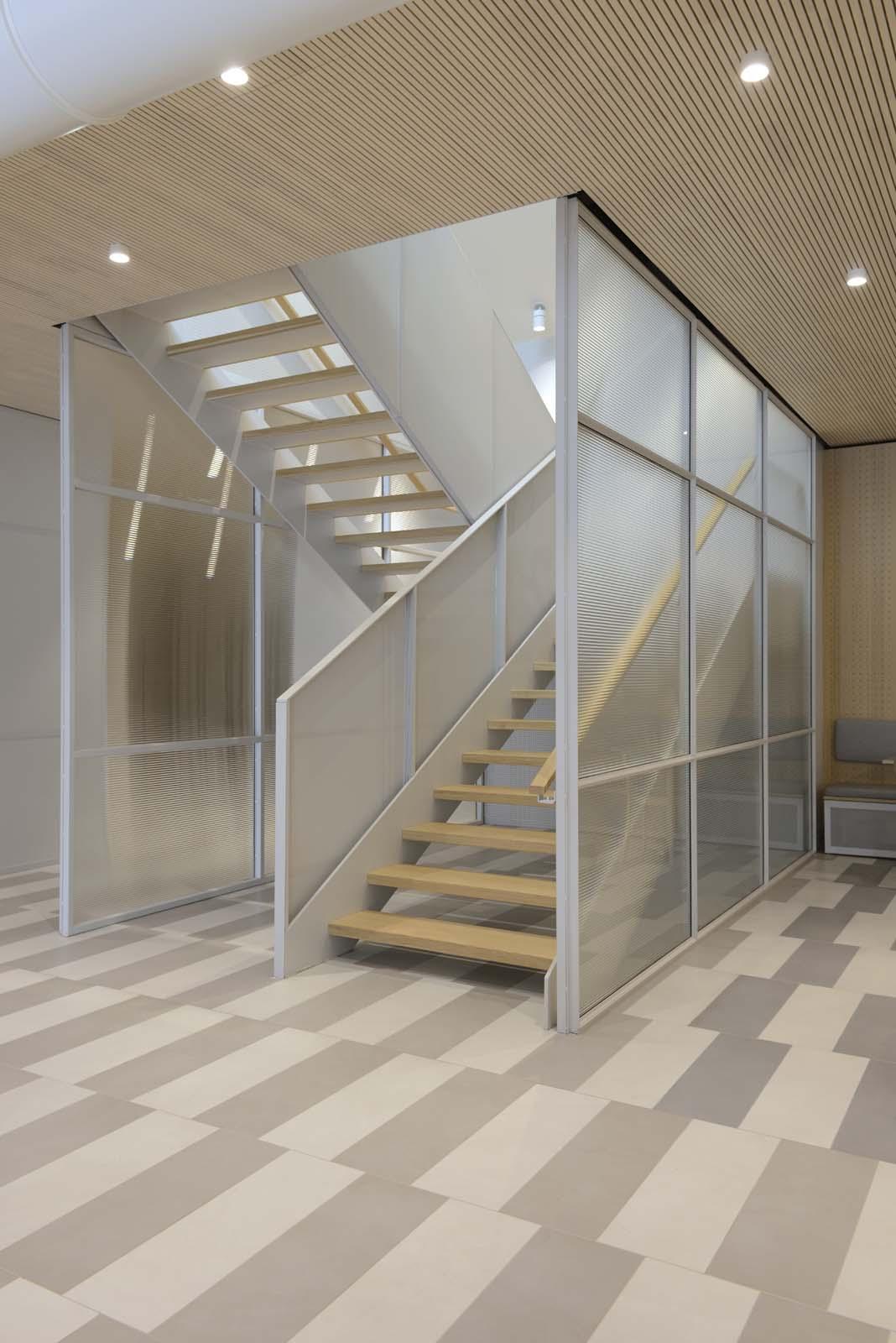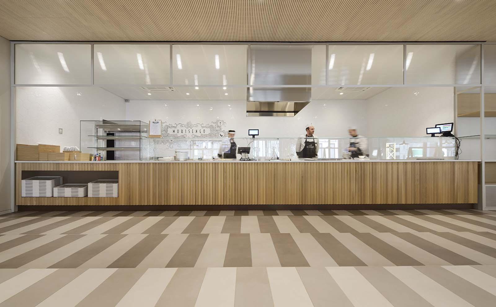 Proiectanții au ales gresie porțelanată cu aspect de ciment Block de la Marazzi în diferite culori – Mocha, White, Greige, Silver – combinate între ele pentru a obține la pardoseală un model geometric simplu, dar de mare impact. Formatul dreptunghiular de 25×75 cm a fost creat pe măsură pentru a placa vasta suprafață a pardoselii.