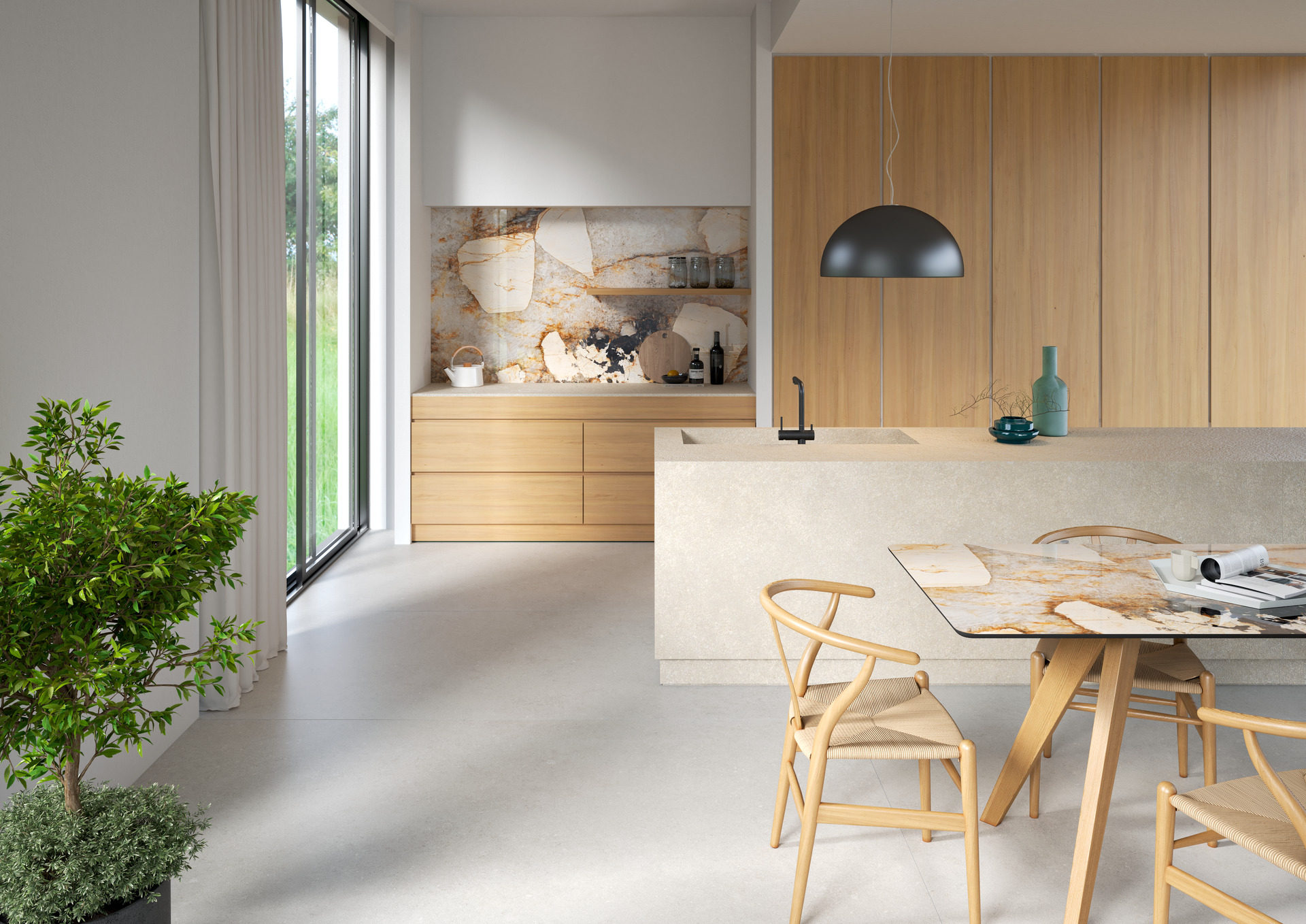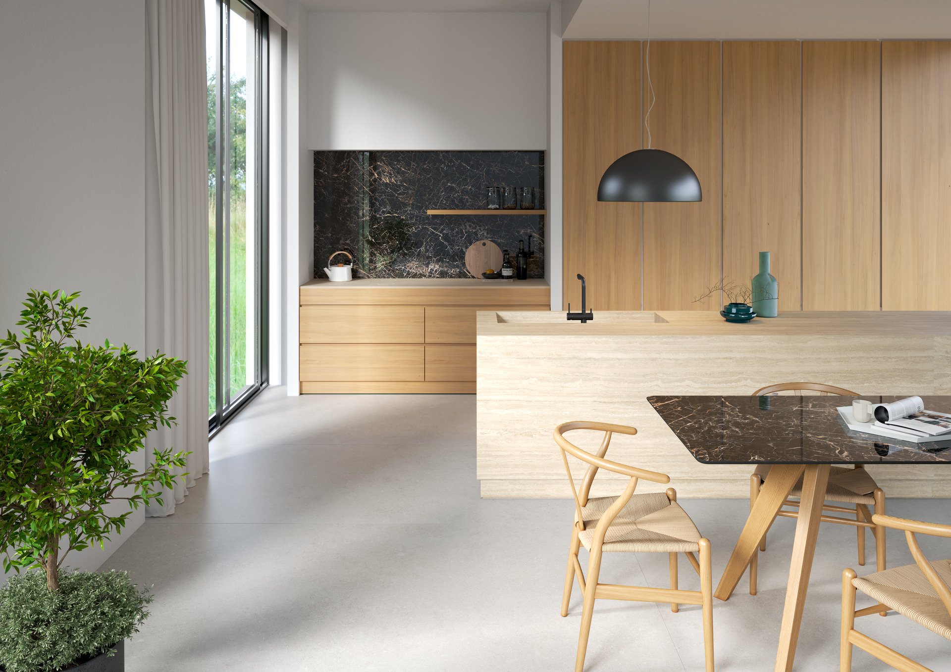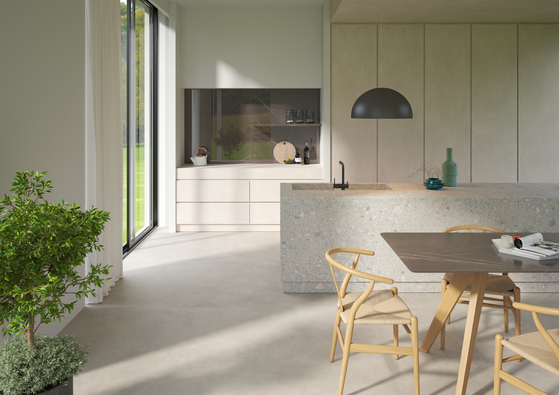 Interioare casnice cu bucătării dinamice și deschise care coexistă, se completează, în spațiul de locuit al zonei de zi. Trend născut din apartamentele urbane, care se restrâng în dimensiuni, aceste spații multifuncționale exprimă nevoia de a locui într-un mod fluid, între public și privat, între munca de acasă și viața de zi cu zi. Alegerea materialelor se concentrează pe ușurința în gestionare și pe multifuncționalitate: gresia porțelanată asigură suprafețe sigure și rezistente, chiar și în contact cu alimentele, datorită tehnologiei premium Puro Marazzi Antibacterial, ce poate fi aplicată pe scară largă de la bucătărie la elementele de living.