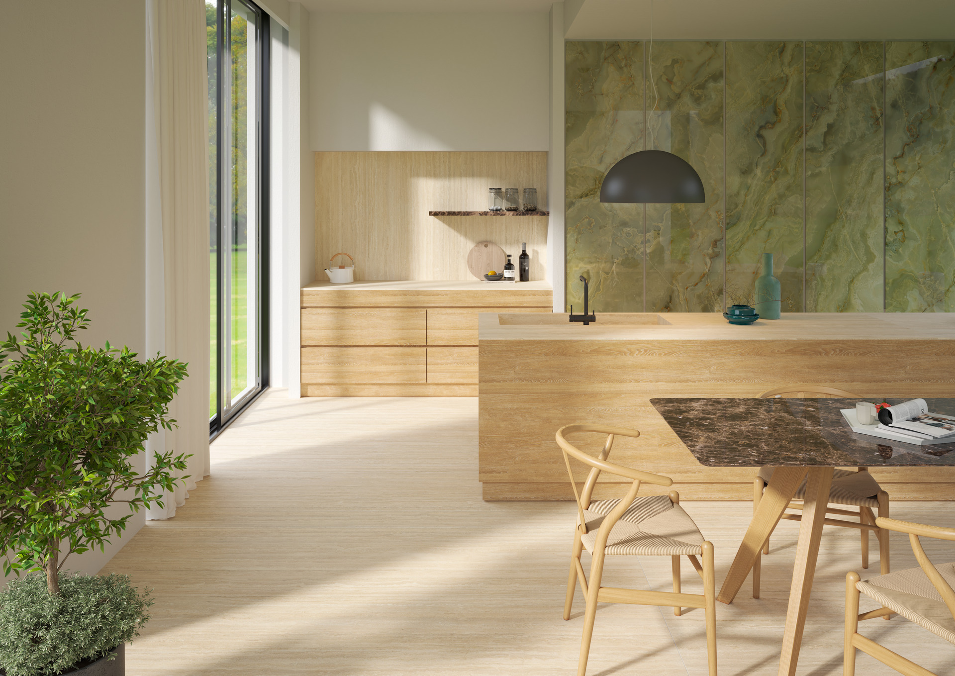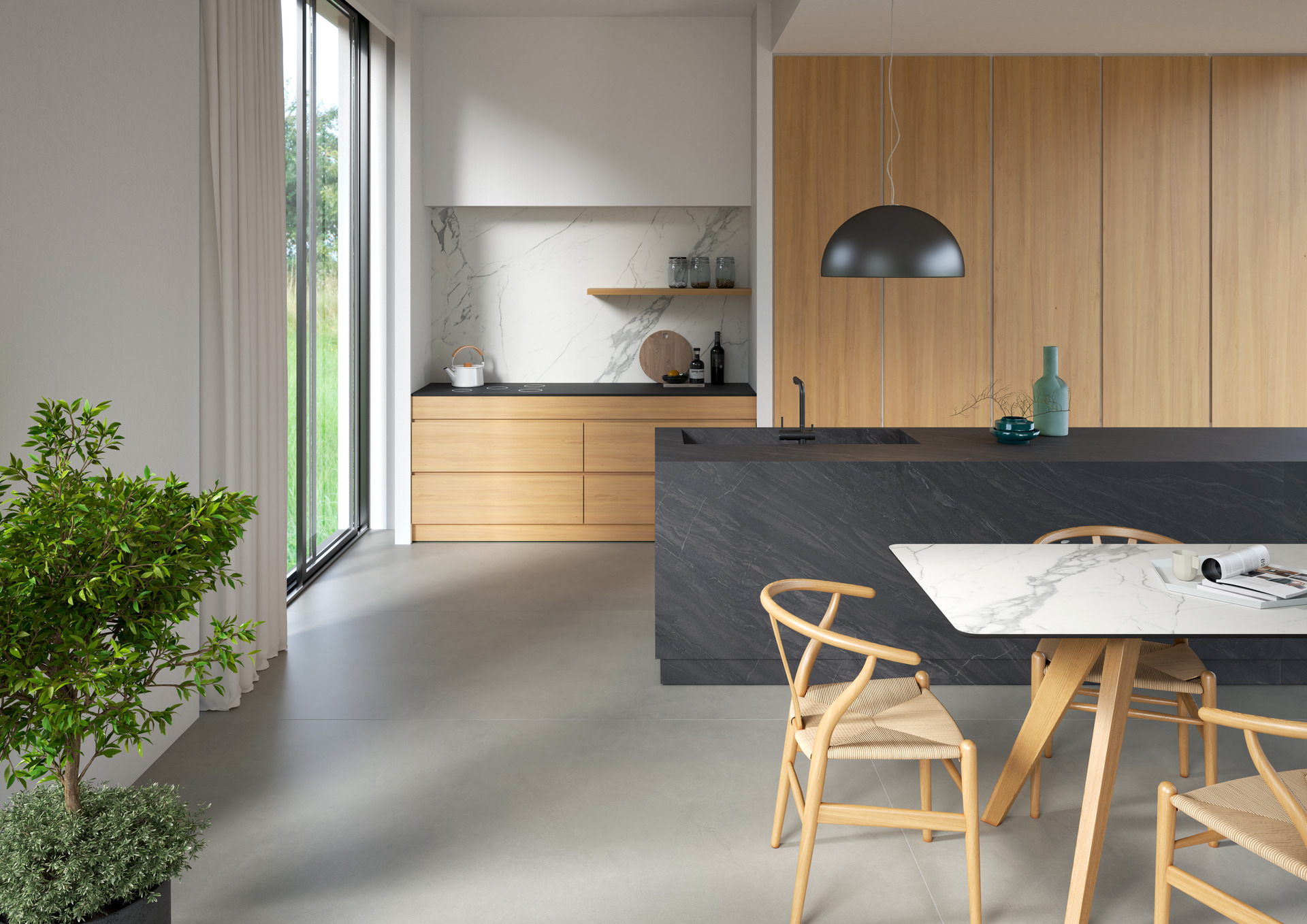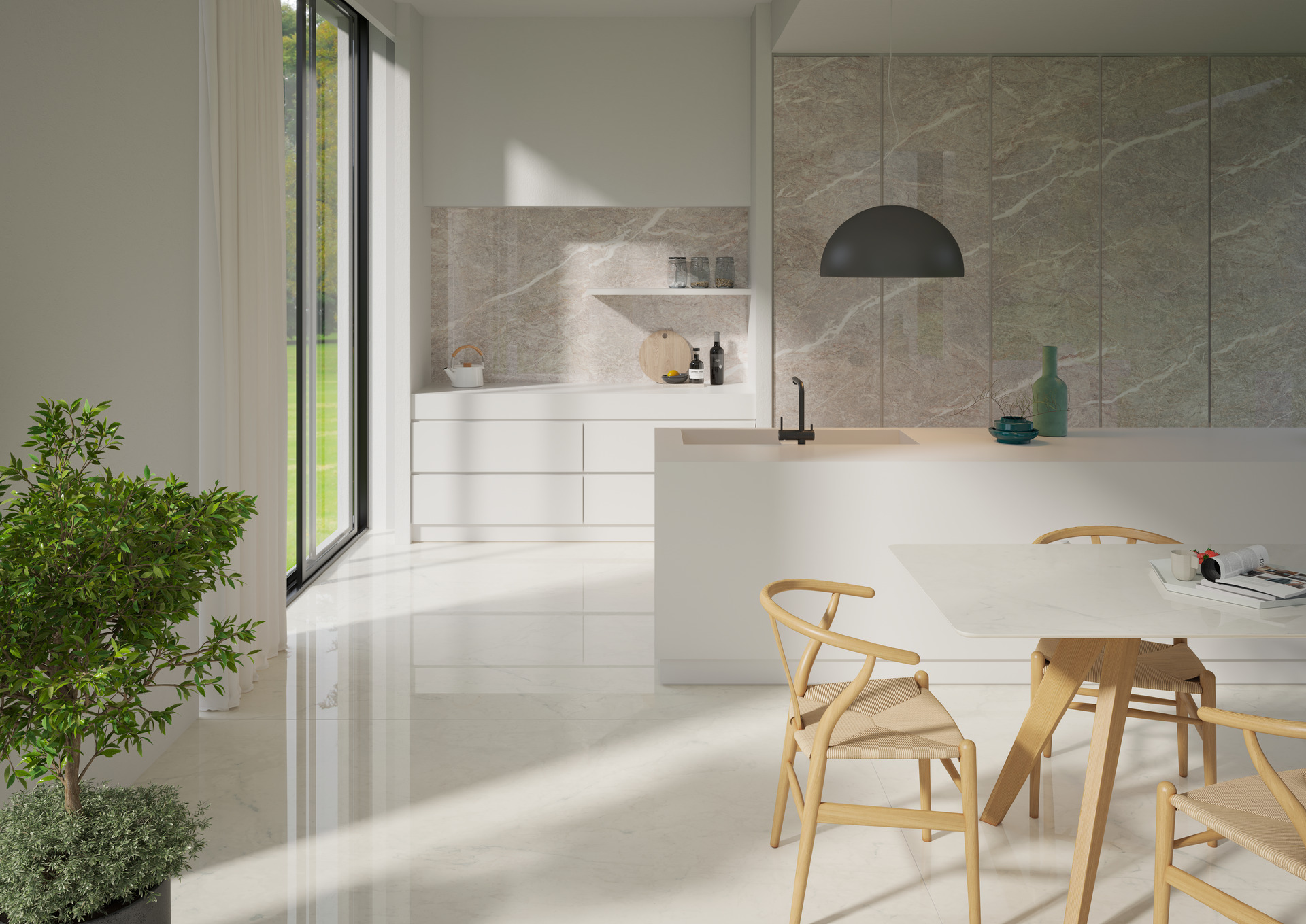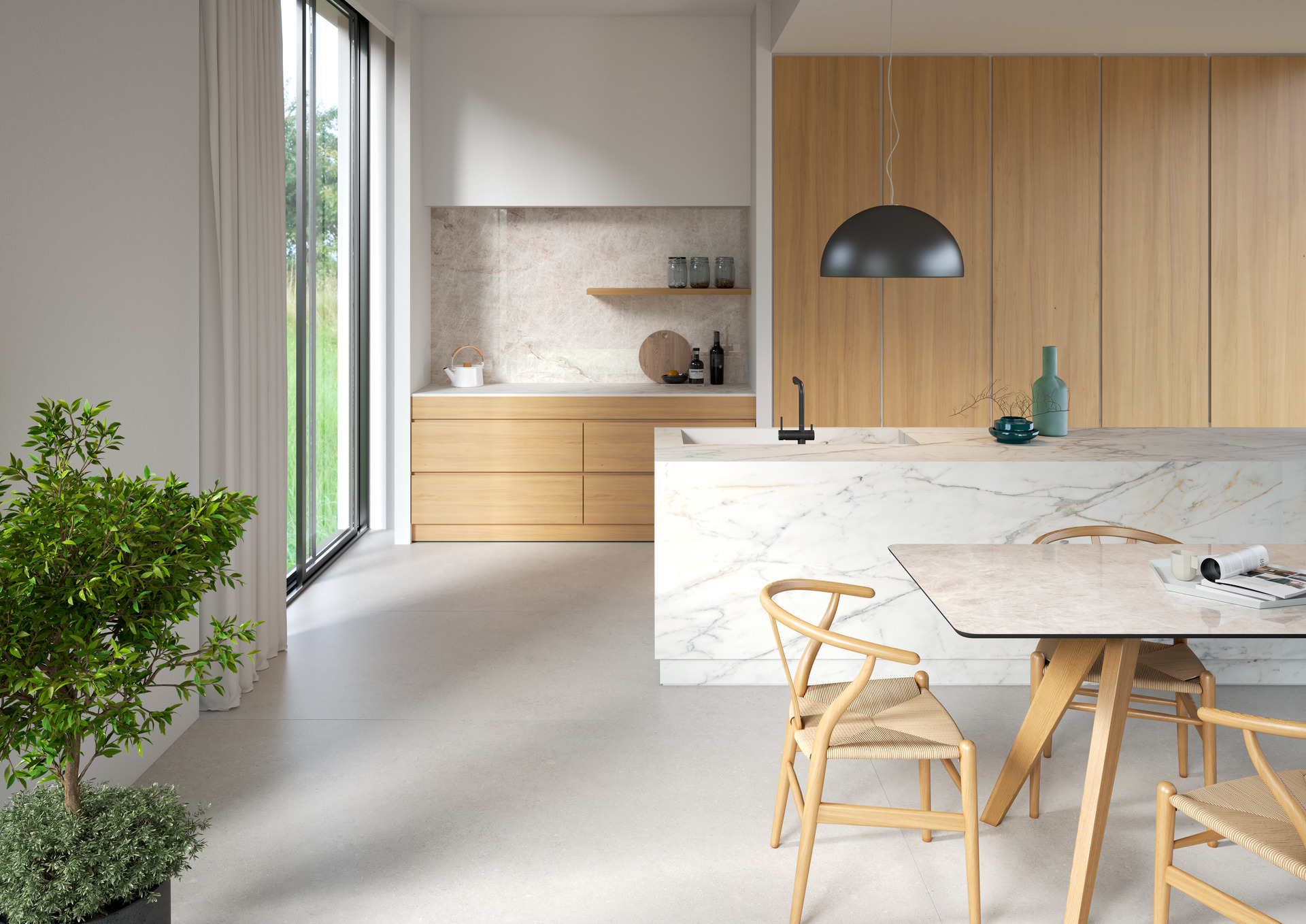 Interioare casnice cu bucătării dinamice și deschise care coexistă, se completează, în spațiul de locuit al zonei de zi. Trend născut din apartamentele urbane, care se restrâng în dimensiuni, aceste spații multifuncționale exprimă nevoia de a locui într-un mod fluid, între public și privat, între munca de acasă și viața de zi cu zi. Alegerea materialelor se concentrează pe ușurința în gestionare și pe multifuncționalitate: gresia porțelanată asigură suprafețe sigure și rezistente, chiar și în contact cu alimentele, datorită tehnologiei premium Puro Marazzi Antibacterial, ce poate fi aplicată pe scară largă de la bucătărie la elementele de living.
