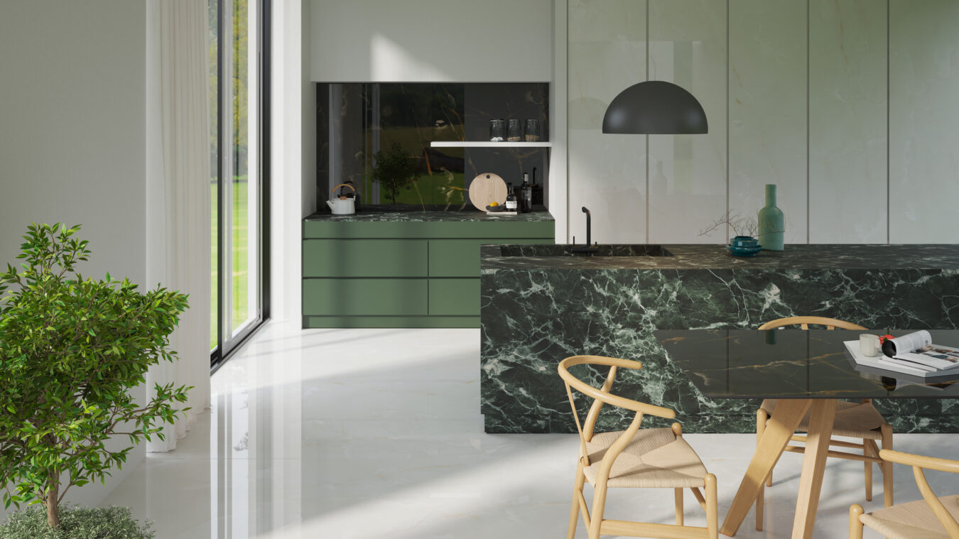 Plăcile de dimensiuni mari Marazzi The Top subliniază prezența decorativă importantă a gresiei porțelanate. Aplicabile de la blaturile de lucru la backsplash din zona de lucru, de la mese la placări verticale a mobilelor de depozitare, colecțiile permit obținerea de soluții personalizate de mobilier cu personalități multiple. De exemplu, remarcabila fidelitate a detaliilor colecției Wood Look poate fi asociată cu textura călduroasă și poroasă a travertinului sau cu nervurile desenate și estompate ale marmurilor prețioase policrome, care creează placări verticale cu un aspect vibrant. Alegerea efectelor de marmură mai tradiționale, cum ar fi Statuario sau Calacatta, permite, în schimb, aducerea tradiției în spații minimaliste și contemporane.