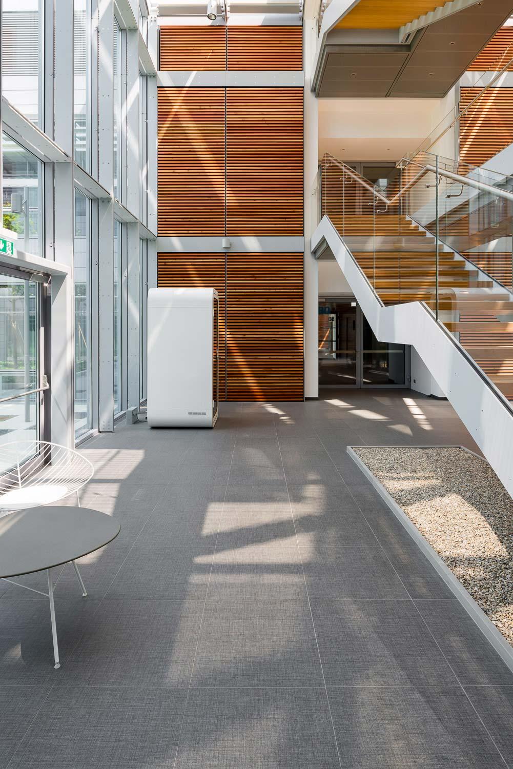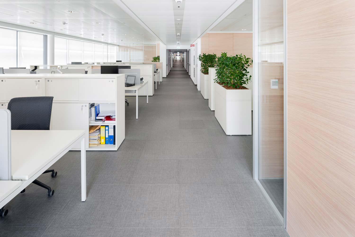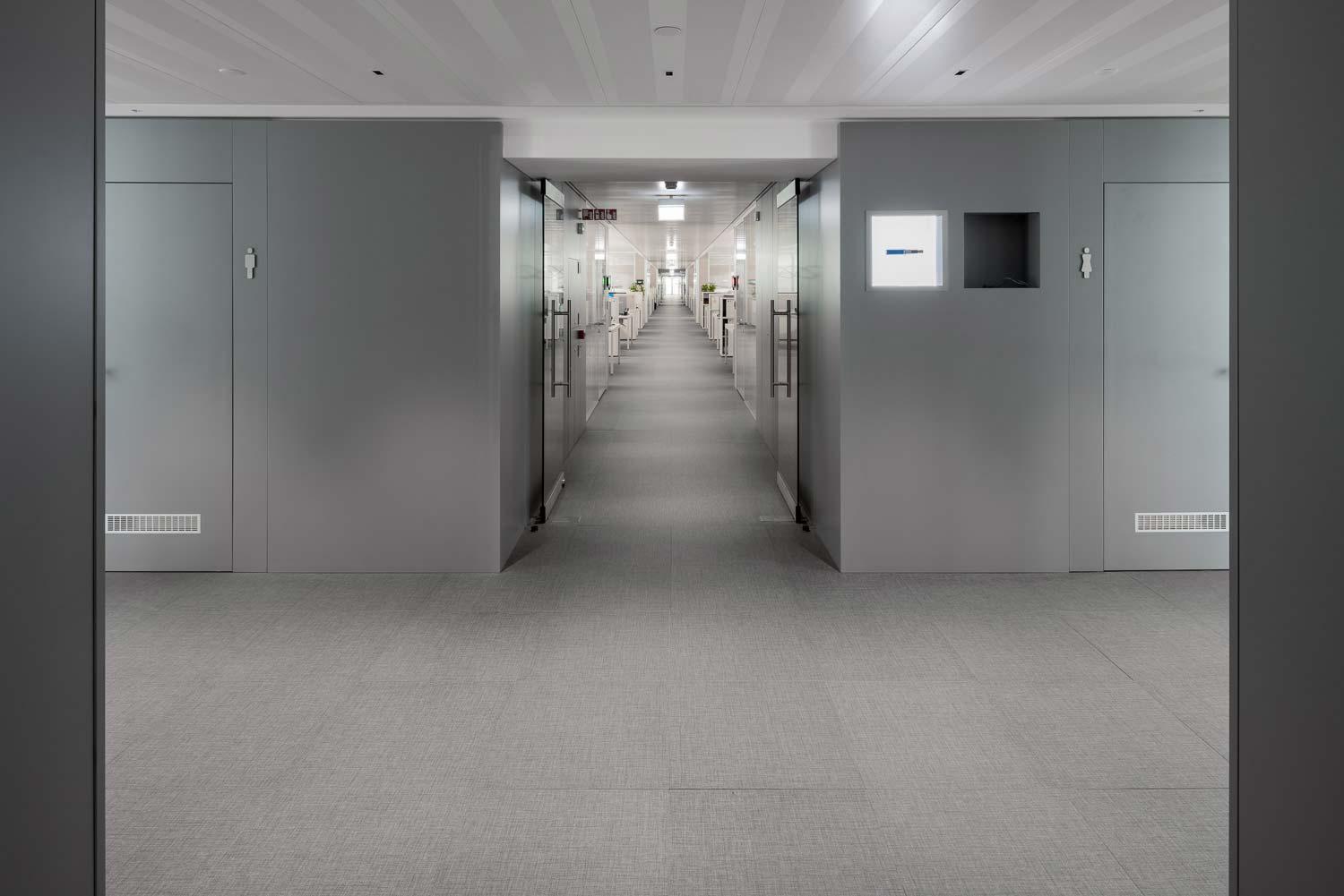 În interiorul birourilor și al spațiilor comune, pardoseala antracit în format 60×60 cm oferă, alături de albul ales pentru finisarea diferitelor piese de mobilier, un contrast de culoare eficace, dar nu foarte invaziv. Echilibrarea este oferită de griul placării care, de această dată, este aleasă în formatul 30×60 cm.
