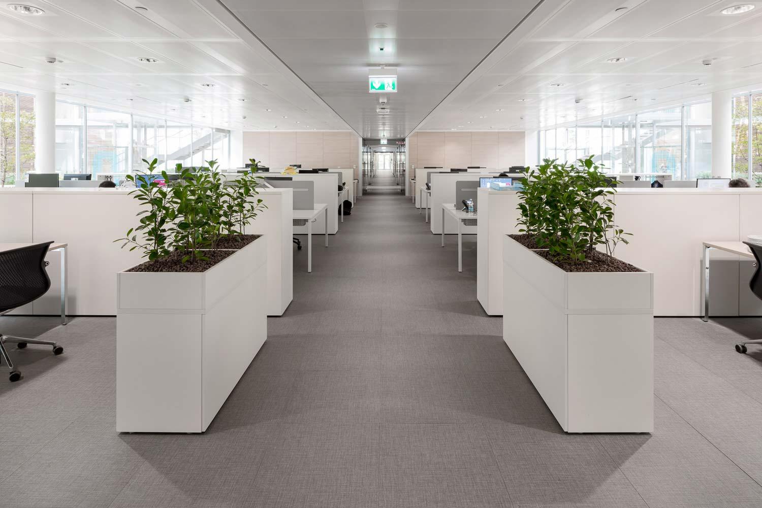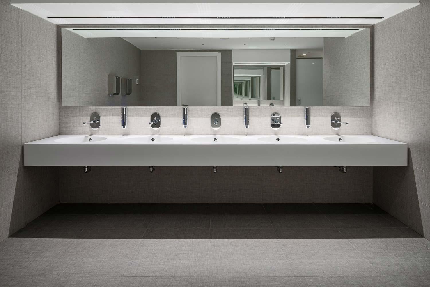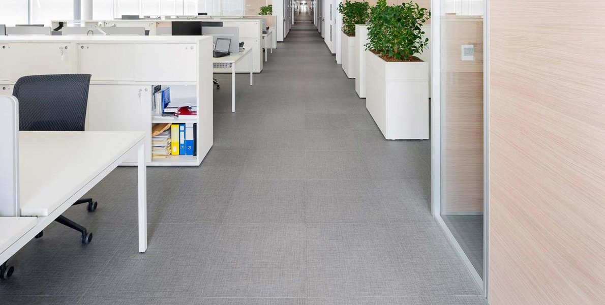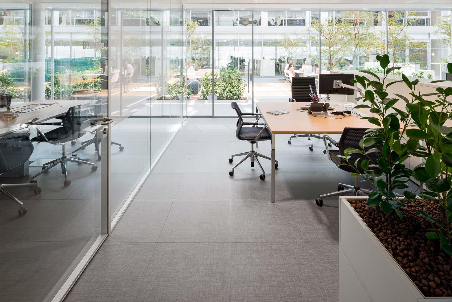 În interiorul birourilor și al spațiilor comune, pardoseala antracit în format 60×60 cm oferă, alături de albul ales pentru finisarea diferitelor piese de mobilier, un contrast de culoare eficace, dar nu foarte invaziv. Echilibrarea este oferită de griul placării care, de această dată, este aleasă în formatul 30×60 cm.