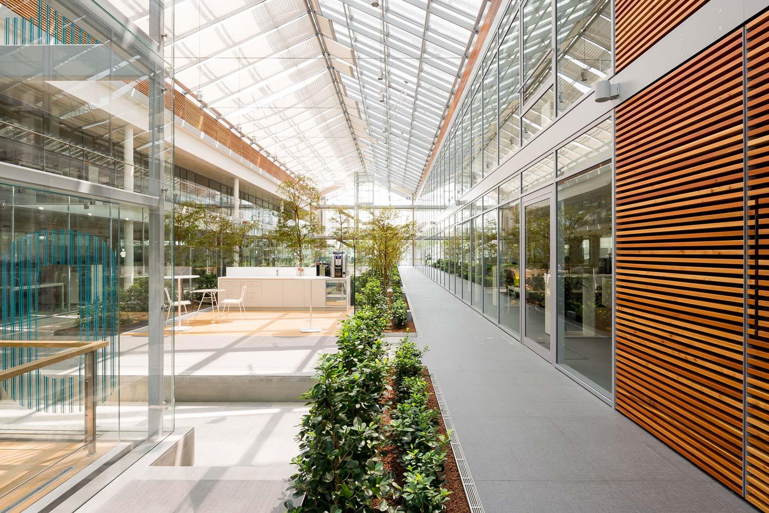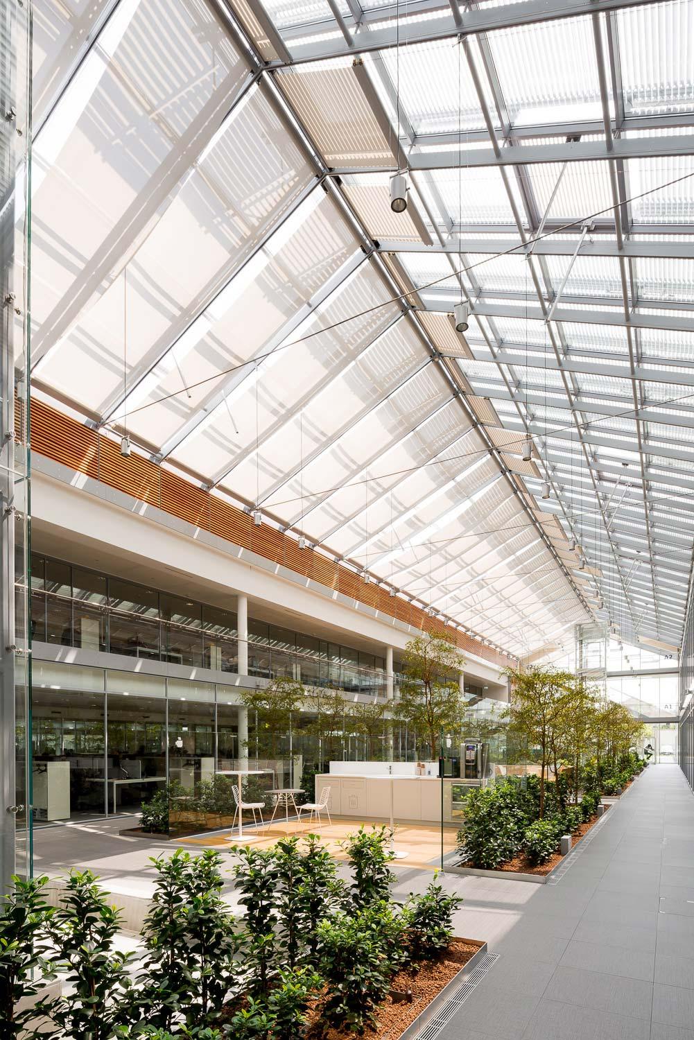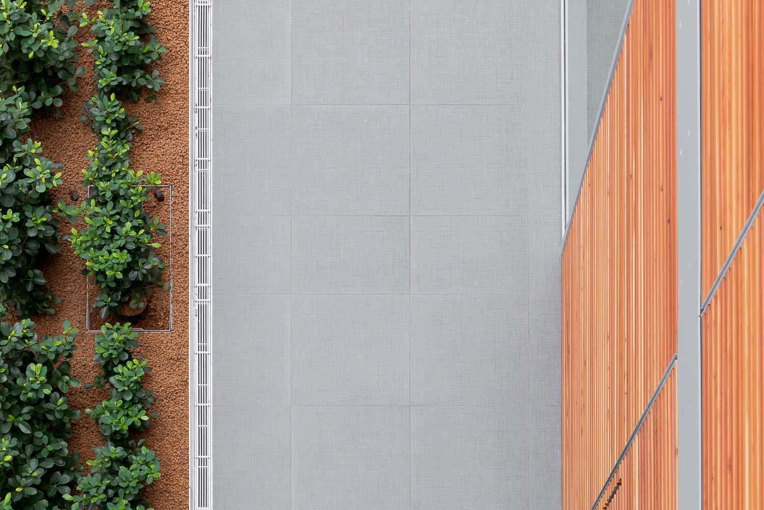În acest fel, căile de acces și locurile de parcare sunt ușor de identificat și, în același timp, beneficiază estetic de jocul de țesătură de suprafață realizată de lumina naturală provenită din amplele deschideri ale acoperișului.