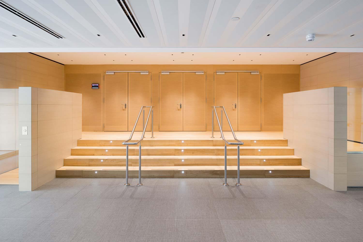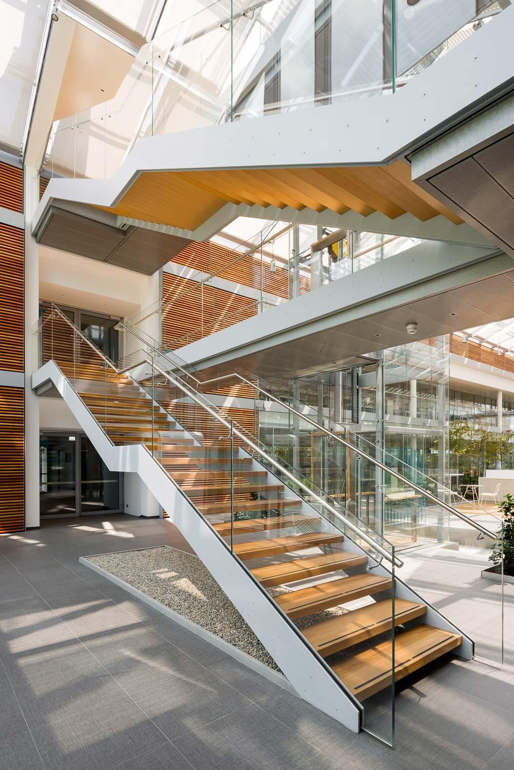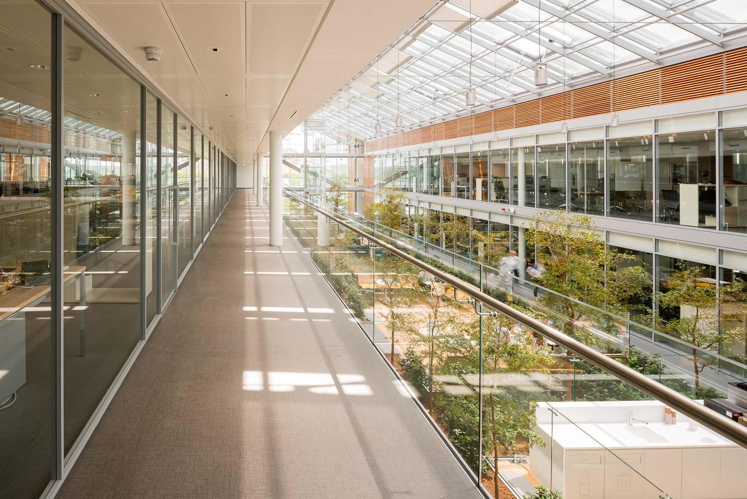 În acest fel, căile de acces și locurile de parcare sunt ușor de identificat și, în același timp, beneficiază estetic de jocul de țesătură de suprafață realizată de lumina naturală provenită din amplele deschideri ale acoperișului.