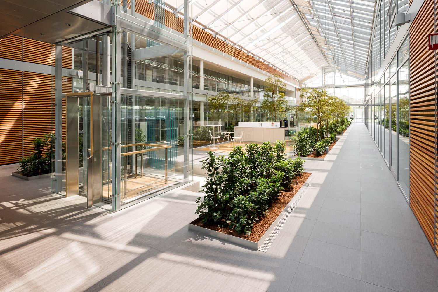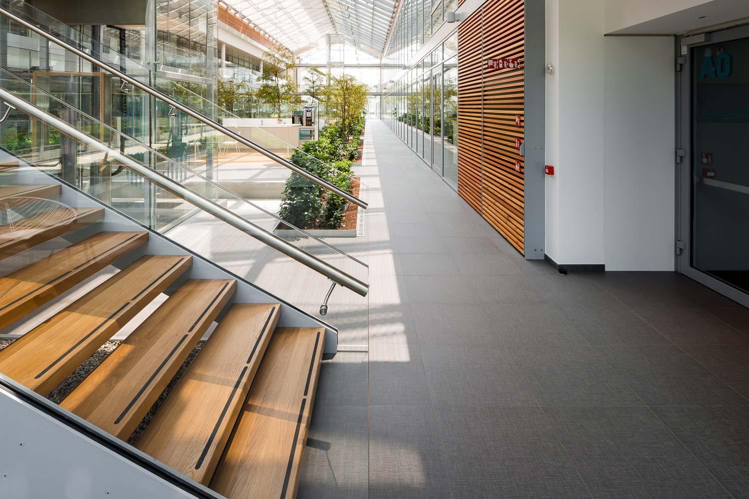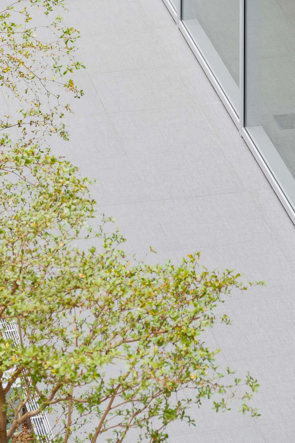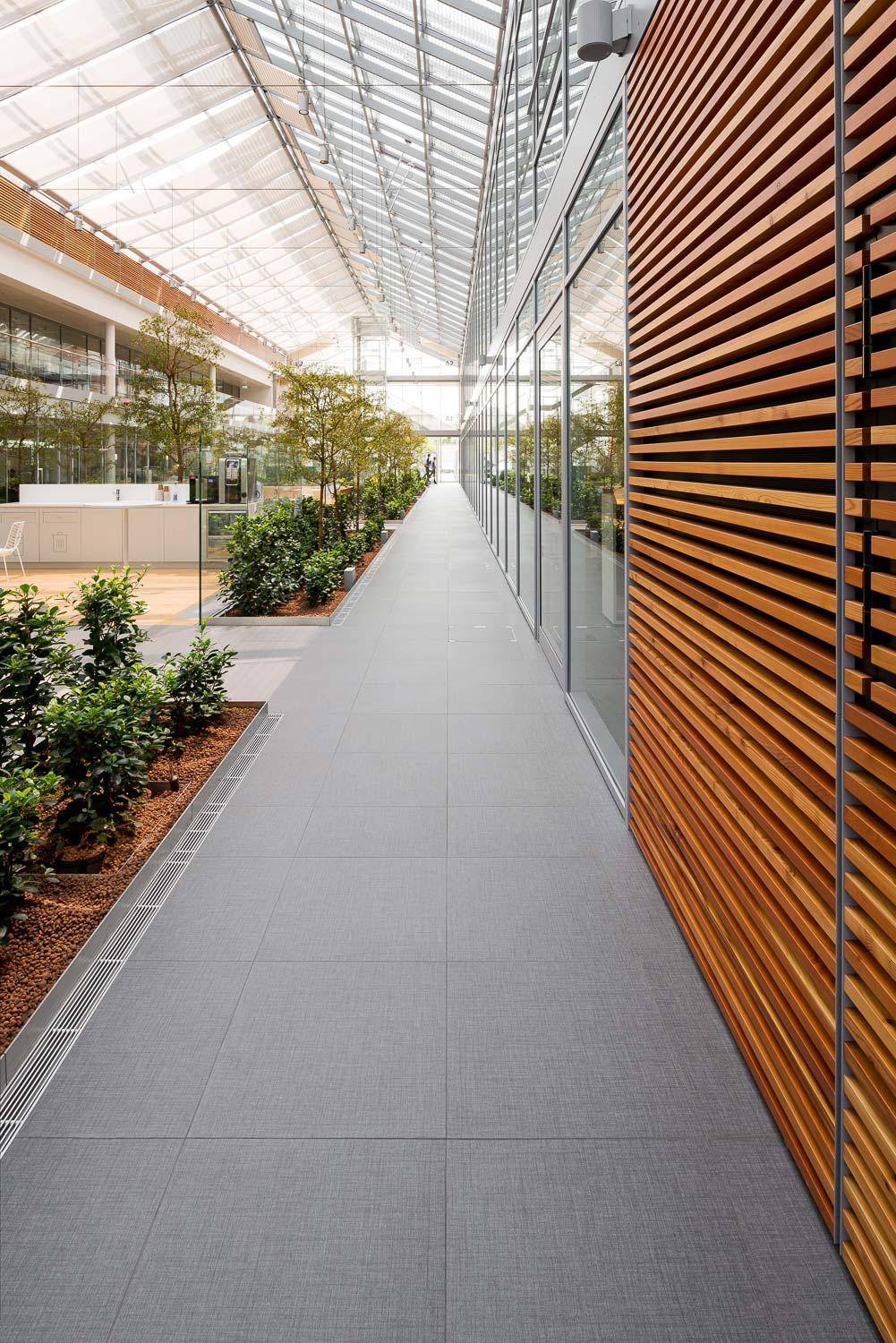 Plăcile de gresie rectificate ale unei colecții cu aspect de țesătură „personalizată” de la Marazzi, cu o textură fină și insolită, se demonstrează a fi capabile, în interiorul volumelor vitrate ale serelor, să structureze o ramă grafică interpretată într-un antracit modern în jurul suprafețelor verzi sau tratate cu pardoseală din parchet.
