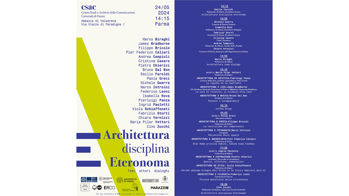 Arhitectura aspiră să reprezinte viitorul, prezentul și trecutul unei colectivități. Este o disciplină care, prin natura sa, cuprinde și se inspiră din numeroase alte discipline și care se reflectă în spațiul construit. De la această premisă pornește conferința „Architettura disciplina eteronoma“ (Arhitectura, disciplină heteronomă), care va avea loc vineri, 24 mai, începând cu ora 14:15, la CSAC, Centrul de Studii și Arhivă a Comunicării de la Universitatea de Studii din Parma.