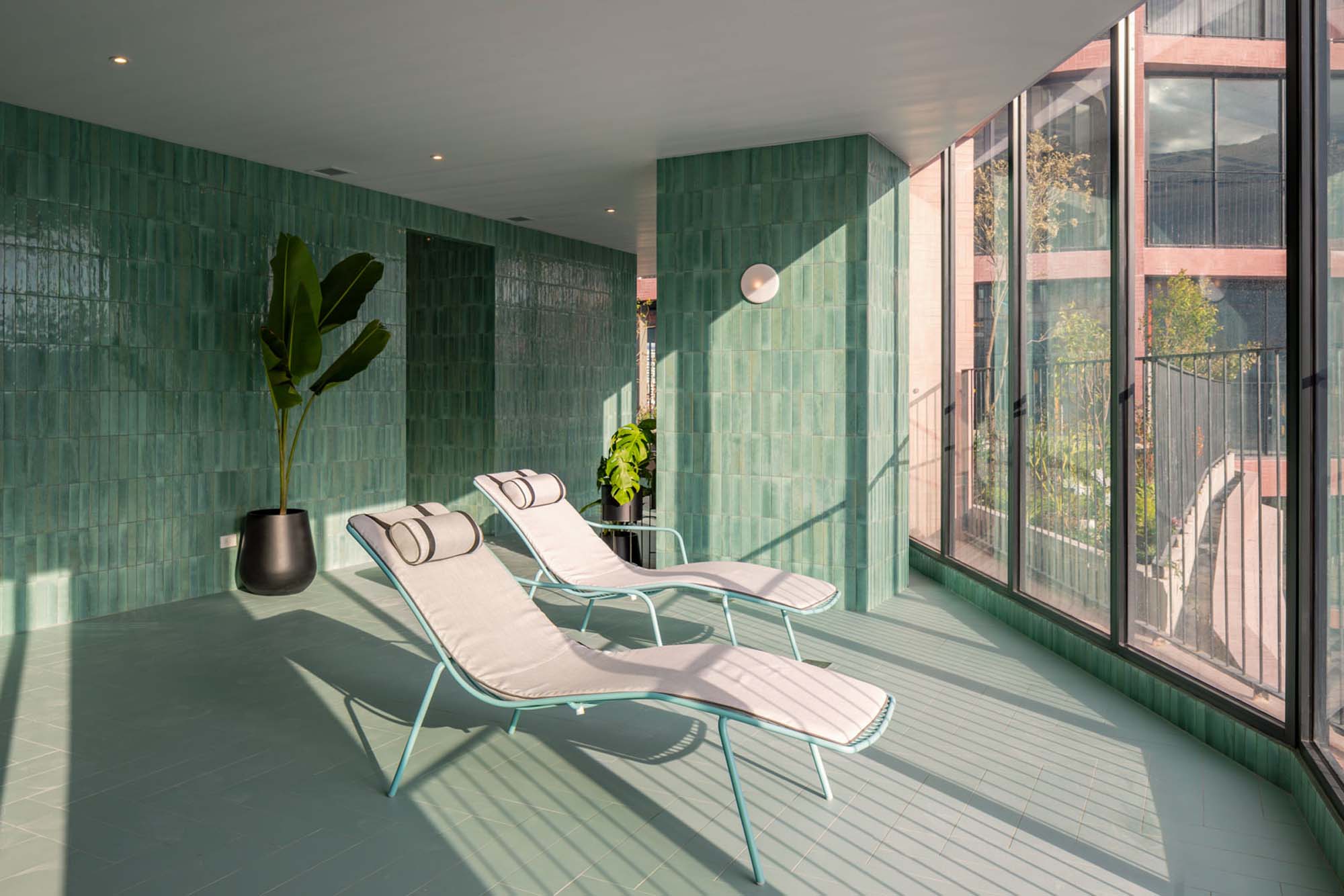O concesie ulterioară făcută bunăstării este zona de spa din interiorul turnului rezidențial, acoperită cu plăcuțe de gresie porțelanată super lucioasă tip majolică din seria Crogiolo Lume de culoare Turquoise. Și în acest caz culoarea strălucitoare și estetica „lucrat manual” revin pentru a vorbi despre tradiția, chiar și locală, a ceramicii și despre culorile strălucitoare ale caselor istorice ecuadoriene.
