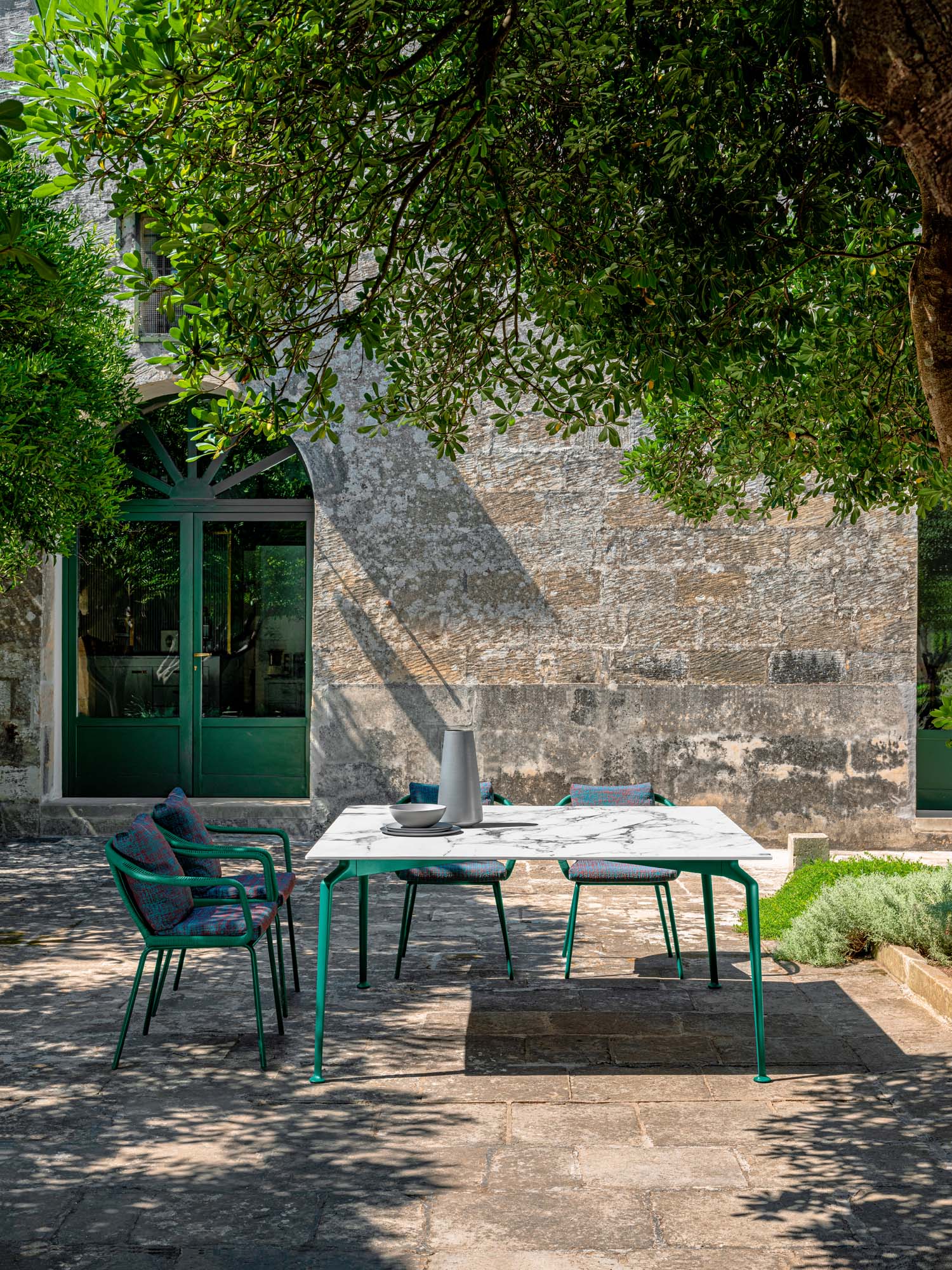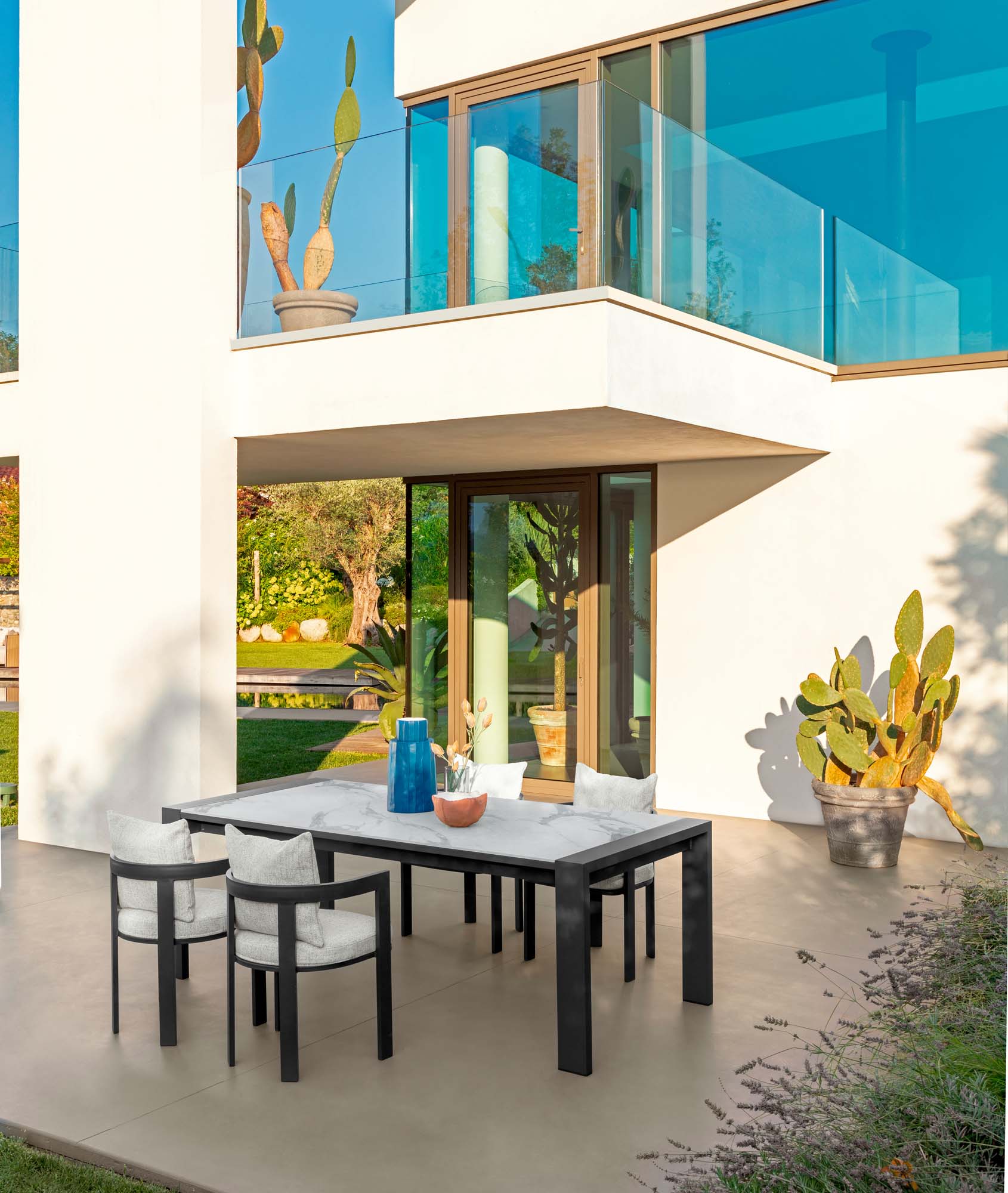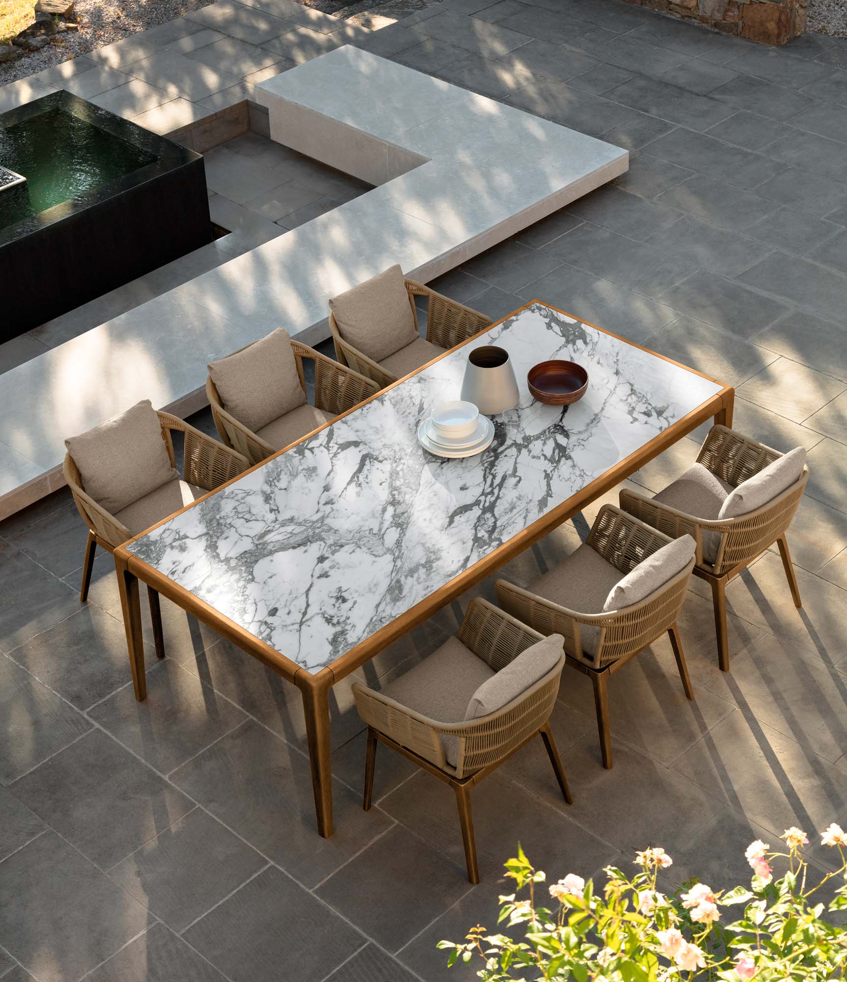 Rezistența la factorii atmosferici și durabilitatea sunt caracteristici indispensabile. De aceea, o mare parte din producția noastră se concentrează pe materiale ușor reciclabile. Pe lângă lemnele precum tecul certificat FSC și Accoya, acesta din urmă fiind o esență moale de creștere rapidă și tratată printr-un proces lipsit de toxicitate, folosim aluminiul, versatil și reciclabil la infinit, oțelul, extrem de rezistent la coroziune, și cimentul lucrat prin tehnici meșteșugărești. Pentru blaturile meselor noastre, alegerea cade pe materii prime eco-friendly, capabile să reziste nu doar la ploaie și șocuri termice, ci și ușor de întreținut. Gresia porțelanată este de nelipsit, fiind prezentă în 70% din colecțiile noastre și, datorită versatilității sale, oferă o gamă largă de finisaje. Următoarele în listă sunt VittEr, laminat compact produs fără utilizarea formaldehidei, și pietrele naturale și lavica, ultima având un finisaj extra lucios datorită procesului de ceramicizare a sticlei reciclate și topite.