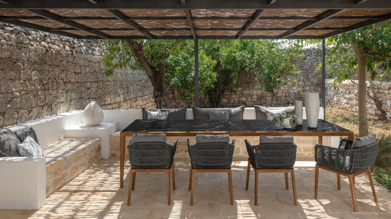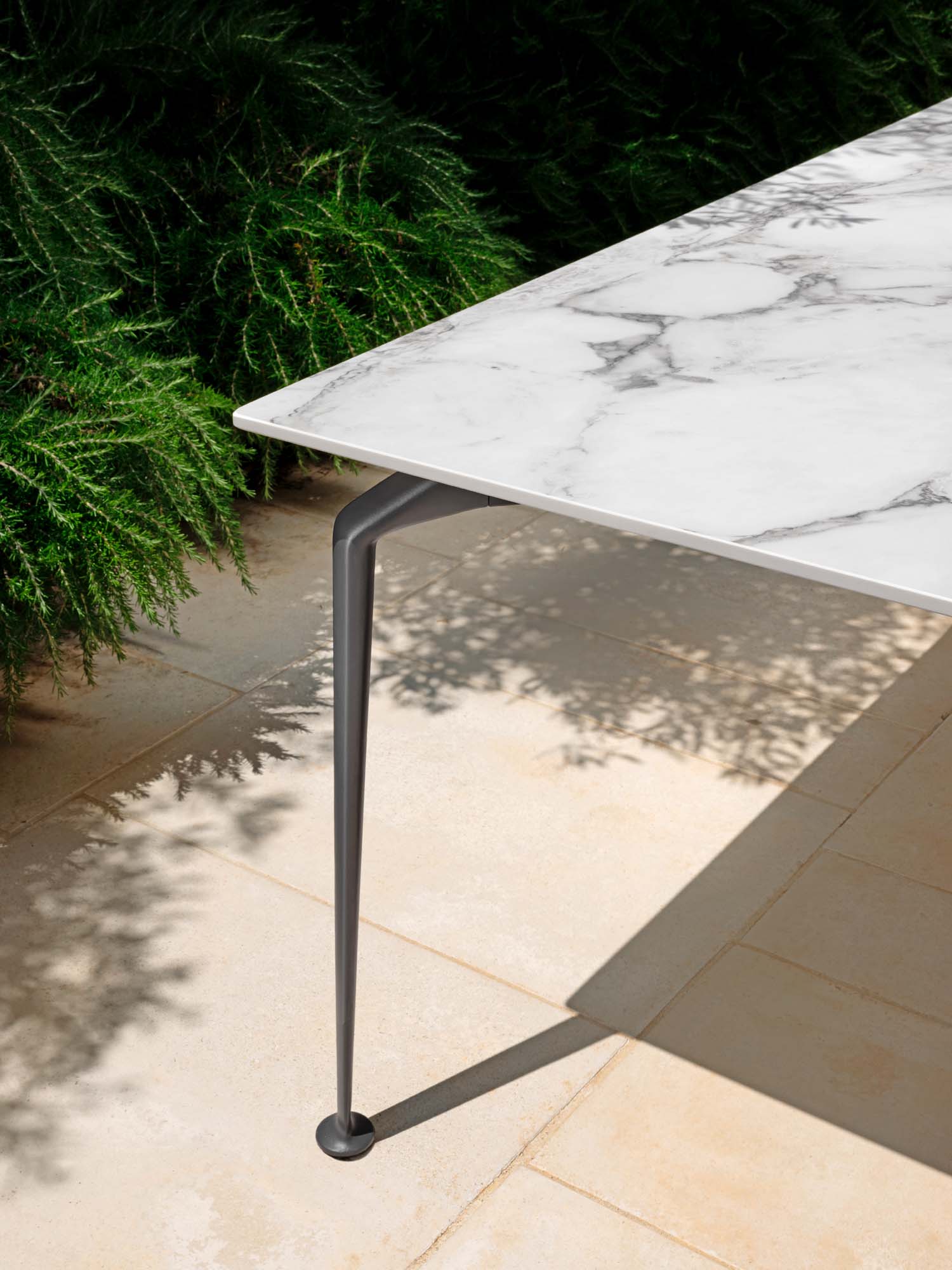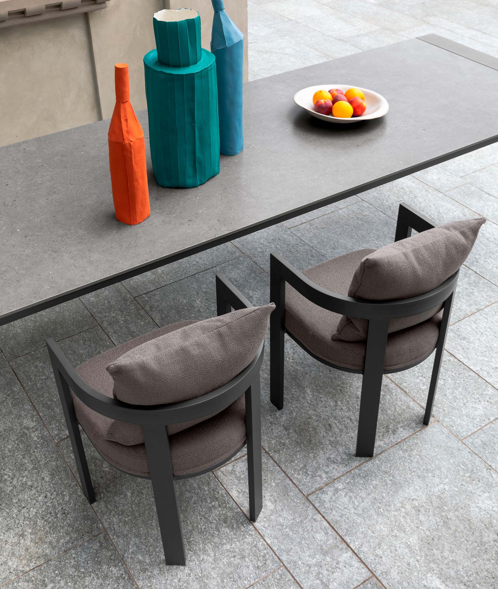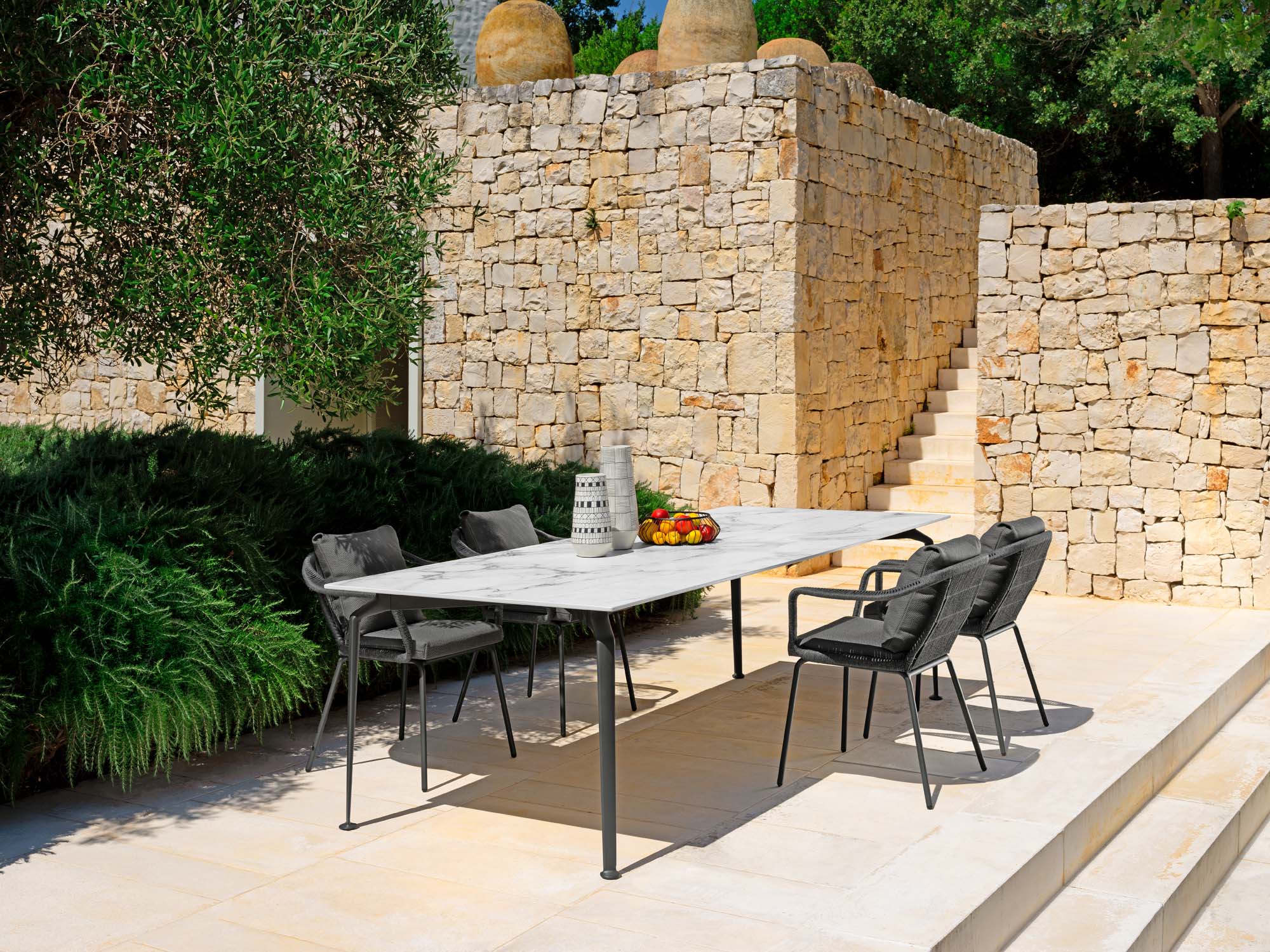 Rezistența la factorii atmosferici și durabilitatea sunt caracteristici indispensabile. De aceea, o mare parte din producția noastră se concentrează pe materiale ușor reciclabile. Pe lângă lemnele precum tecul certificat FSC și Accoya, acesta din urmă fiind o esență moale de creștere rapidă și tratată printr-un proces lipsit de toxicitate, folosim aluminiul, versatil și reciclabil la infinit, oțelul, extrem de rezistent la coroziune, și cimentul lucrat prin tehnici meșteșugărești. Pentru blaturile meselor noastre, alegerea cade pe materii prime eco-friendly, capabile să reziste nu doar la ploaie și șocuri termice, ci și ușor de întreținut. Gresia porțelanată este de nelipsit, fiind prezentă în 70% din colecțiile noastre și, datorită versatilității sale, oferă o gamă largă de finisaje. Următoarele în listă sunt VittEr, laminat compact produs fără utilizarea formaldehidei, și pietrele naturale și lavica, ultima având un finisaj extra lucios datorită procesului de ceramicizare a sticlei reciclate și topite.