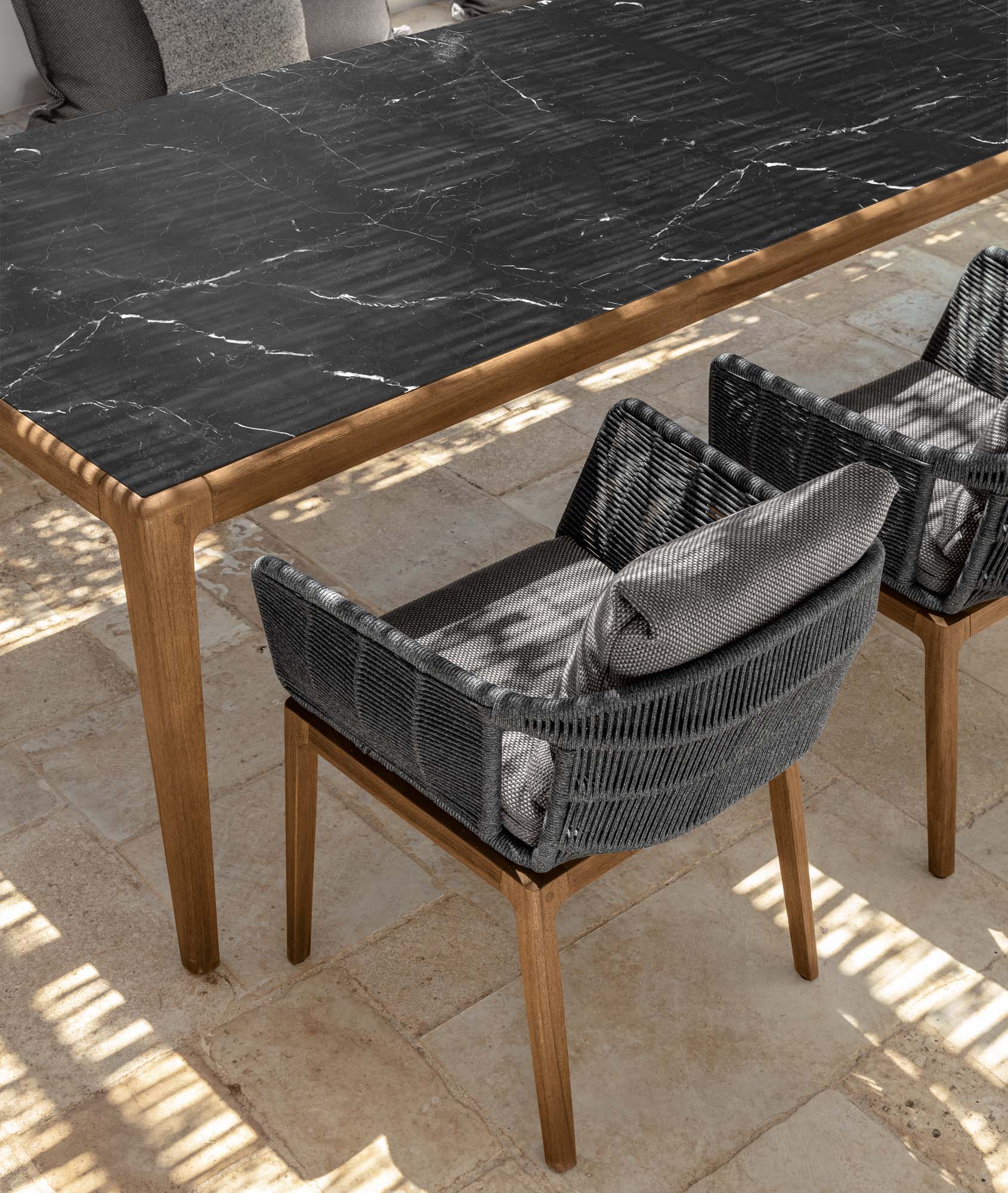Probabil că este masa Cruise Teak de 320×120 cm, unde blatul în finisajul The Top Marble Look Capraia sau Elegant Black contrastează perfect cu structura din Smoke Teak. Este unul dintre cele mai elegante produse, unde se evidențiază know-how-ul societății în ceea ce privește artizanatul și atenția la detalii. O piesă în care placa de gresie cu siguranță joacă un rol principal.