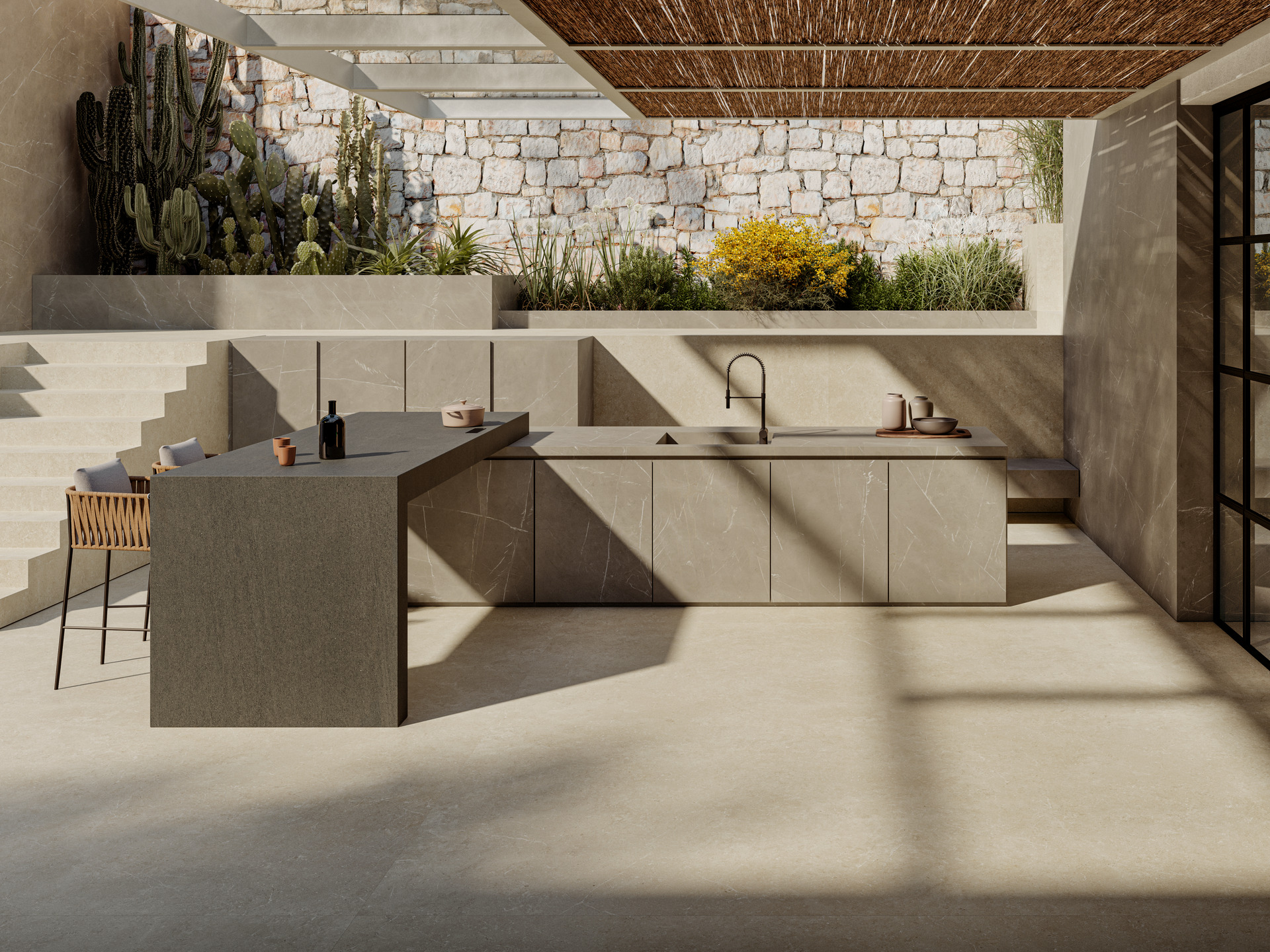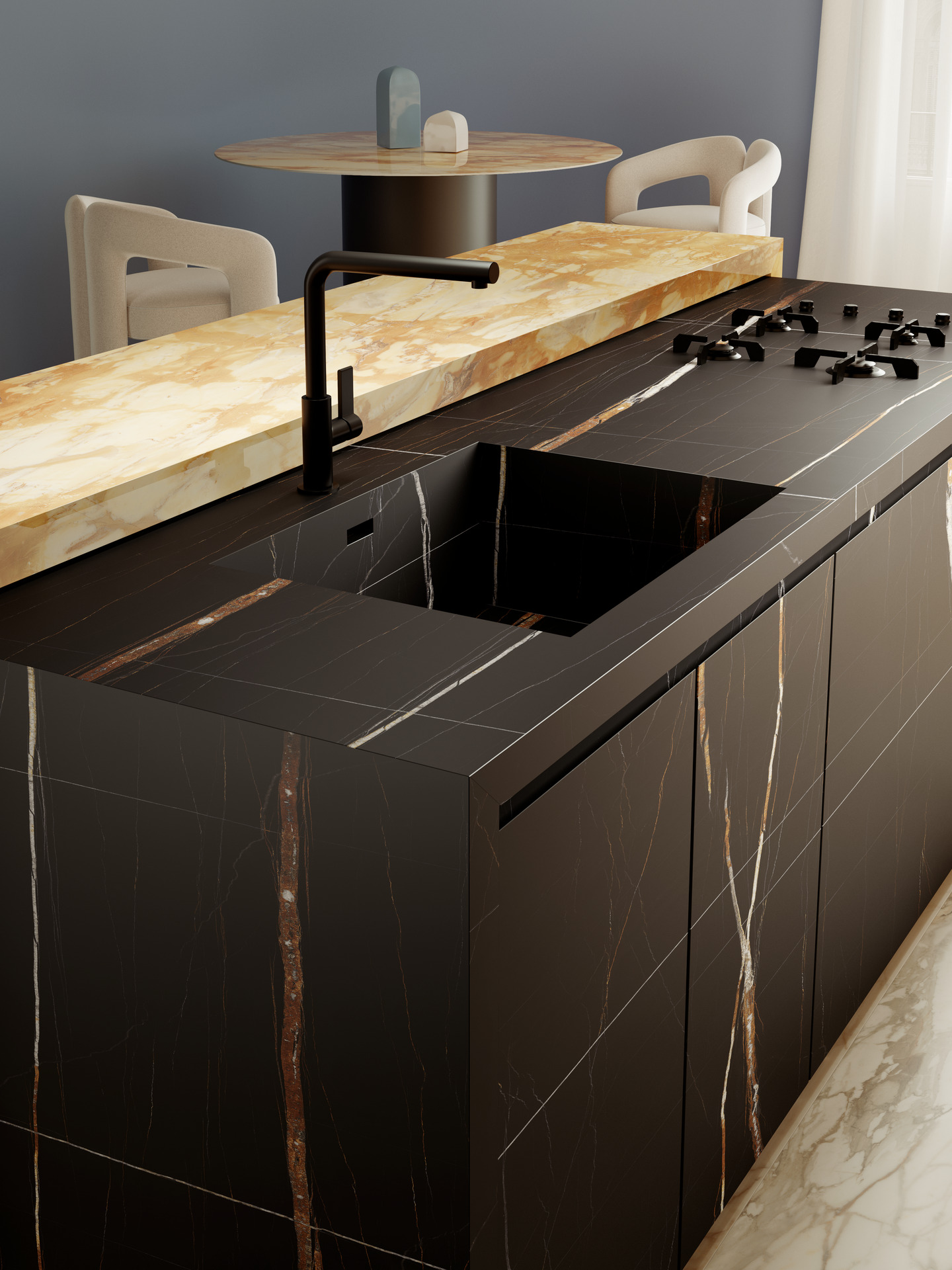Plăci mari de gresie porțelanată ce pot fi asociate în continuitate sau în contrast. Marazzi The Top este un instrument folosit pentru proiectarea și realizarea de blaturi de lucru pentru bucătărie, backsplash, mese, placări verticale sau piese de mobilier folosind în mod personalizat materiale high tech cu diferite funcții. Catalogul vast al gamei The Top, ce cuprinde suprafețe cu aspect de marmură, ciment, piatră, metal și culori compacte, permite crearea unui dialog material între spații și elementele de arhitectură, cum ar fi între living și bucătărie, inclusiv datorită proprietăților antibacteriene ce sporesc nivelul de igienă al suprafețelor ce intră în contact cu alimentele.