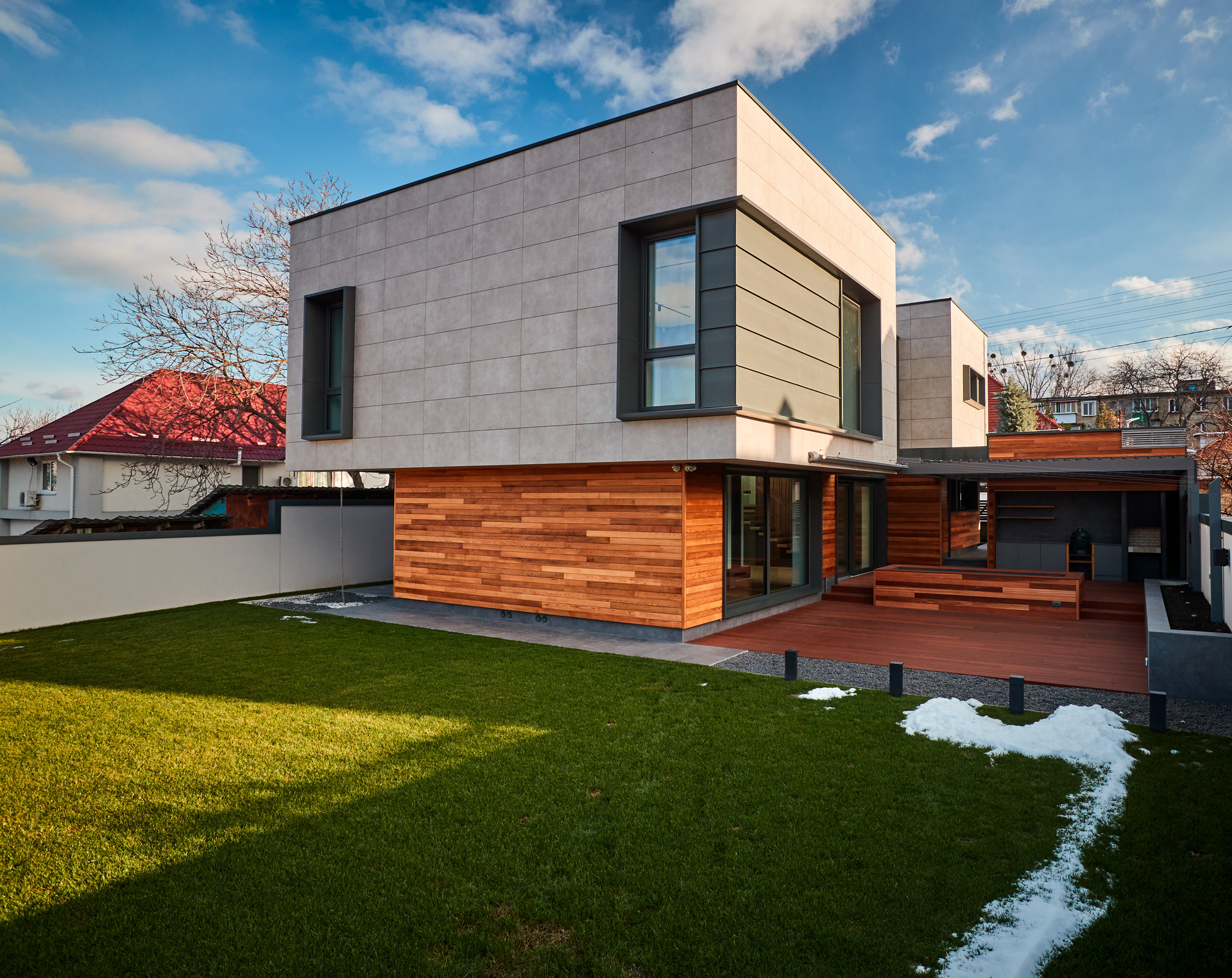- În fine, placarea exterioară, care poate fi realizată cu diferite materiale, este elementul care determină aspectul estetic, variind între multiple stiluri și tipologii.