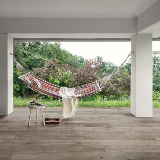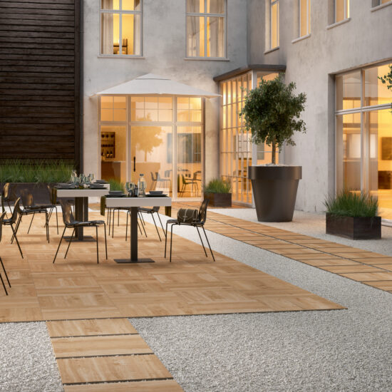 Cald și perfect pentru a conferi atmosfere confortabile verandelor, teraselor și grădinilor, gresia porțelanată cu aspect de lemn poate fi așezată și în exterior: trebuie doar să alegeți plăci special concepute pentru acest tip de așezare.