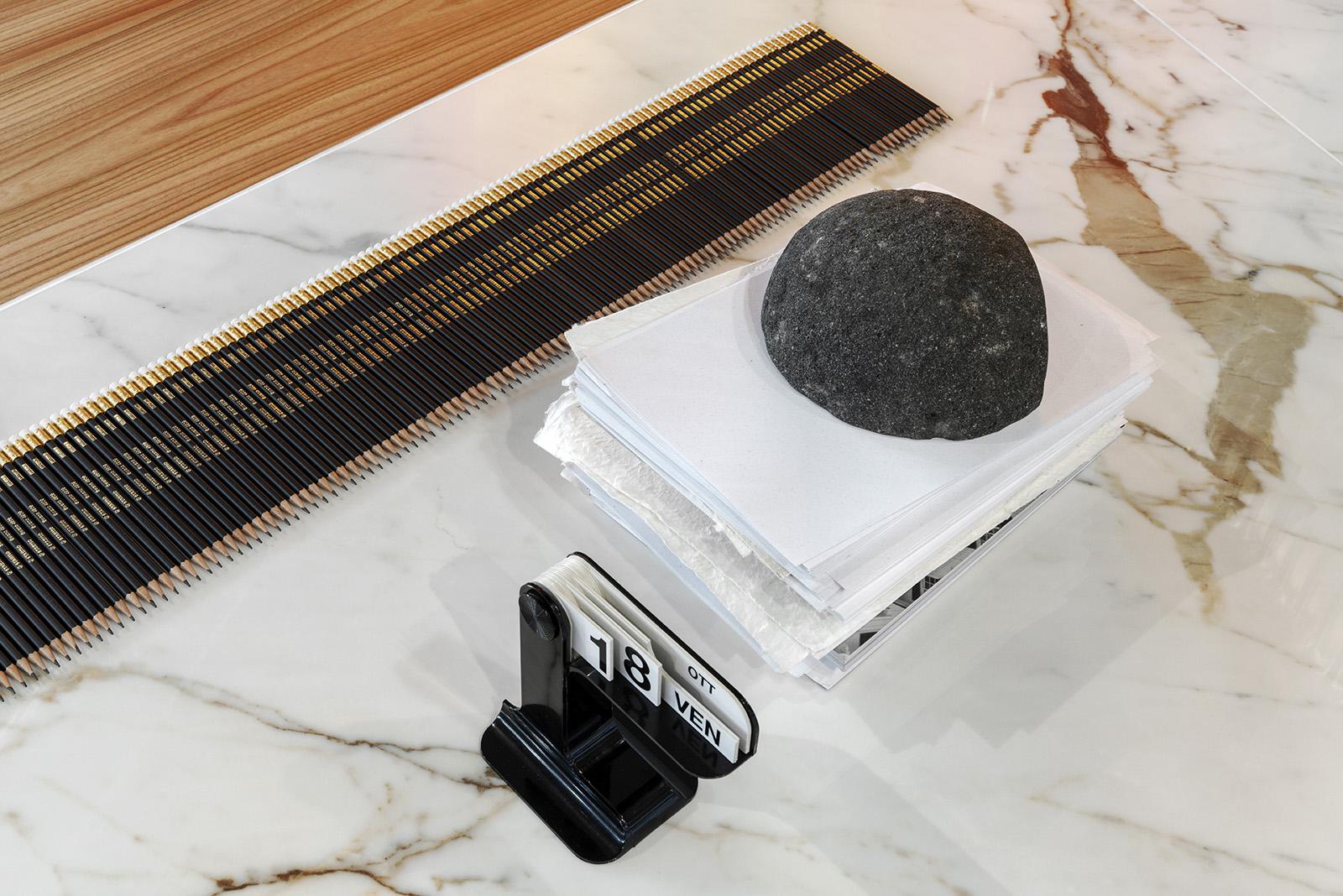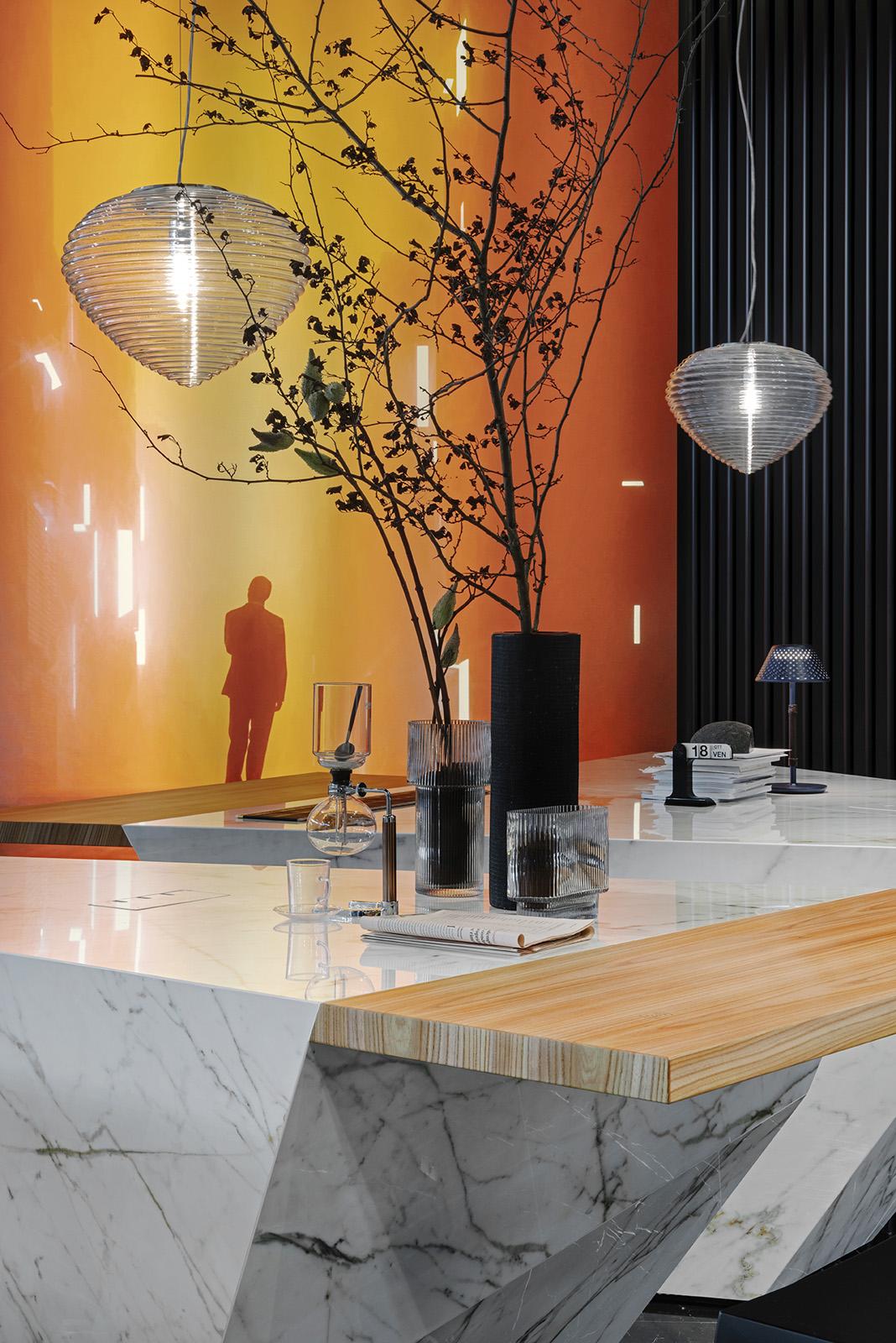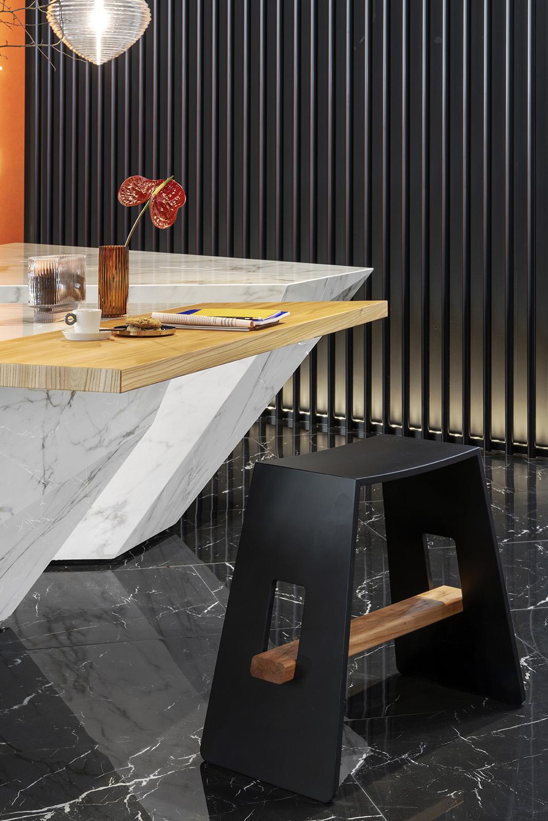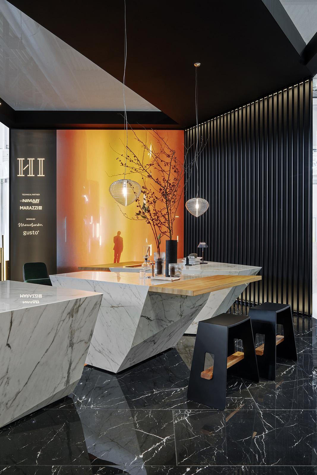 Un birou de dimensiuni ample și cu aspect puternic sculptural, poziționat în centrul standului, a eradicat ideea de „în față și în spate”, tipică zonei destinate recepției, pentru a se concentra pe „centru, împrejur”. Un blat multifuncțional permite și organizarea unui spațiu pentru bar și degustări. Toate suprafețele au fost acoperite cu plăci de gresie porțelanată Marazzi, cu finisajele Allmarble Elegant Black și Grande Marble Look Golden White; aspectul de marmură secondează coerența estetică și spațială, permițând soluții personalizate infinite.