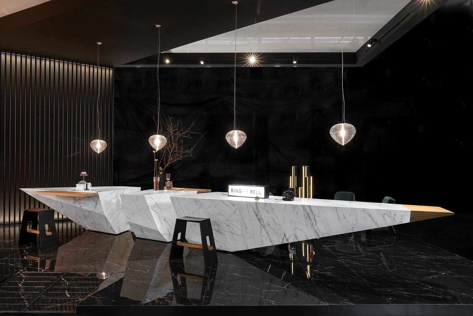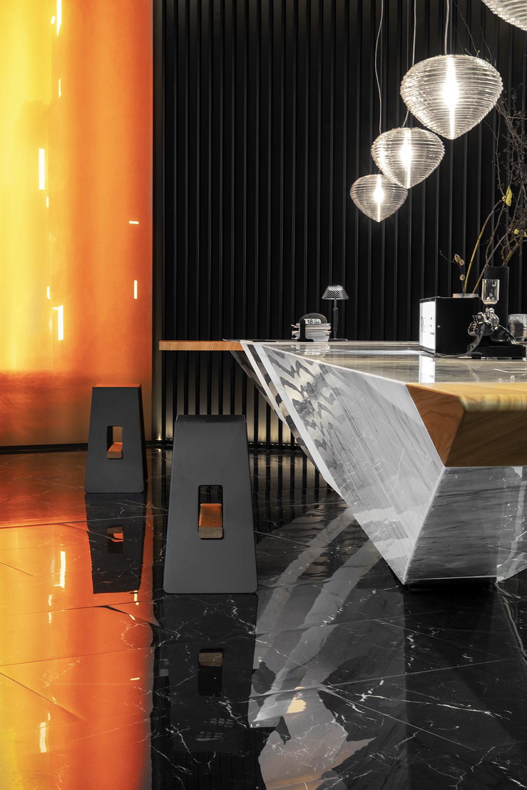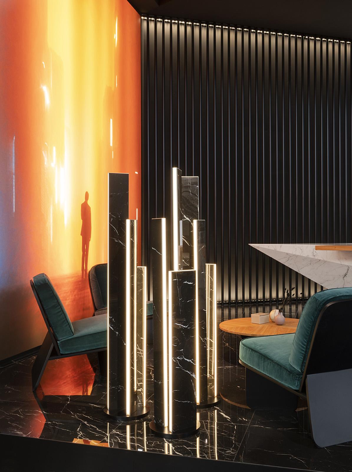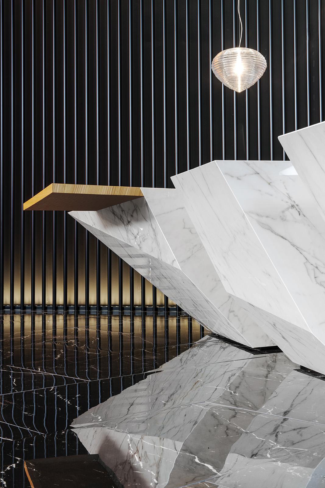 Instalația, semnată de Marco Acerbis și acoperită de o suprafață continuă cu finisajele Allmarble Elegant Black și Grande Marble Look Golden White, a pus în scenă un concept spațial care reflectă asupra vocației publice și private ale recepțiilor hoteliere