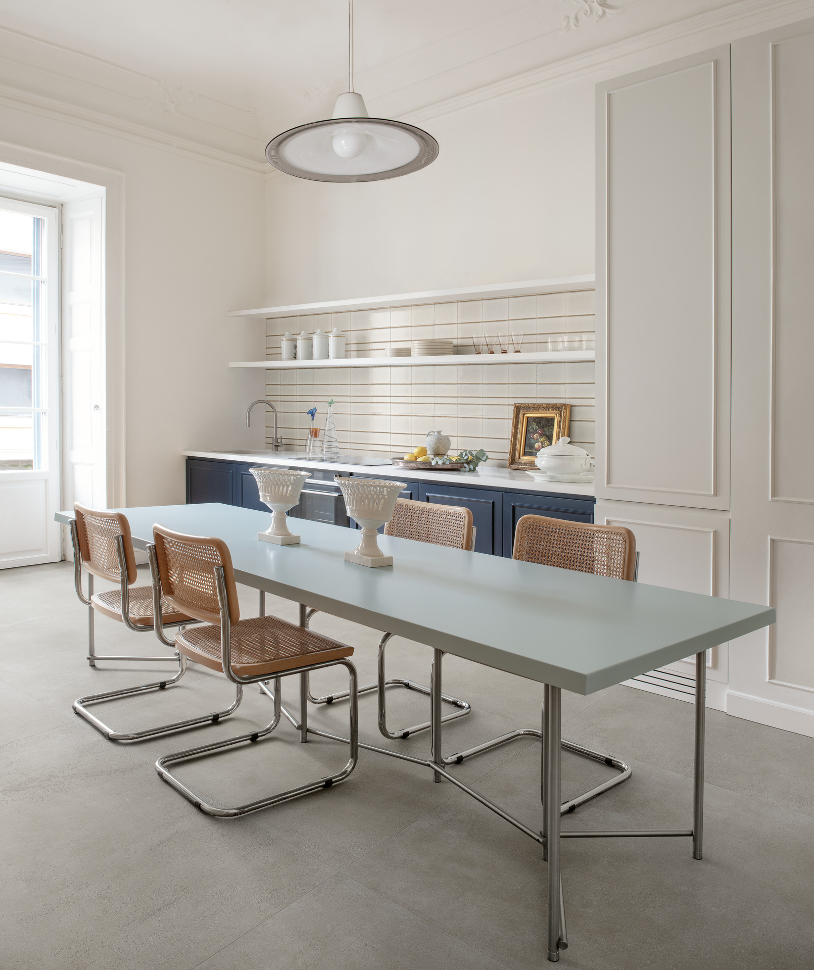 Un truc eficient constă în integrarea pardoselilor și pereților cu aceeași colecție ceramică, jucându-te cu diferite formate sau finisaje pentru a delimita vizual cele două zone. De exemplu, poți alege un gres cu efect de ciment sau efect de rășină pentru pardoseală, menținând același material pe peretele bucătăriei cu un decor ton pe ton.
