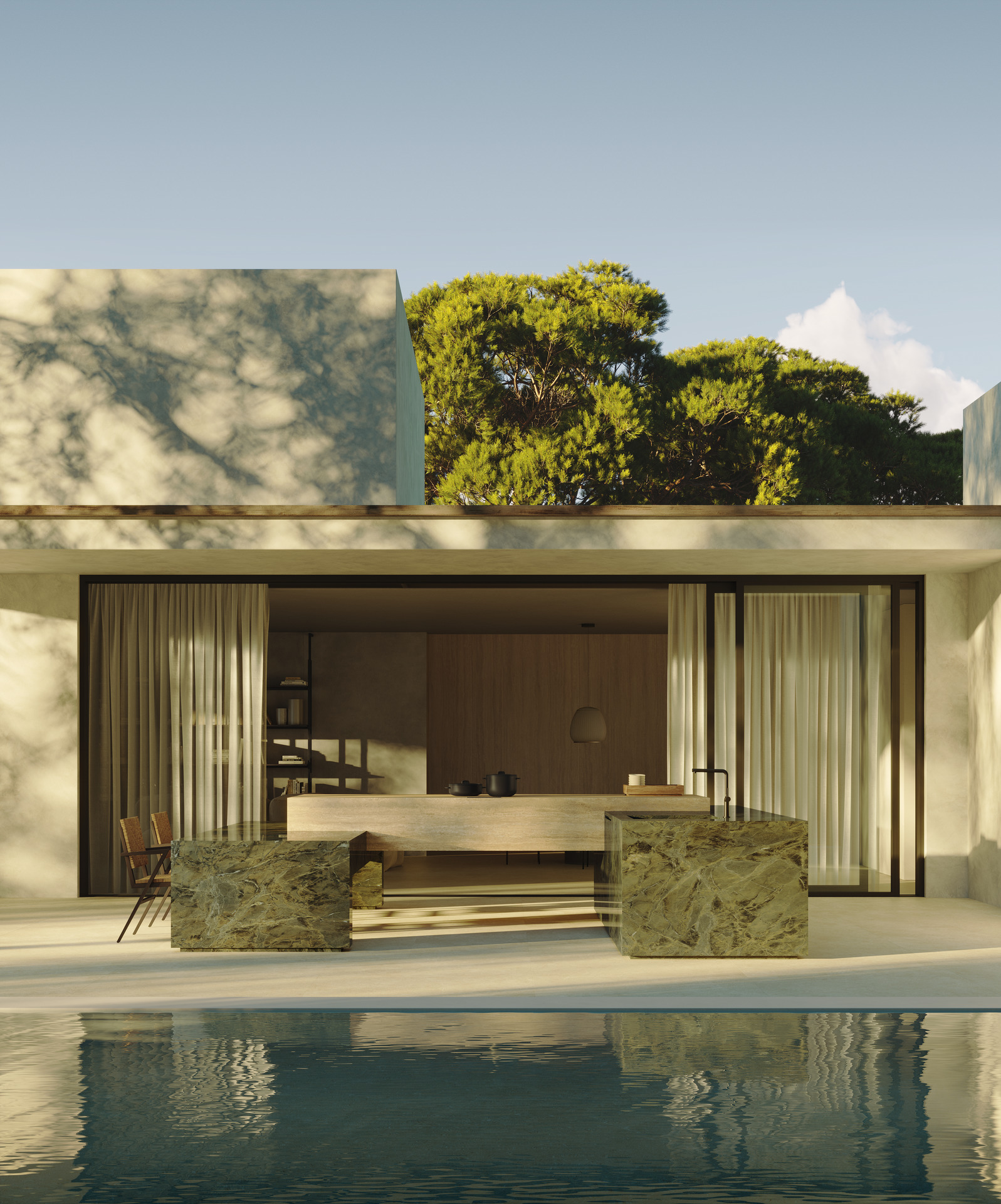 Dialogul material dintre spații și elementele arhitecturale, cum ar fi cel dintre camera de zi și bucătărie, păstrează continuitatea acesteia, depășind limitările legate de rezistența la impact și la pete.