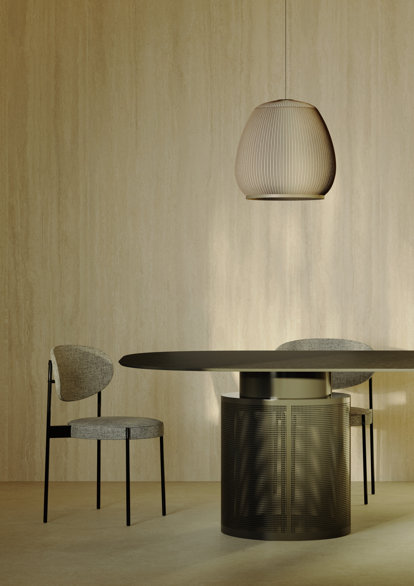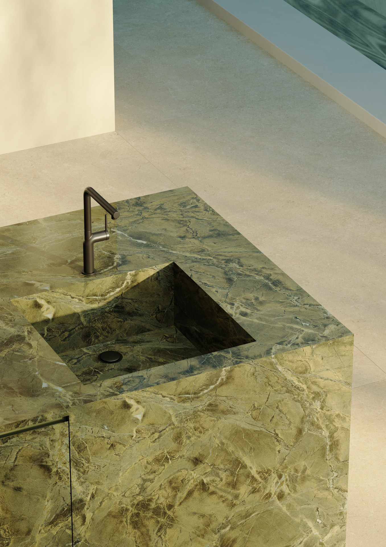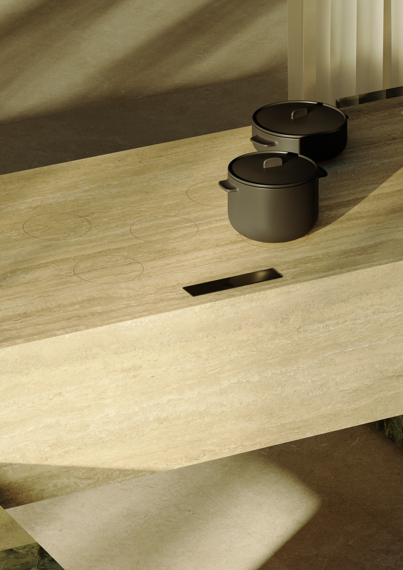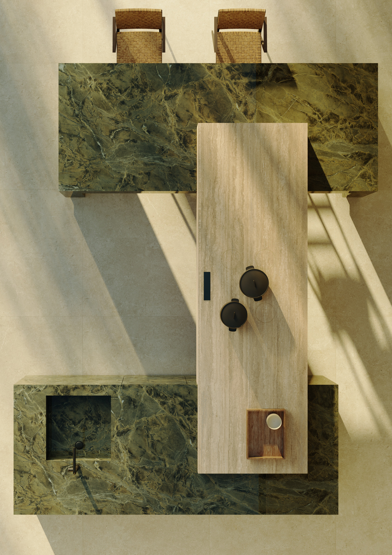 Elementul central al încăperii este o bucătărie deschisă independentă, caracterizată de trei blocuri placate în întregime în gresie porțelanată; pentru cel central, unde se află plita cu inducție, s-a folosit The Top Stone Look Travertino, iar pentru cele două laterale, cu chiuvetă și blat de lucru integrate, a fost aleasă The Top Marble Look Verde Borgogna. Masa rotundă, concepută de designeri, este realizată din Stone Look Granito Black 12 mm, o suprafață cu un aspect material foarte pronunțat, plăcută la atingere. Pe pardoseală se găsesc plăci Stone Look Limestone Ivory.
