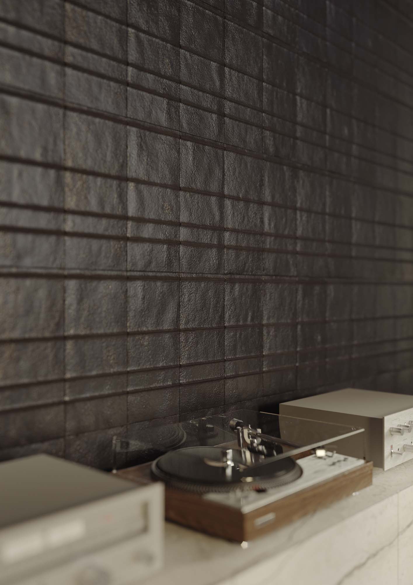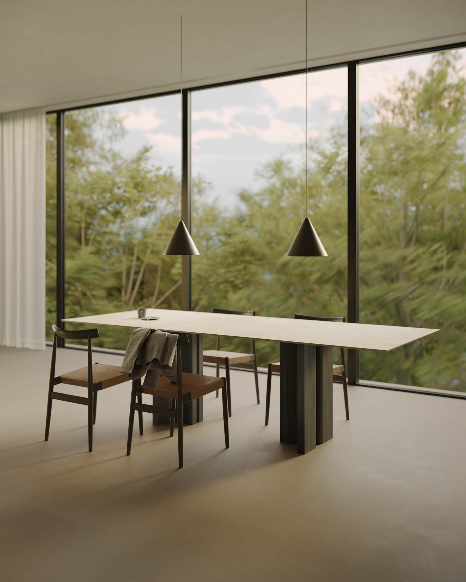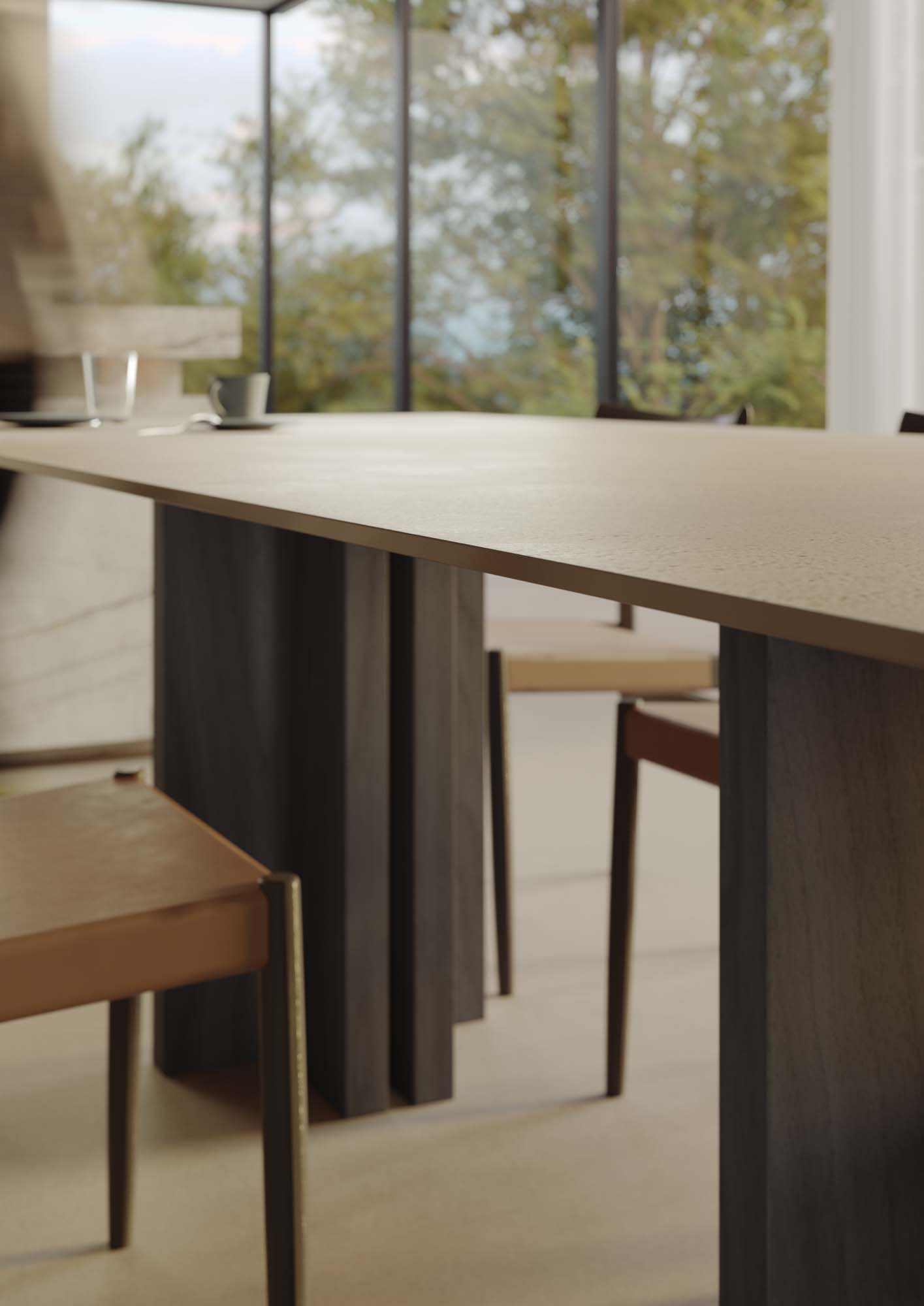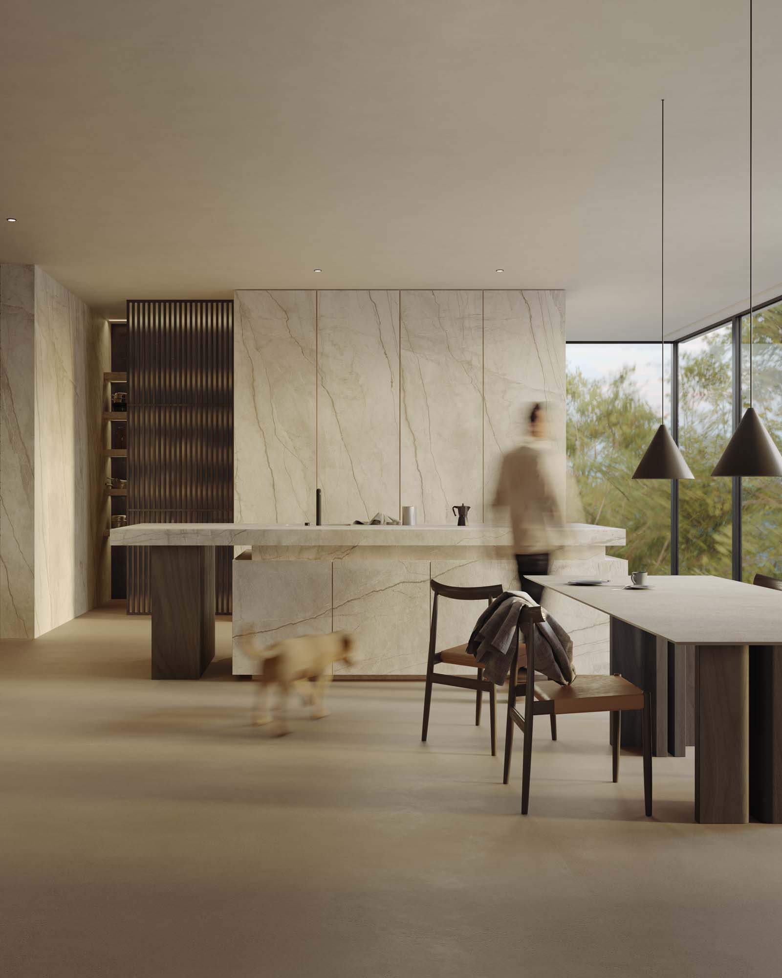 În cele din urmă, masa cu picioare din lemn prezintă blatul realizat cu colecția Slow în placă, evidențiind potențialul acesteia nu doar ca pardoseală, ci și ca suprafață de lucru și sprijin. Pardoseala este acoperită cu Slow, care reprezintă revenirea la estetica teracotei, reinterpretată prin rafinamentul contemporan al formatului mare. Mată și cu o textură materială, ceramica contrastează eficient atât cu efectul de piatră al Silver Root, cât și cu materialele naturale precum lemnul, prezent și în blocul bucătăriei, creând o armonie între materiale.