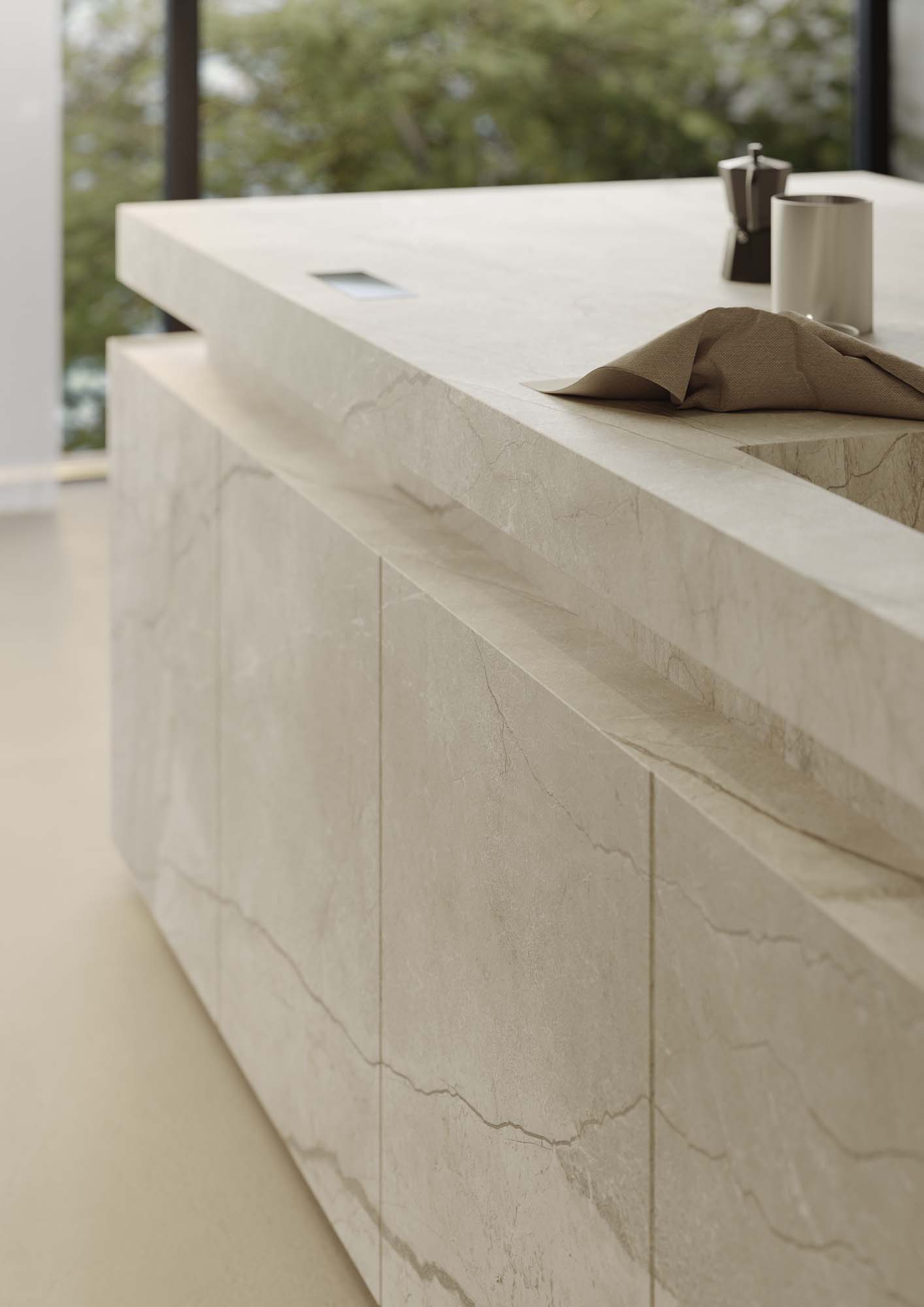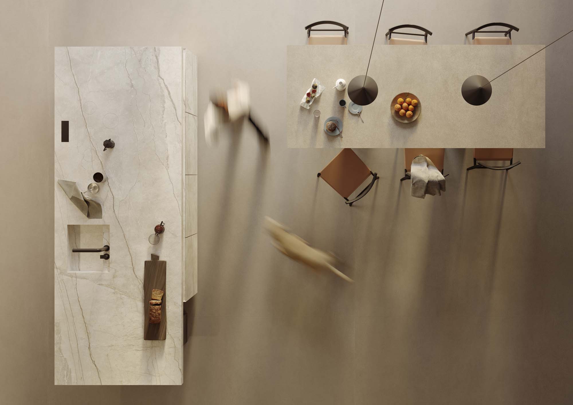 „Ferestrele benzi care se deschid spre natură și camera spațioasă și luminoasă ne-au inspirat o idee de acțiune mai degrabă decât un simplu spațiu funcțional: un mic dejun matinal într-o atmosferă nordică, într-un spațiu deschis și mai puțin mediteranean.” Sunt prezente detalii și obiecte care evocă momente ale zilei, precum micul dejun, și funcțiile fiecărei zone; de exemplu, se percepe puțină dezordine în cămară, în timp ce pick-up-ul de deasupra poliței ajută la contopirea spațiilor de living și bucătărie.” Compoziția arhitecturală evidențiază colecția cu efect cotto Slow propusă în noua versiune pe placă de 12 mm culoarea Calce, montată pe pardoseală și pe suprafața mesei mari, combinată cu senzația pietroasă a Silver Root în noua versiune mai deschisă, montată pe bucătărie, pe peretele din spate și pe poliță.