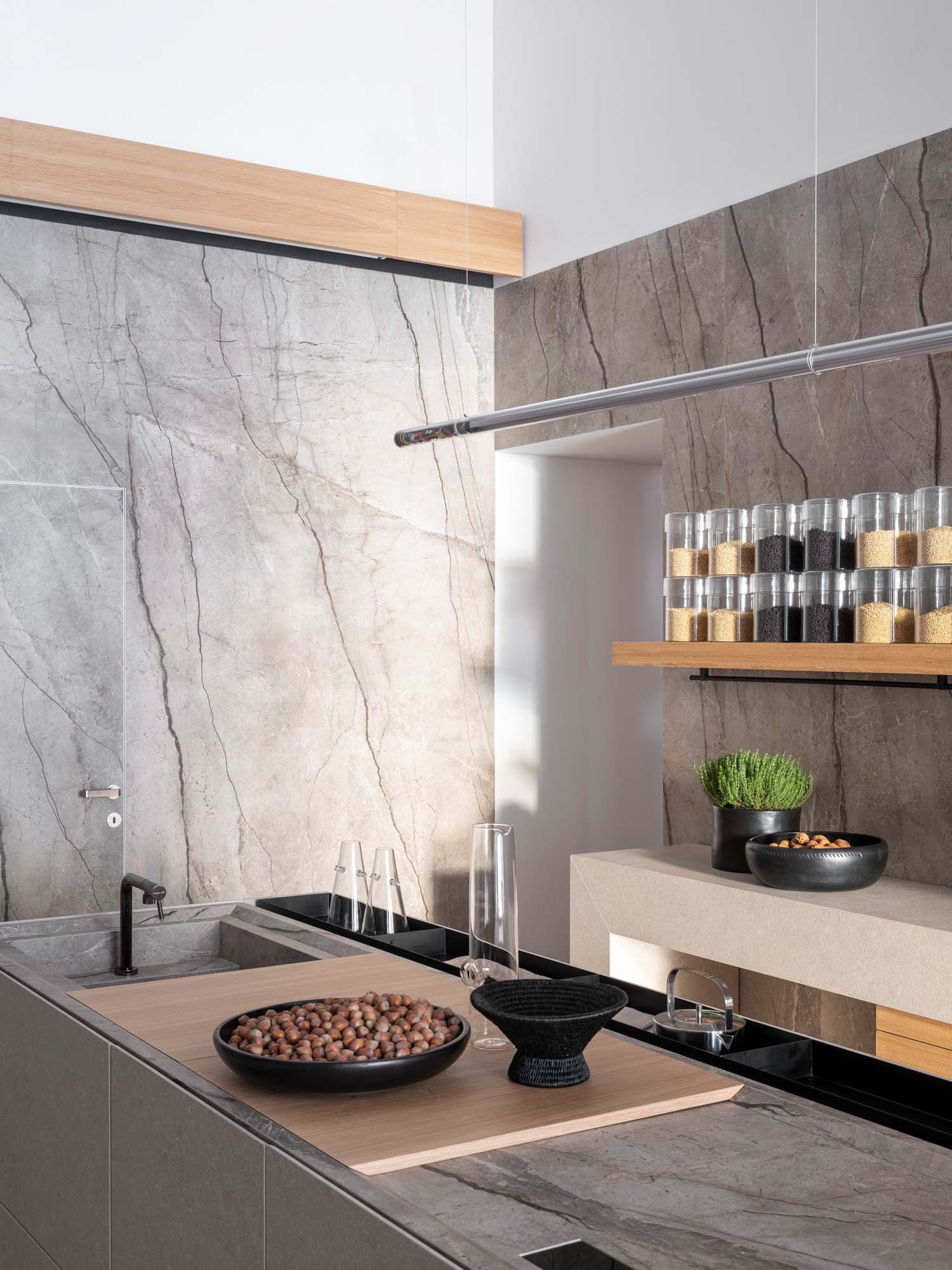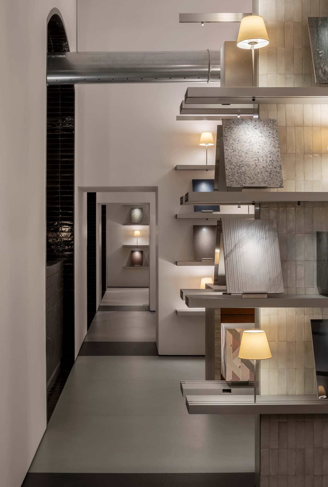 O succesiune de camere tematice subliniază prețiozitatea materialelor Marazzi care, expuse în spații dinamice și interconectate, dialoghează cu arhitectura, creând un flux vizual care invită vizitatorii să exploreze fiecare detaliu. Fiecare cameră tematică oferă o experiență unică care evidențiază excelența materialelor. Plăcile mari, dispuse ca niște covoare orientale bogate, sunt atent iluminate pentru a le evidenția frumusețea, la fel ca și rafturile muzeale care expun o selecție exclusivă de finisaje, suprafețe și culori, transformând spațiul expozițional într-o wunderkammer de culori și materiale, care evocă lucrări artizanale, marmură prețioasă, intarsii elaborate și structuri tridimensionale.
