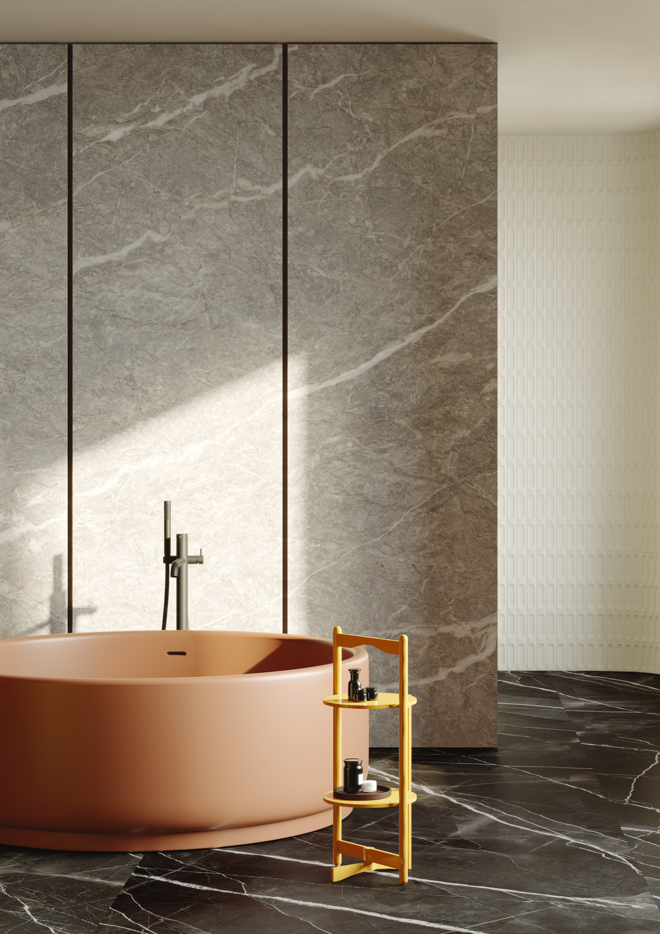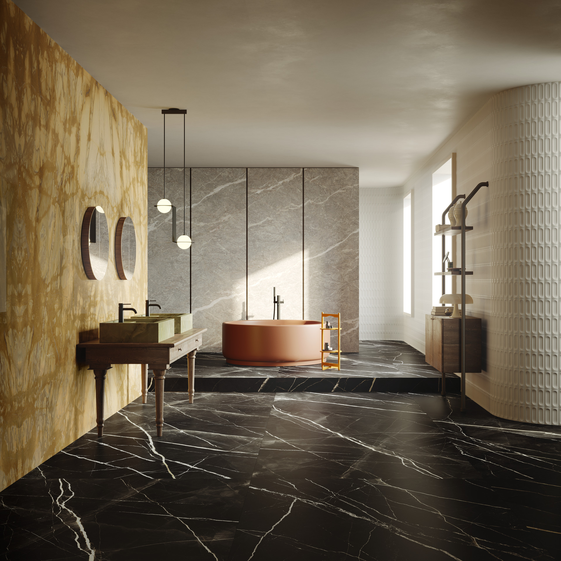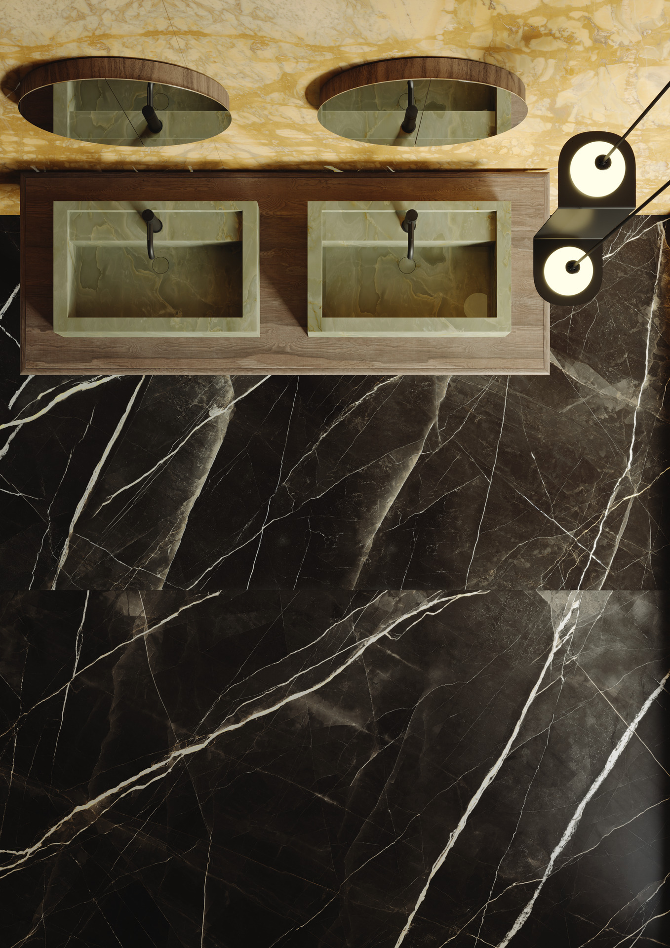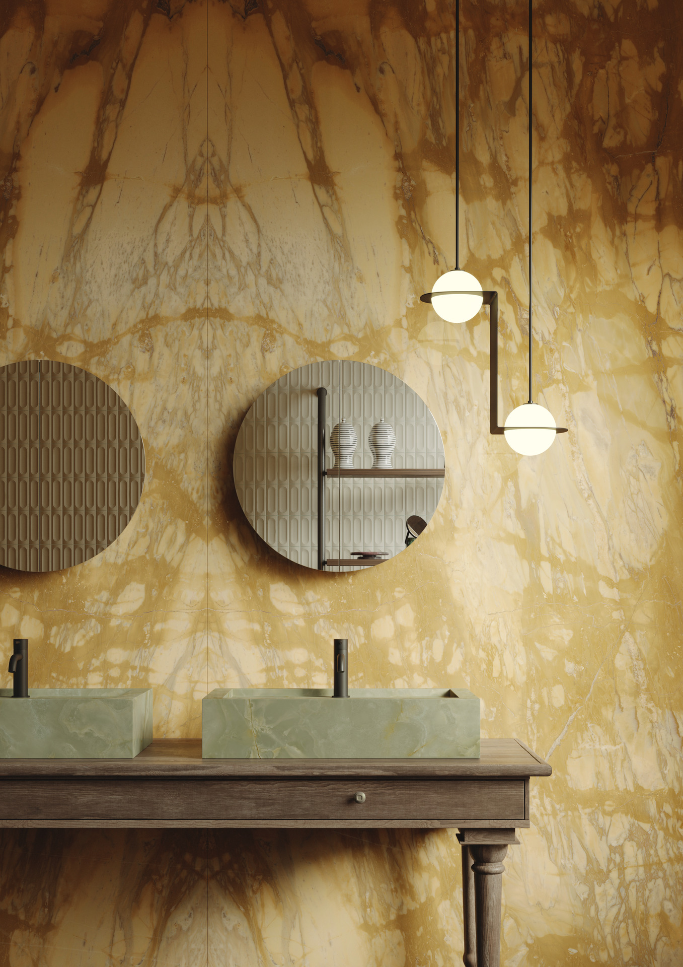 Nervurile și nuanțele celor mai nobile și rare tipuri de marmură prind din nou viață în această baie, în epoca digitalizării texturilor naturale, în veridicitatea și tactilitatea surprinzătoare a formatului mare, fără a uita niciodată durabilitatea alegerilor de construcție. Plăcile cu aspect tradițional Grande Marble Look Giallo Siena și Grande Marble Look Calacatta Black fac loc, pe fundal, aerului contemporan al Grande Marble Look Fior di Pesco Carnico, care acoperă ușile dulapului de perete, și Onice Giada, care dă formă lavoarelor sprijinite pe dulapul de epocă.