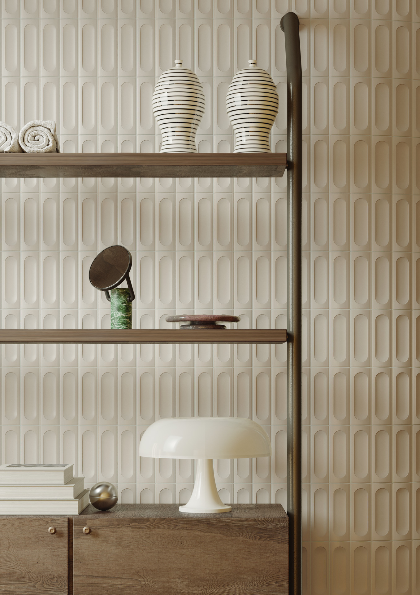 Pe peretele din dreapta, plăcile Crogiolo Confetto se joacă cu lumina; este o colecție cu format mic din gresie porțelanată cu suprafață neregulata, semi-mată și netedă la atingere. Textura este alcătuită din modulul cu basorelief (structura 3D Savoiardo, 5×15 cm) care interpretează celebra colecție Marazzi „Canne d'Organo” a lui Nino Caruso, designer și sculptor, din anii `70. Aici, în culoarea Bone, colecția prezintă o paletă de douăsprezece nuanțe pline, calde și reci.