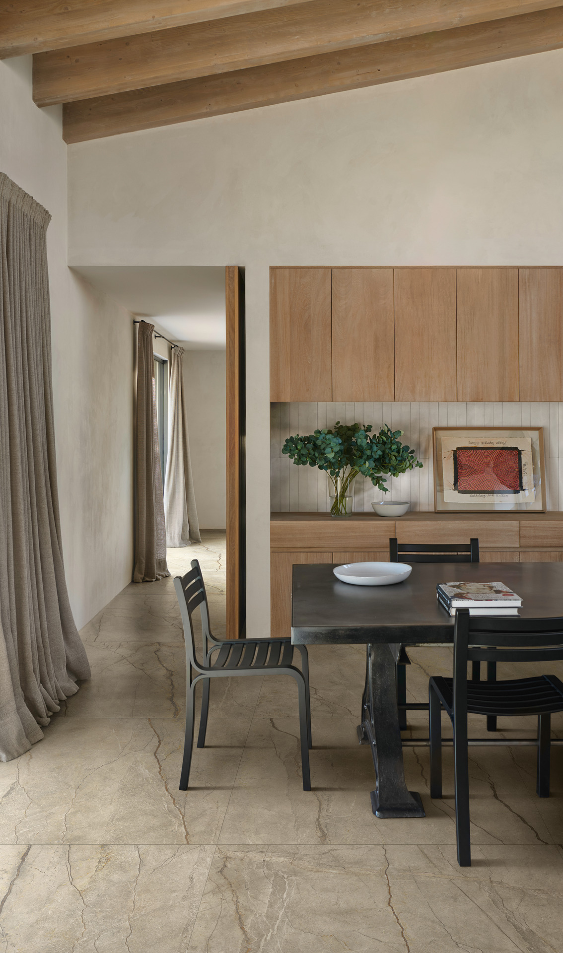 Gresia porțelanată devine astfel instrumentul ideal pentru a atinge echilibrul perfect între materialele naturale și aplicațiile sale versatile, asociind chiar și plăci mari eclettice cu soluții decorative bazate pe iterarea formatului mic, capabilă să fragmenteze suprafața, conferindu-i mișcare și străluciri inedite.