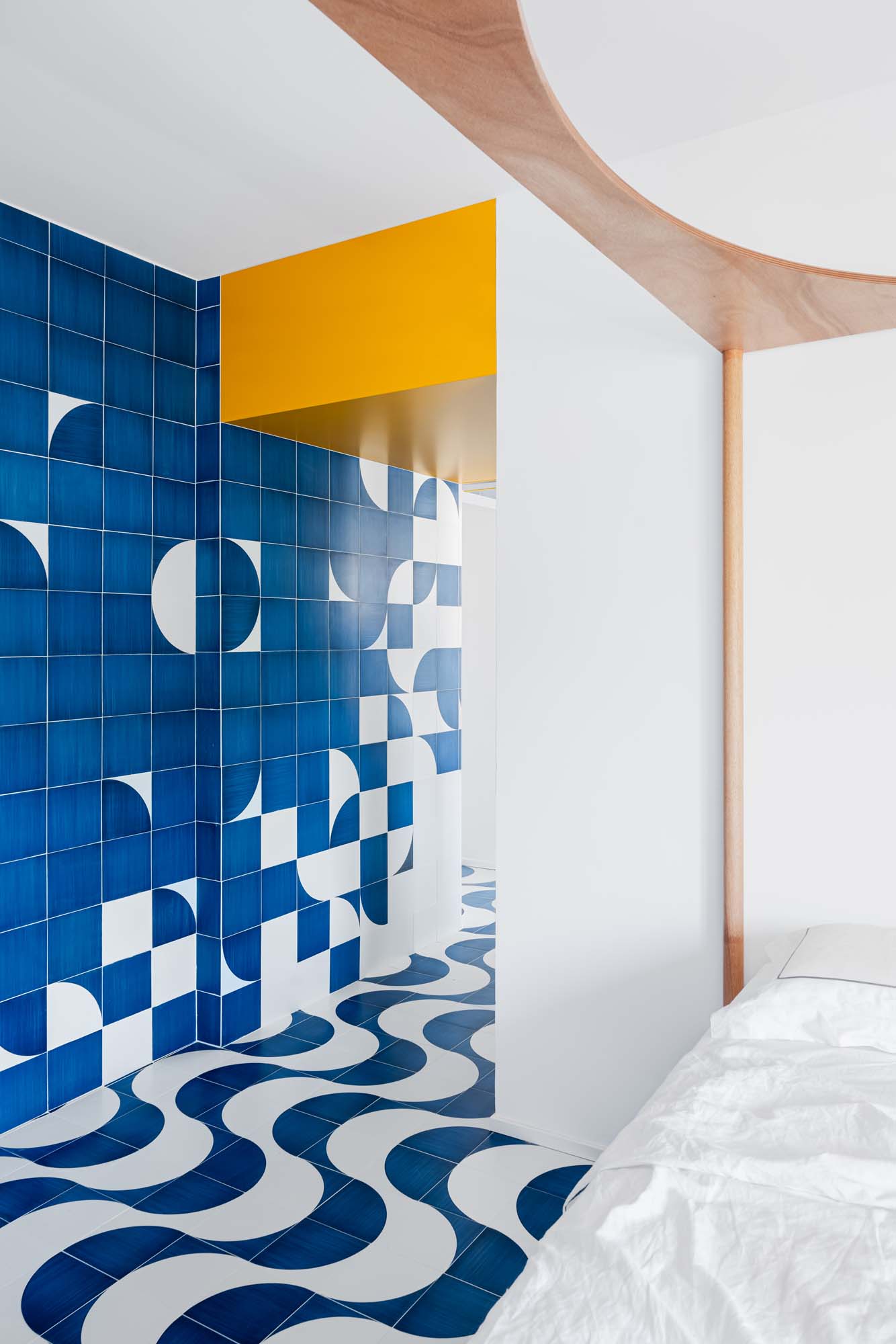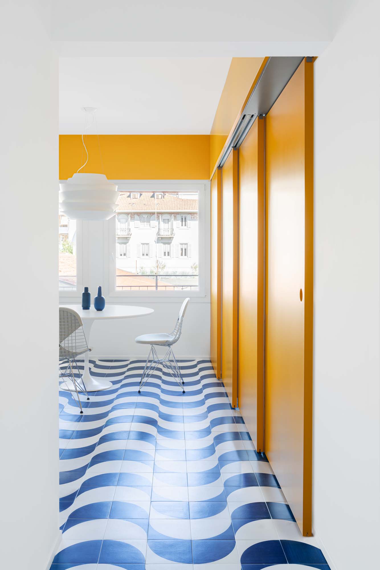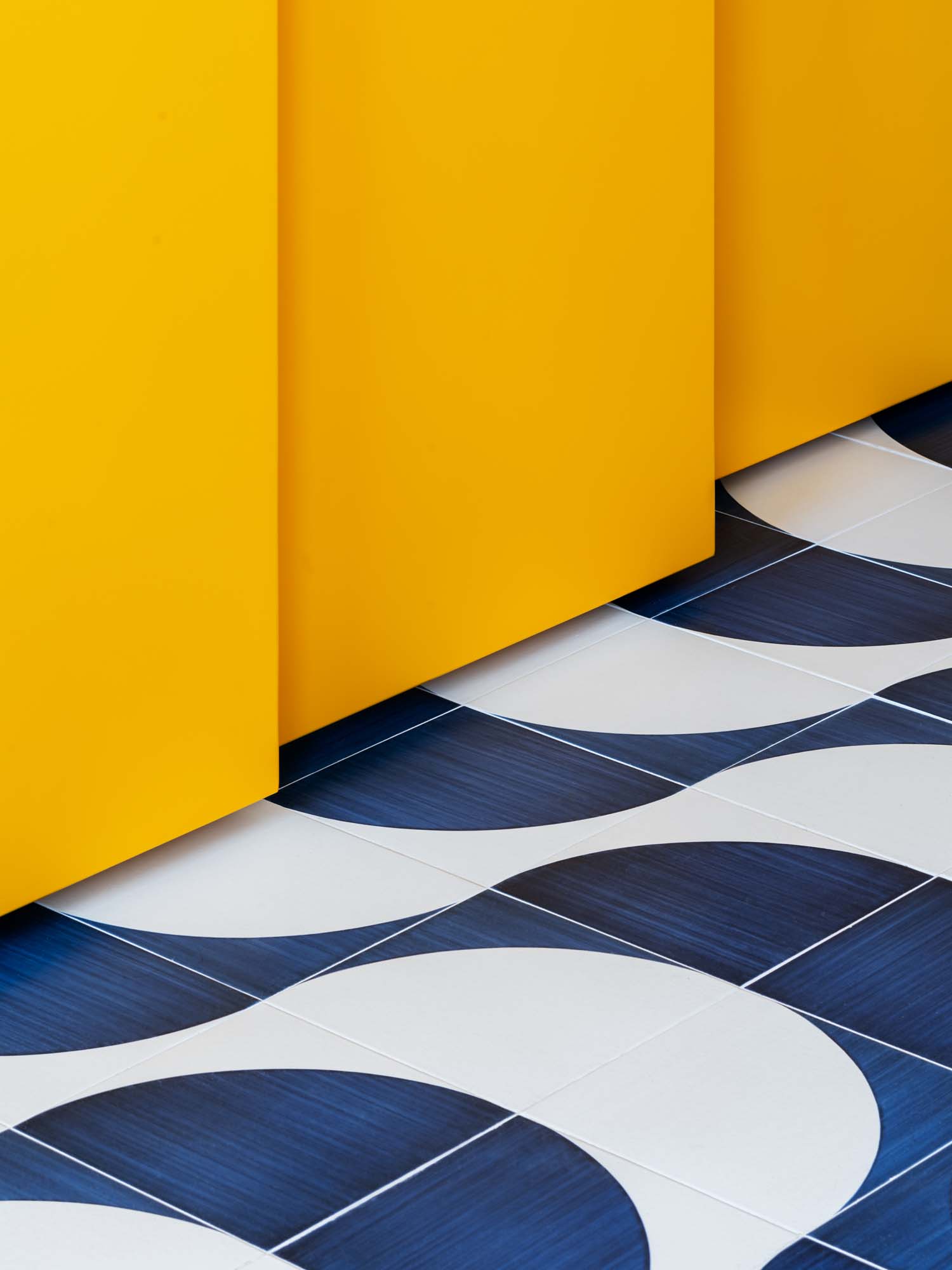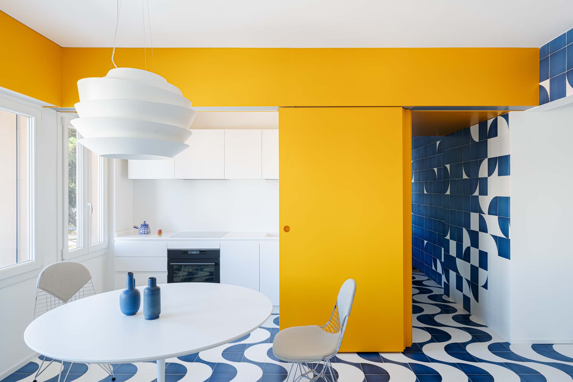 Un perete modular galben permite împărțirea spațiilor în funcție de nevoi, contribuind la oferirea de culoare și personalitate întregului apartament. Pentru a accentua versatilitatea și dinamismul spațiilor, peretele de conectare a fost realizat cu o împletitură de plăci ceramice Scenario pe toată înălțimea, tot în nuanțe de albastru și alb, care se transformă treptat în geometrii diferite, jucând între plinuri și goluri, în continuitate cu pardoselile.