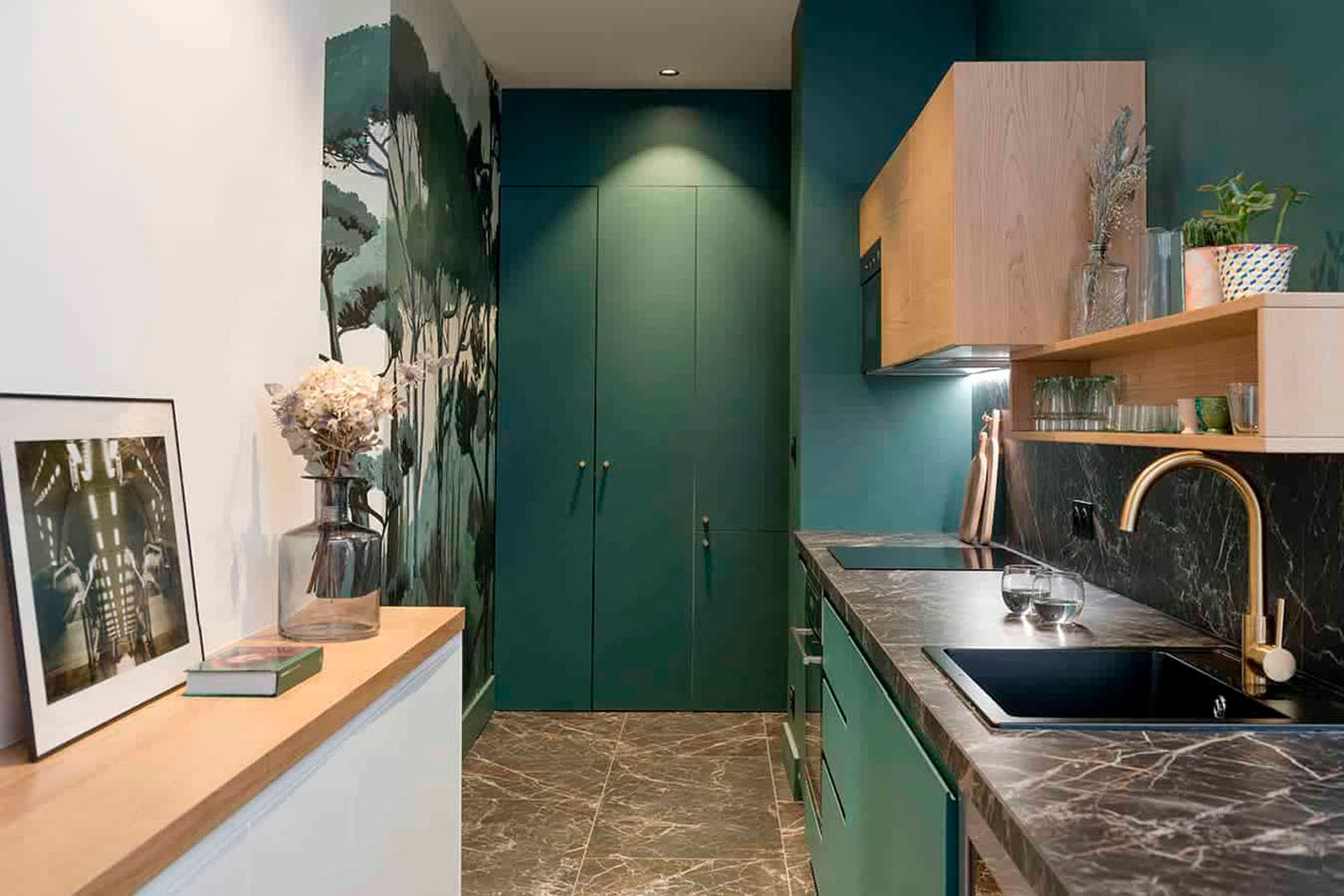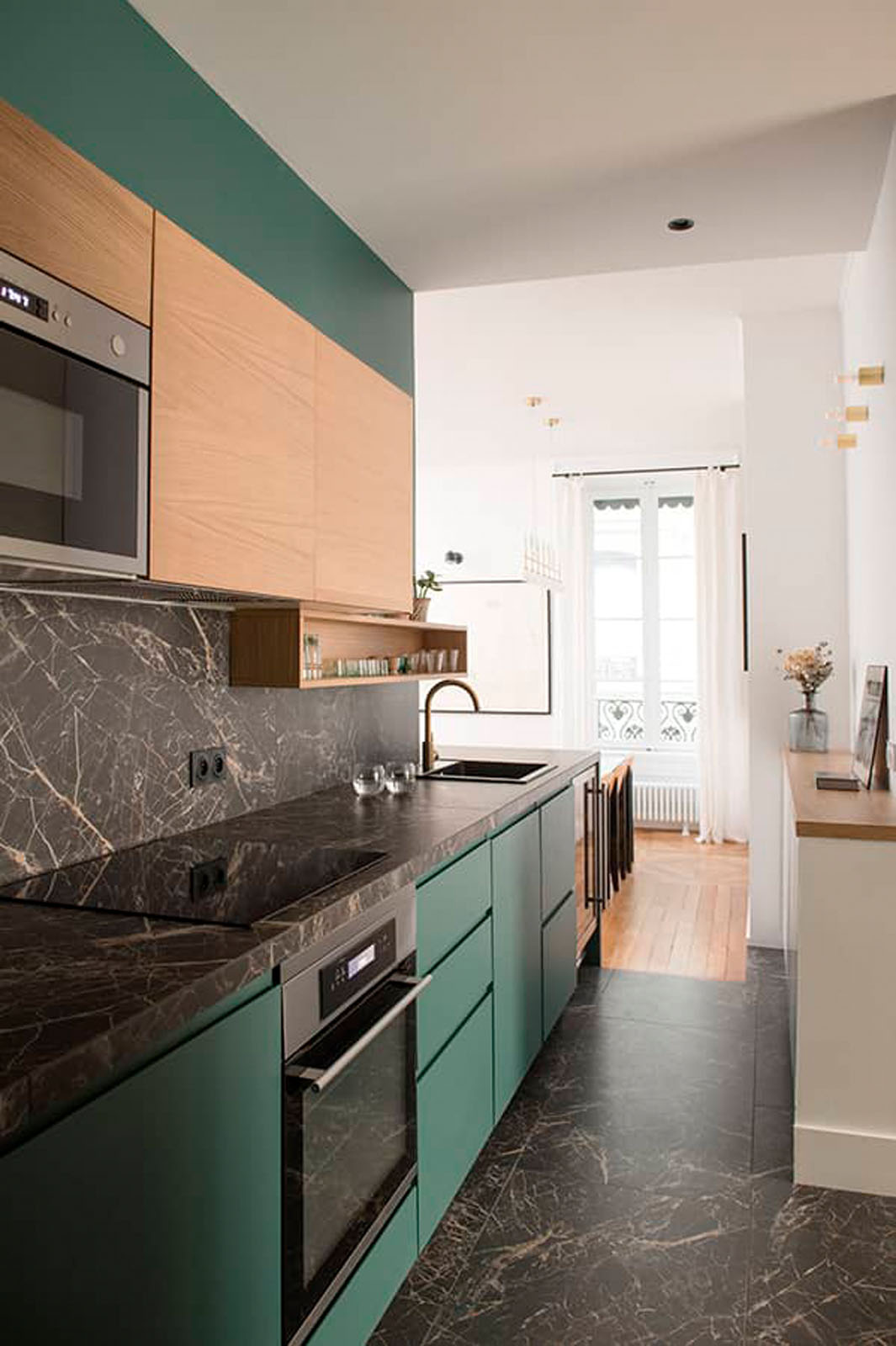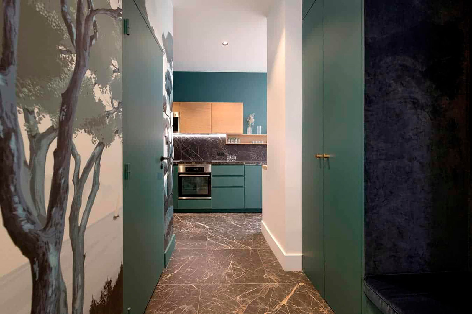 Plăcile de gresie porțelanată Allmarble 120x60 cm, în nuanța îndrăzneață Saint Laurent, au fost alese de designerul de interior pentru a conferi spațiilor o dimensiune arhitecturală autentică. În special, gresia cu aspect de marmură Saint Laurent apare pe pardoseala de la intrare, complet reproiectată, care constituie deschiderea către o perspectivă uimitoare: bucătăria, evidențiată de un albastru-verde hipnotic; aceeași gresie a fost utilizată în zonele de bucătărie și baie, și acestea supuse unei reinterpretări mai contemporane.
