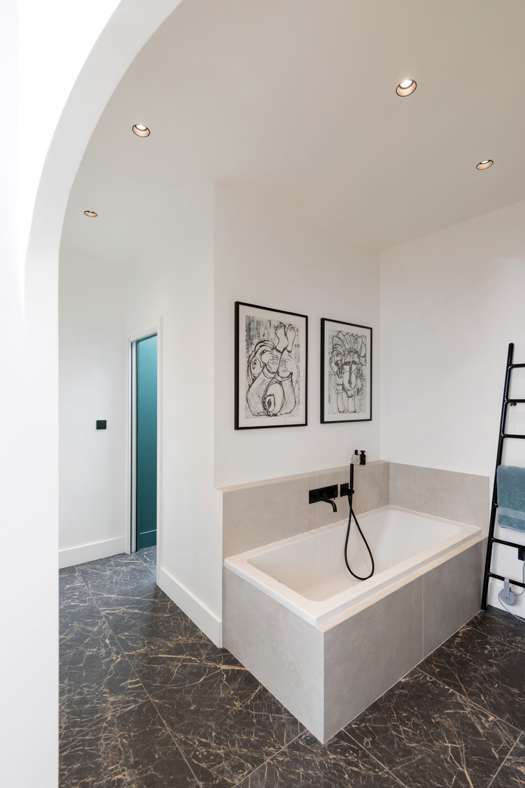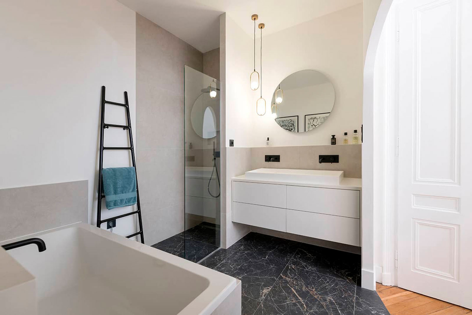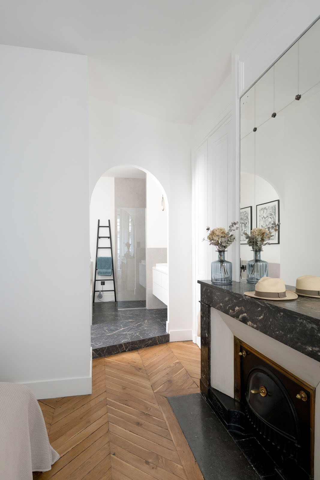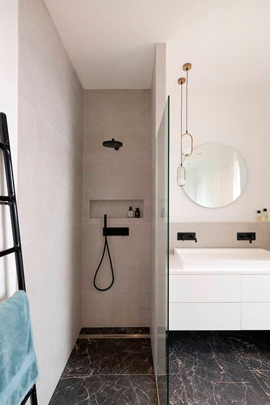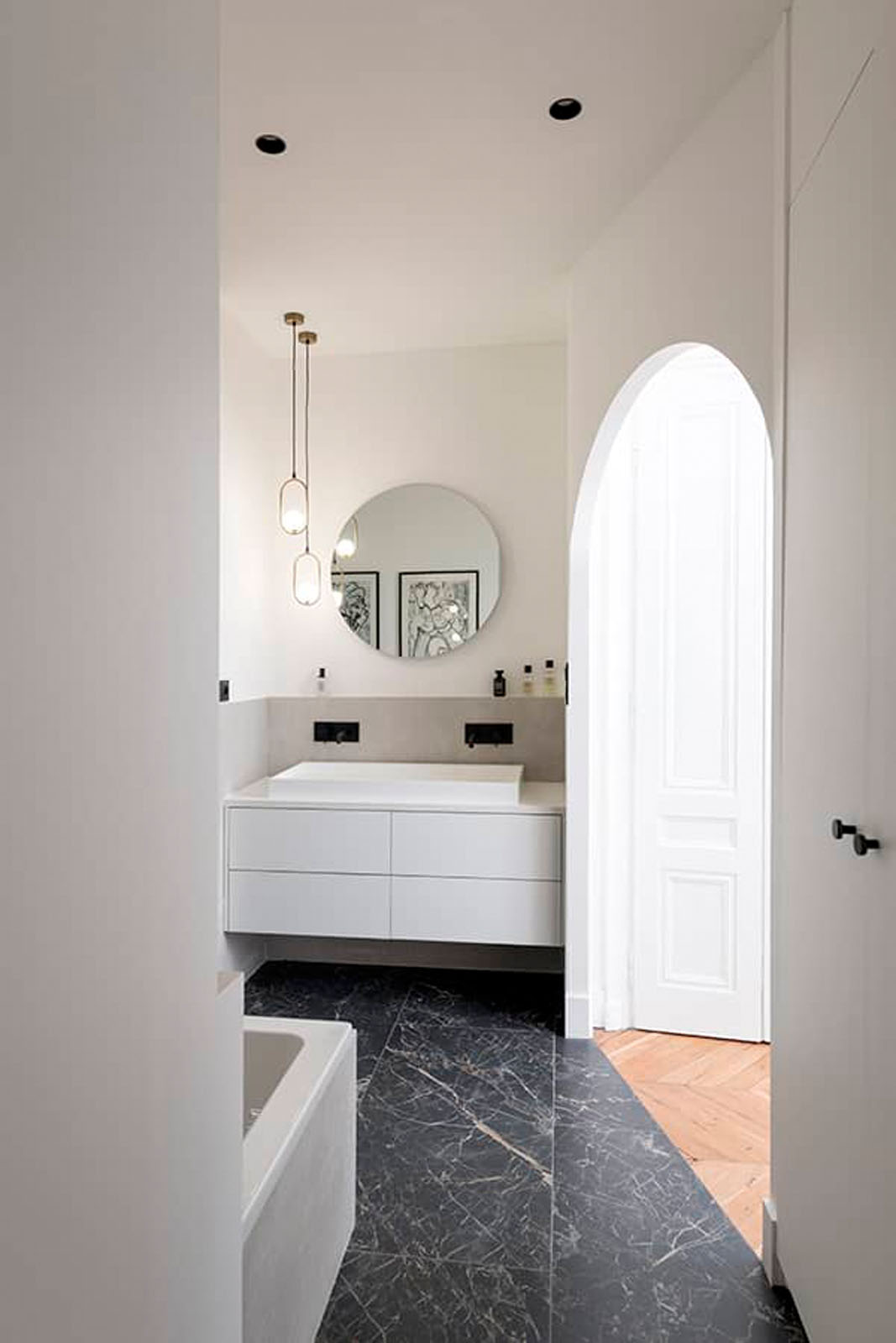 Pentru placarea pereților, Allmarble Saint Laurent a fost aleasă ca temă principală și ca element cu personalitate puternică pentru planul bucătăriei în continuitate cu zona de luat masa în formă de peninsulă, cu vedere spre livingul spațios și spre șemineul impozant care a fost păstrat în dormitor, unde nuanța caldă a parchetului este în armonie perfectă cu nervurile gresiei cu aspect de marmură în nuanța Saint Laurent.