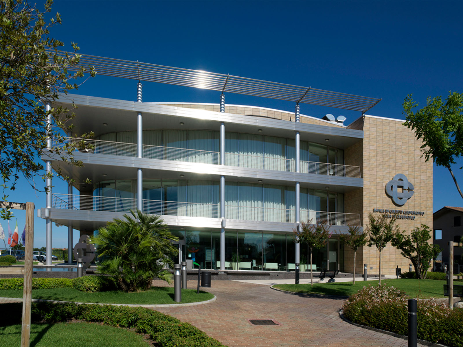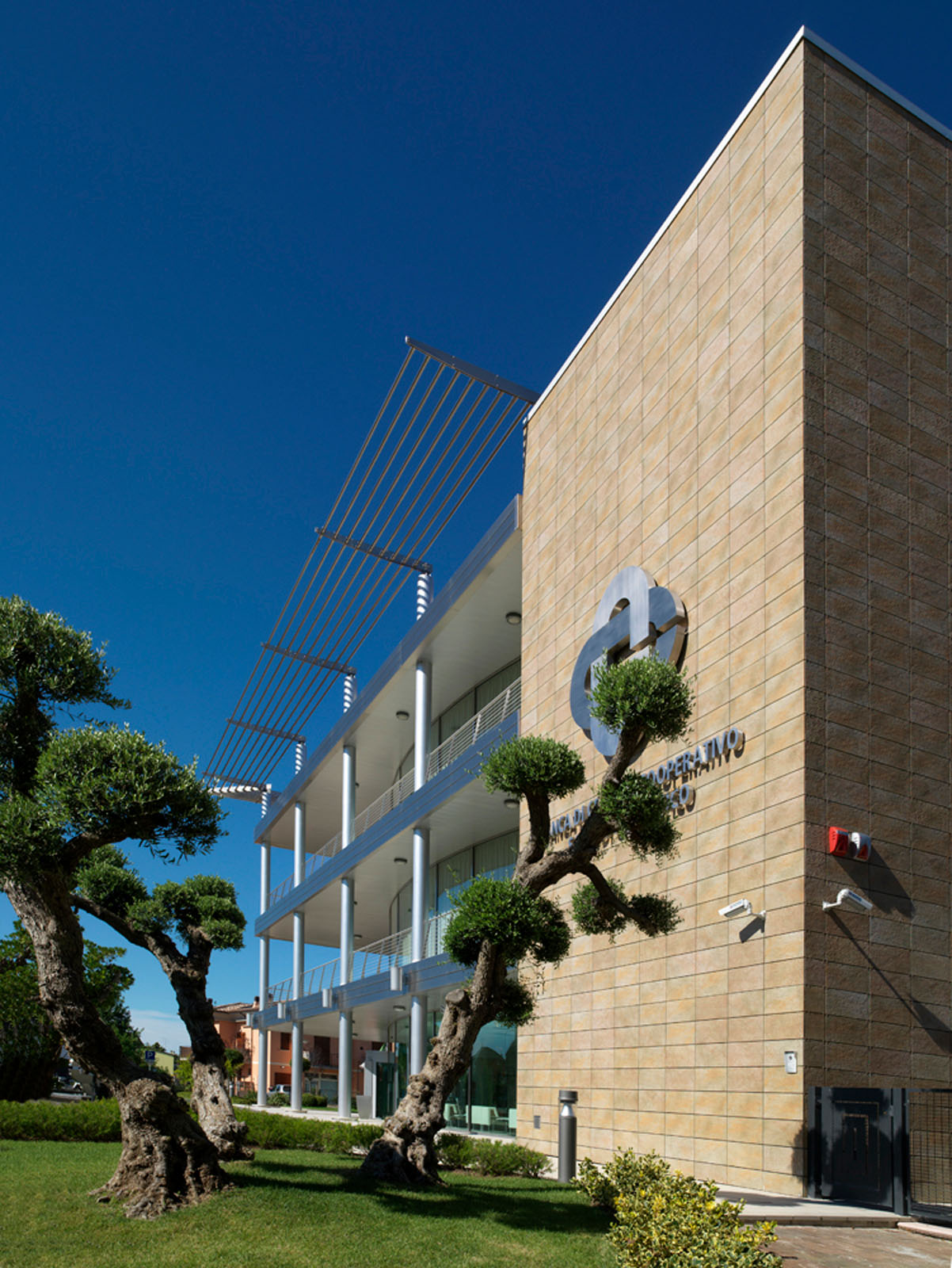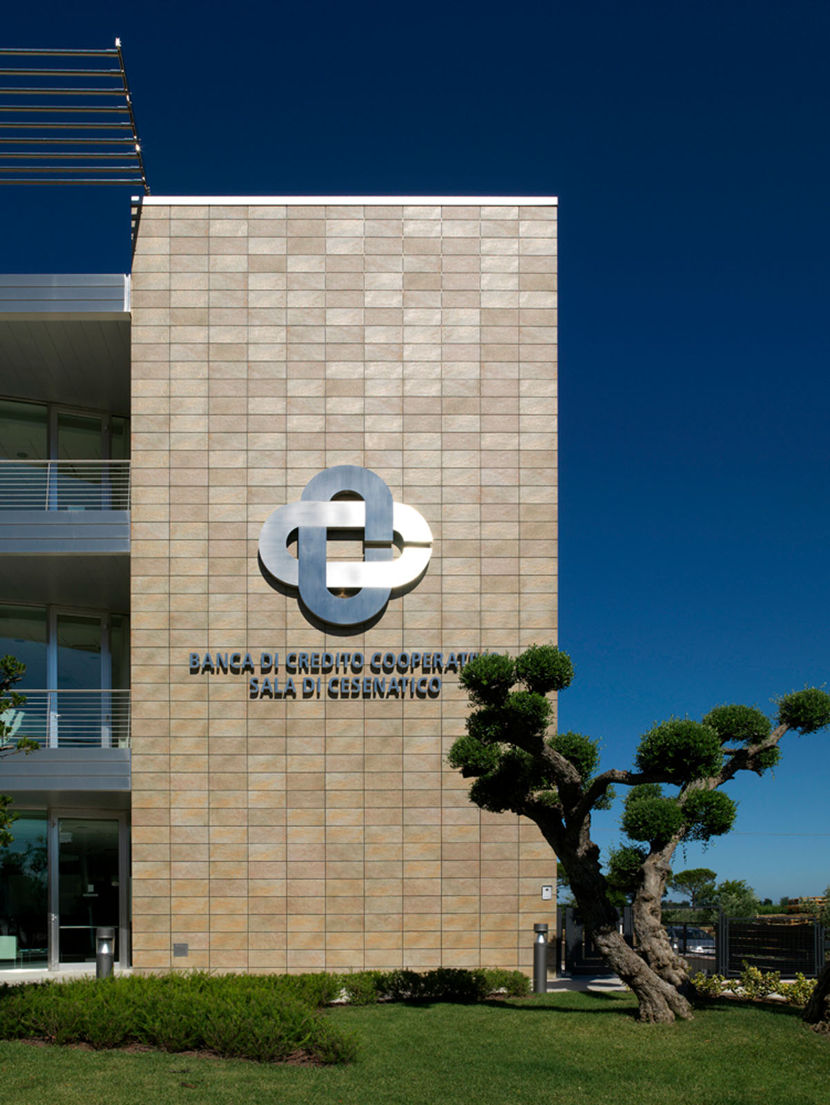 Noul cartier general al micii bănci cooperative se ridică într-o localitate rurală din Cesenatico. Puternica legătură a instituției în teritoriu este evidențiată de forma compactă a construcției, un adevărat „palat” care se înalță deasupra construcțiilor joase din jur, și de desenul original al perspectivelor, care combină în mod plăcut structurile metalice și suprafețele ceramice. Marazzi Engineering s-a alăturat proiectantului încă din faza inițială, asistându-l în formularea ofertei pentru licitație de proiectare lansată de beneficiar. În acest cadru al alegerii peretelui ventilat s-a evidențiat a fi câștigător, atât pentru oportunitățile de economisire energetică, rezistență și durabilitate, oferite de gresia porțelanată Marazzi, cât și pentru caracterul distinctiv produs de o textură care evocă puternic piatra. Grupul Marazzi a furnizat peretele ventilat „la cheie”, rezolvând fiecare aspect legat atât de proiectarea executivă, realizată în perfectă unitate de intenții cu proiectantul și beneficiarul, cât și de instalare, realizată cu prinderi la vedere. În această ultimă fază, dificultatea cea mai mare a fost studierea realizării legăturilor cu pardoseala și îmbinările între peretele ventilat și structurile curbate din sticlă ale unghiului de intrare.