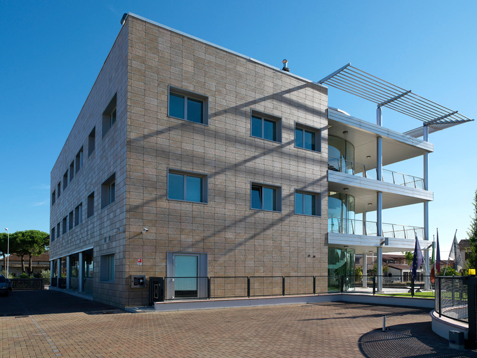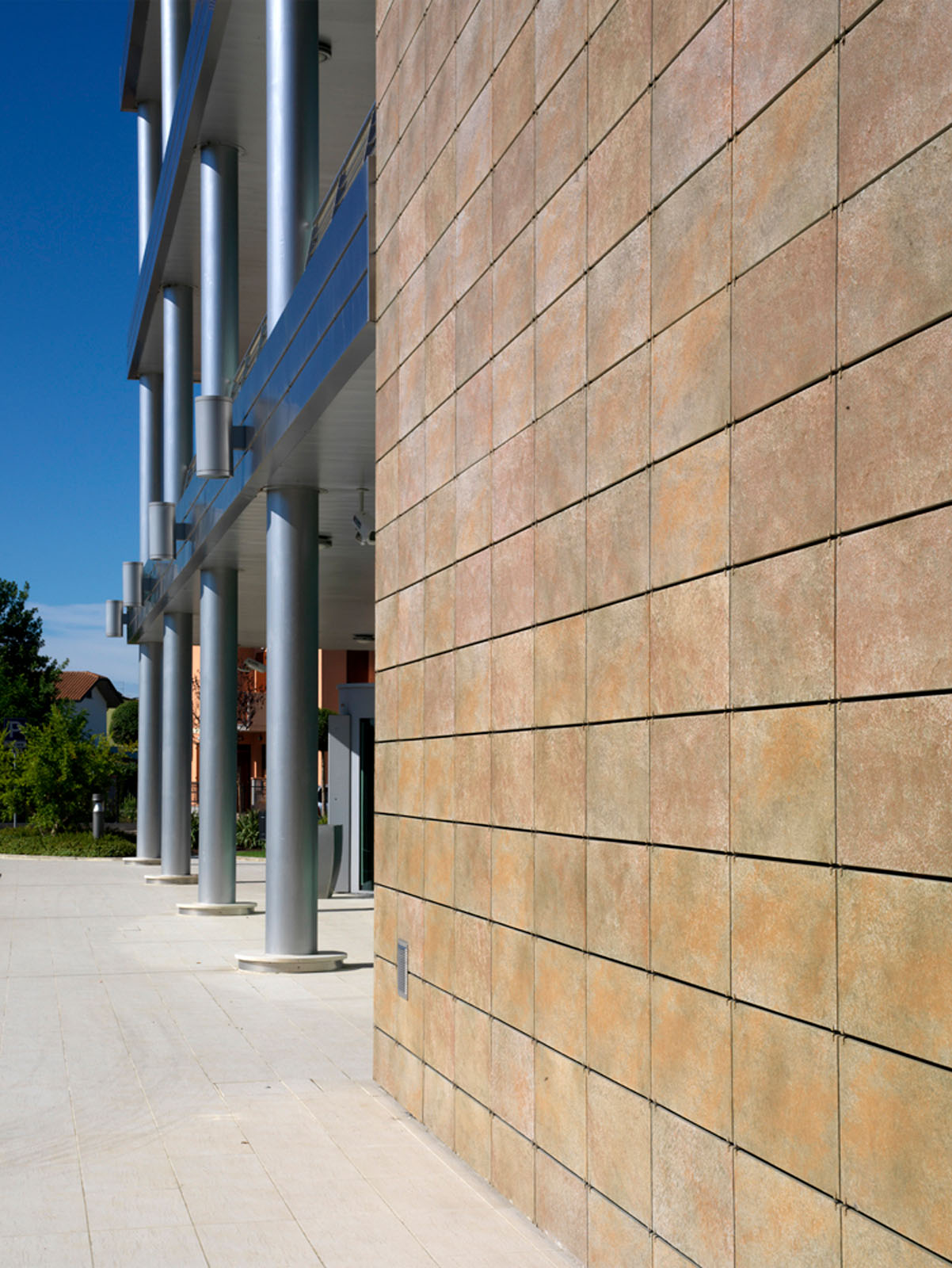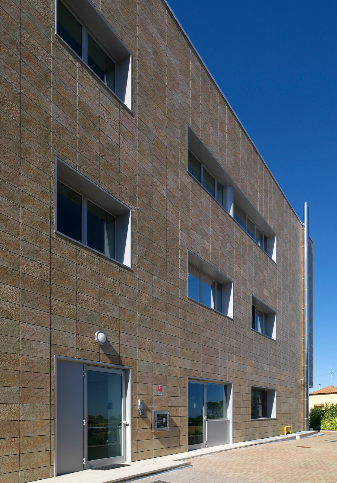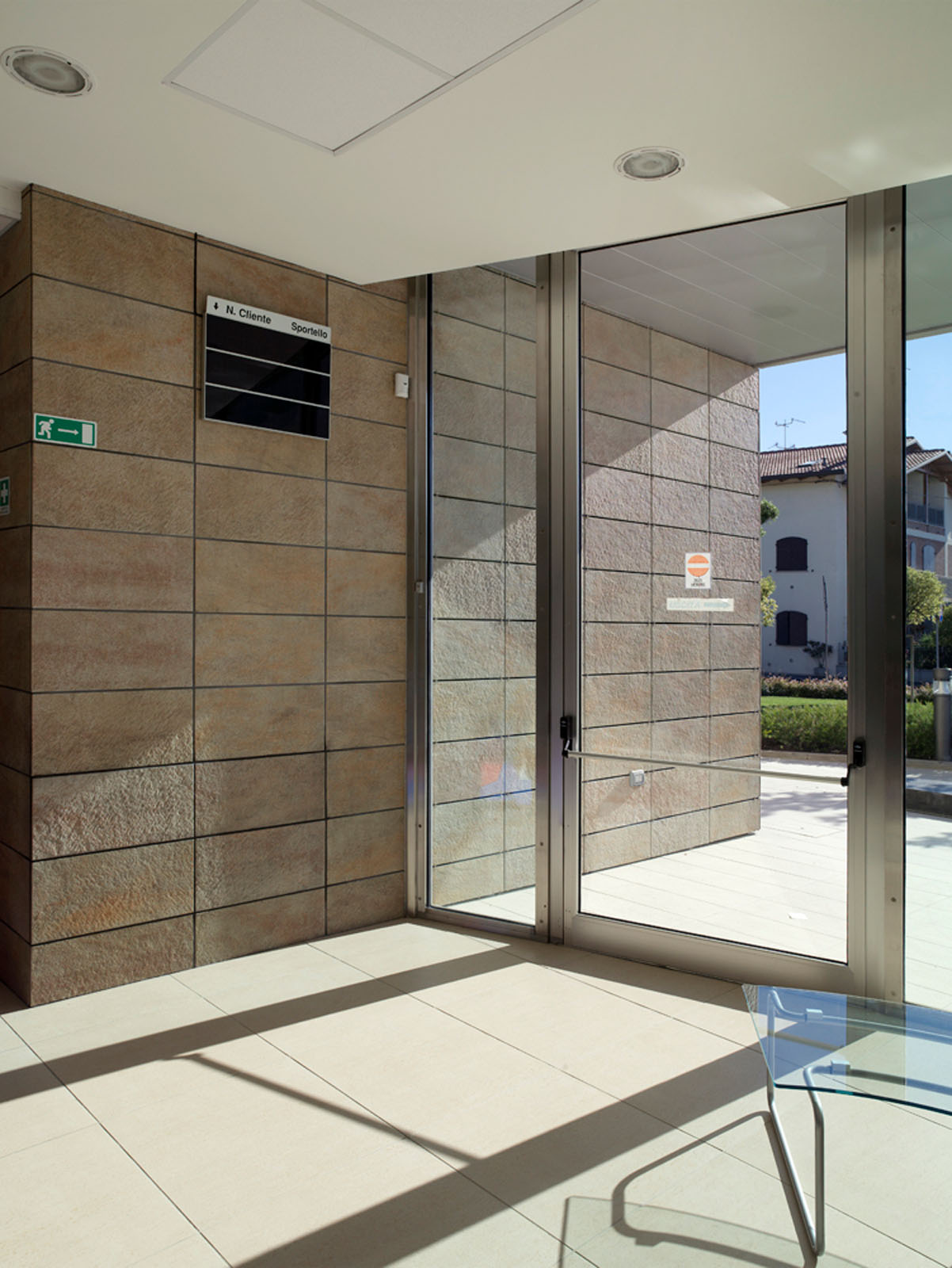 Noul cartier general al micii bănci cooperative se ridică într-o localitate rurală din Cesenatico. Puternica legătură a instituției în teritoriu este evidențiată de forma compactă a construcției, un adevărat „palat” care se înalță deasupra construcțiilor joase din jur, și de desenul original al perspectivelor, care combină în mod plăcut structurile metalice și suprafețele ceramice. Marazzi Engineering s-a alăturat proiectantului încă din faza inițială, asistându-l în formularea ofertei pentru licitație de proiectare lansată de beneficiar. În acest cadru al alegerii peretelui ventilat s-a evidențiat a fi câștigător, atât pentru oportunitățile de economisire energetică, rezistență și durabilitate, oferite de gresia porțelanată Marazzi, cât și pentru caracterul distinctiv produs de o textură care evocă puternic piatra. Grupul Marazzi a furnizat peretele ventilat „la cheie”, rezolvând fiecare aspect legat atât de proiectarea executivă, realizată în perfectă unitate de intenții cu proiectantul și beneficiarul, cât și de instalare, realizată cu prinderi la vedere. În această ultimă fază, dificultatea cea mai mare a fost studierea realizării legăturilor cu pardoseala și îmbinările între peretele ventilat și structurile curbate din sticlă ale unghiului de intrare.
