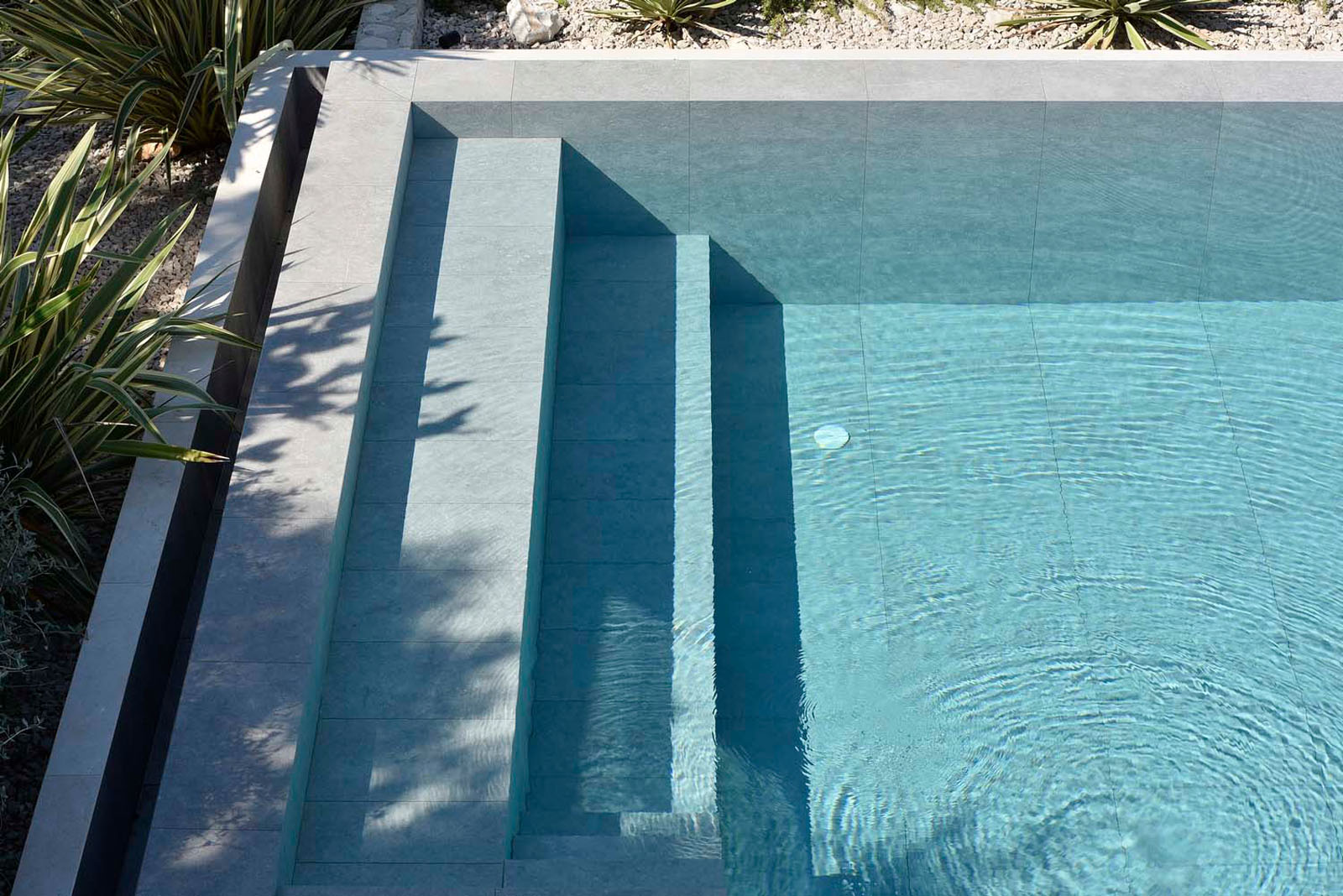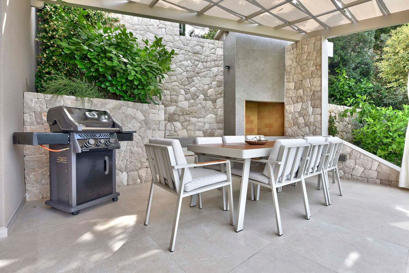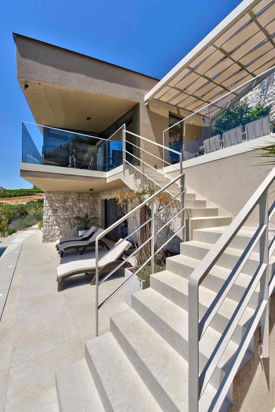 Pentru spațiile exterioare, arhitecta Klaudija Zubčić a ales gresia cu efect de piatră din colecția Mystone Limestone (finisaje Ivory și Sand) cu performanță antiderapantă ridicată și colecția Mystone Bluestone (în versiunea Grigio Strutturato), completată cu o vastă gamă de ornamente, așezate în zona piscinei.