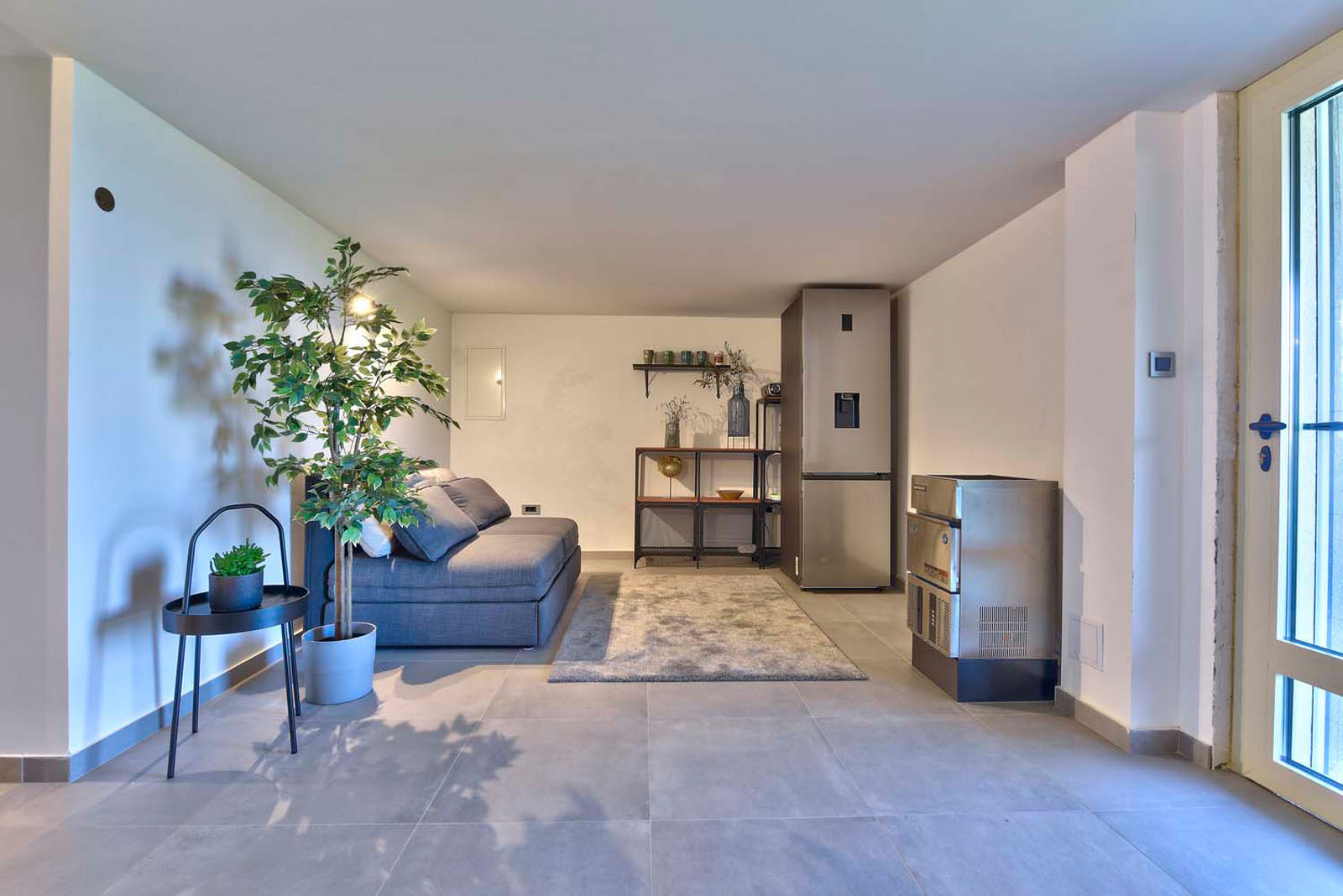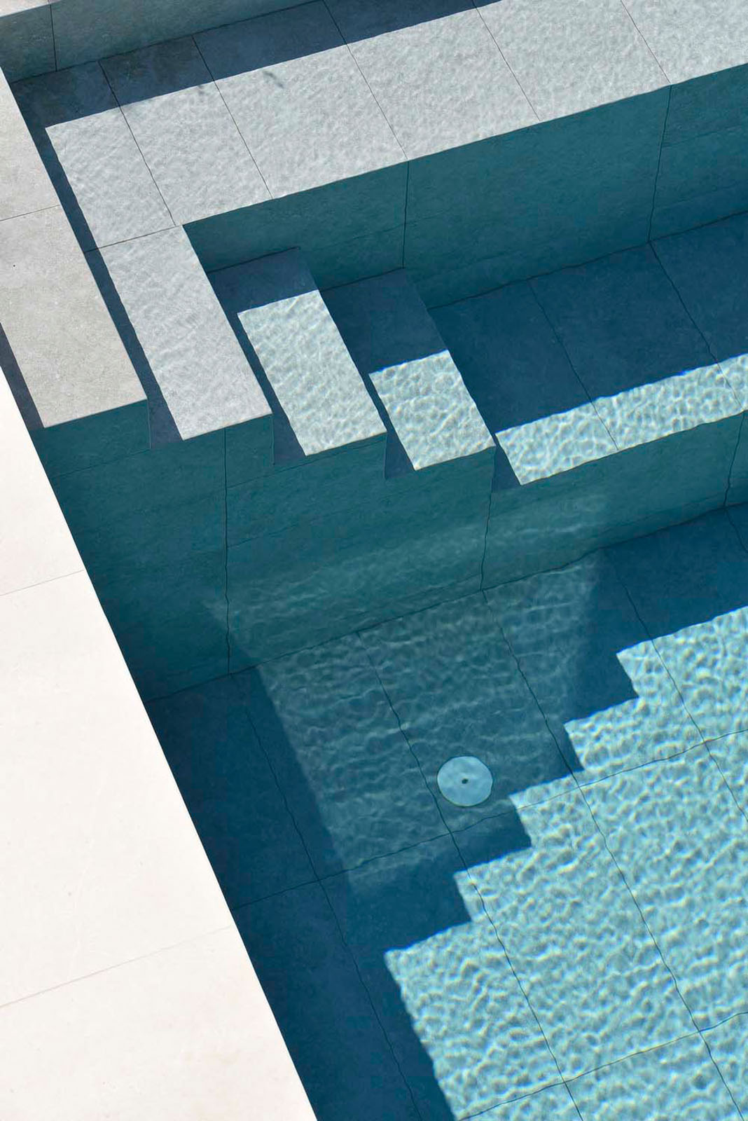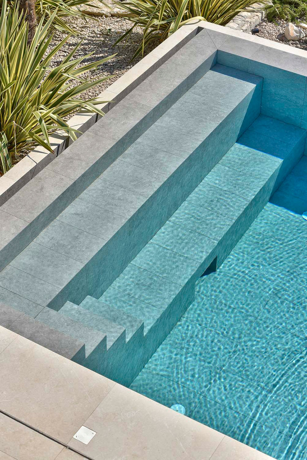 Pentru spațiile exterioare, arhitecta Klaudija Zubčić a ales gresia cu efect de piatră din colecția Mystone Limestone (finisaje Ivory și Sand) cu performanță antiderapantă ridicată și colecția Mystone Bluestone (în versiunea Grigio Strutturato), completată cu o vastă gamă de ornamente, așezate în zona piscinei.