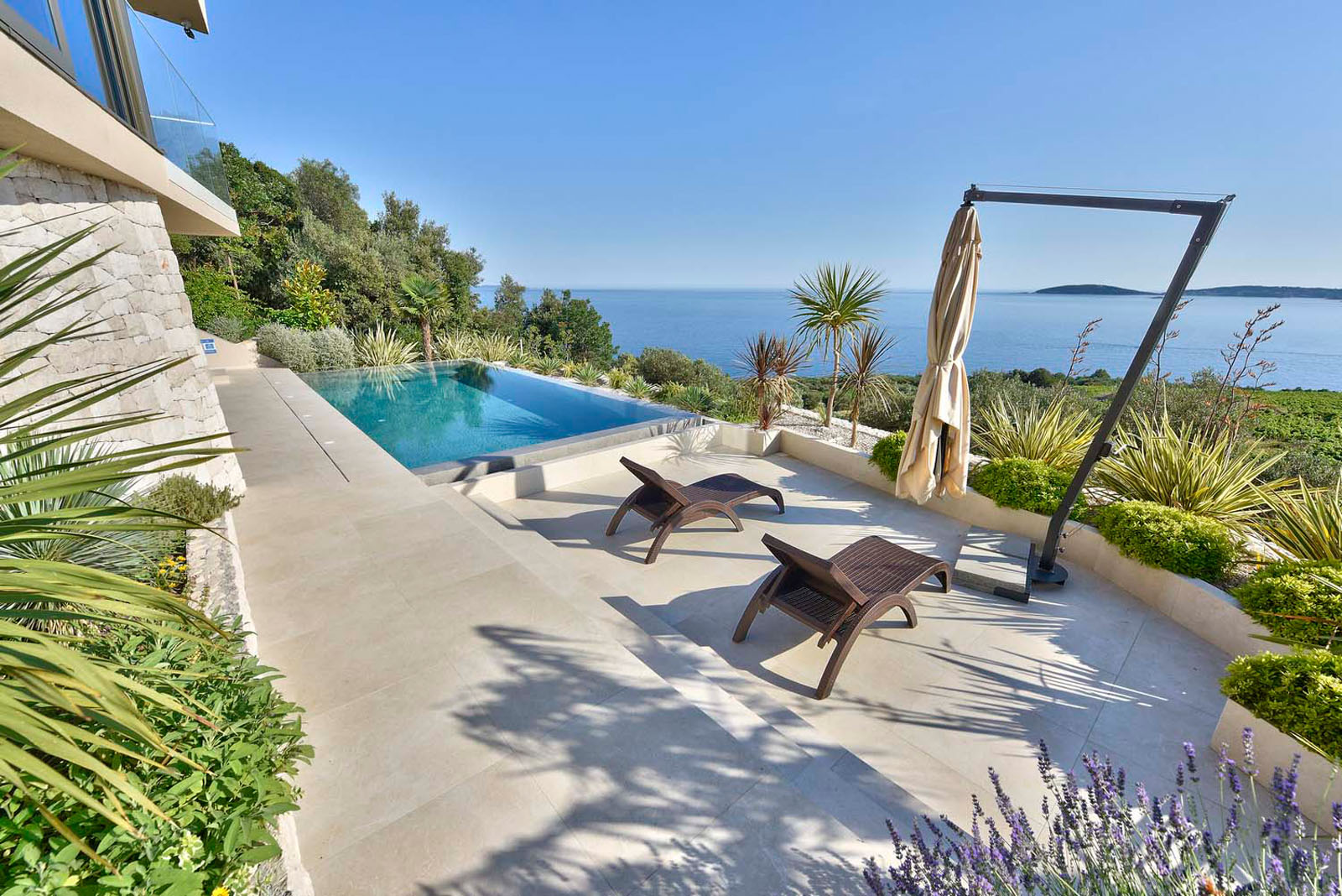 Structura sa urmează orografia terenului, iar acoperișul verde se îmbină cu arborii din jur. Aspectul angular al corpului arhitectural amintește de geometria ascuțită și în același timp grațioasă a peninsulei, deschizându-se prin ferestre mari spre piscina infinită cu o vedere spectaculoasă asupra Mării Adriatice și a insulelor din apropiere.