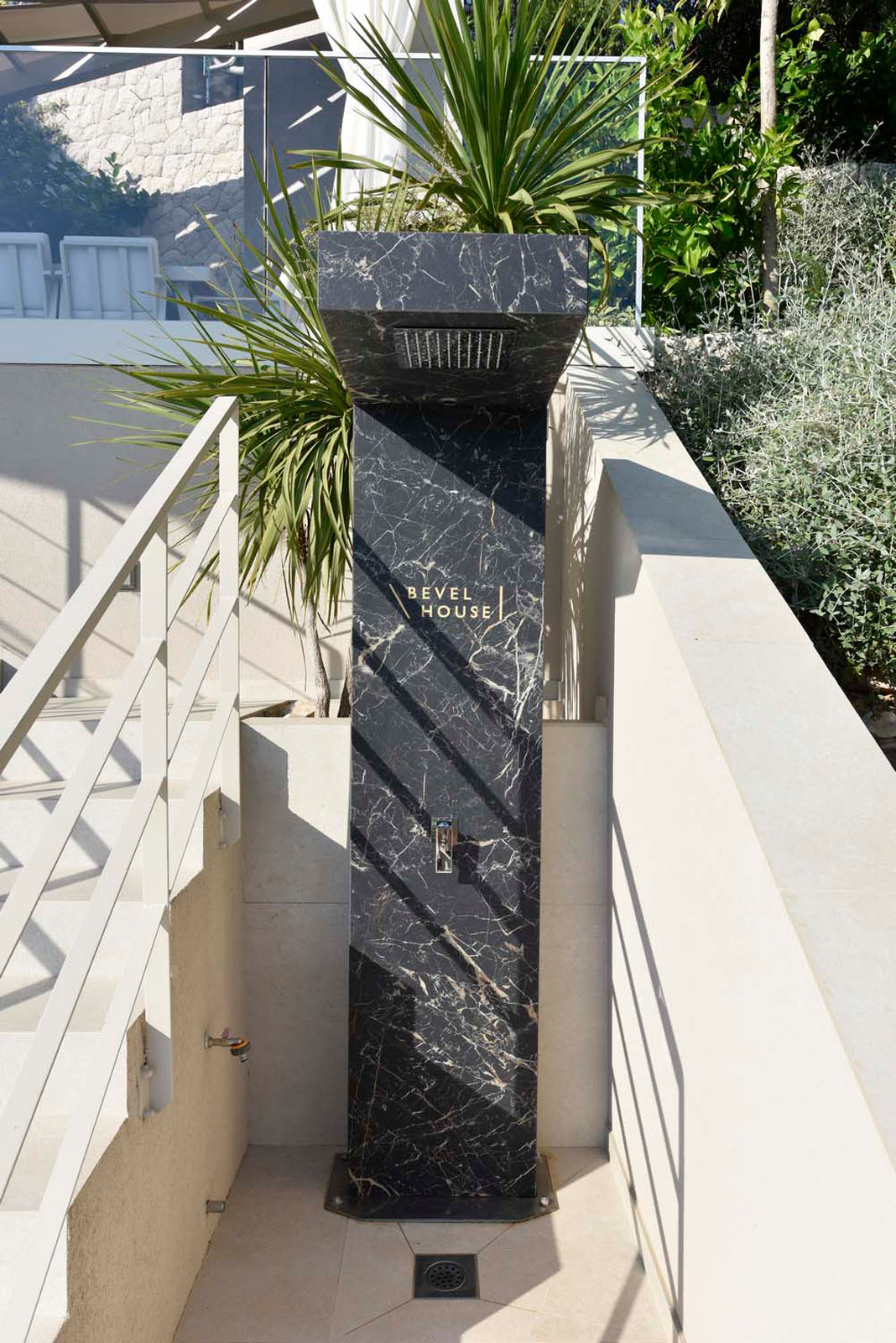 The Top Marble Look, în prețioasa culoare Saint Laurent, a îmbrăcat forma arhitecturală a Luxury Showers produse de Korta Design.