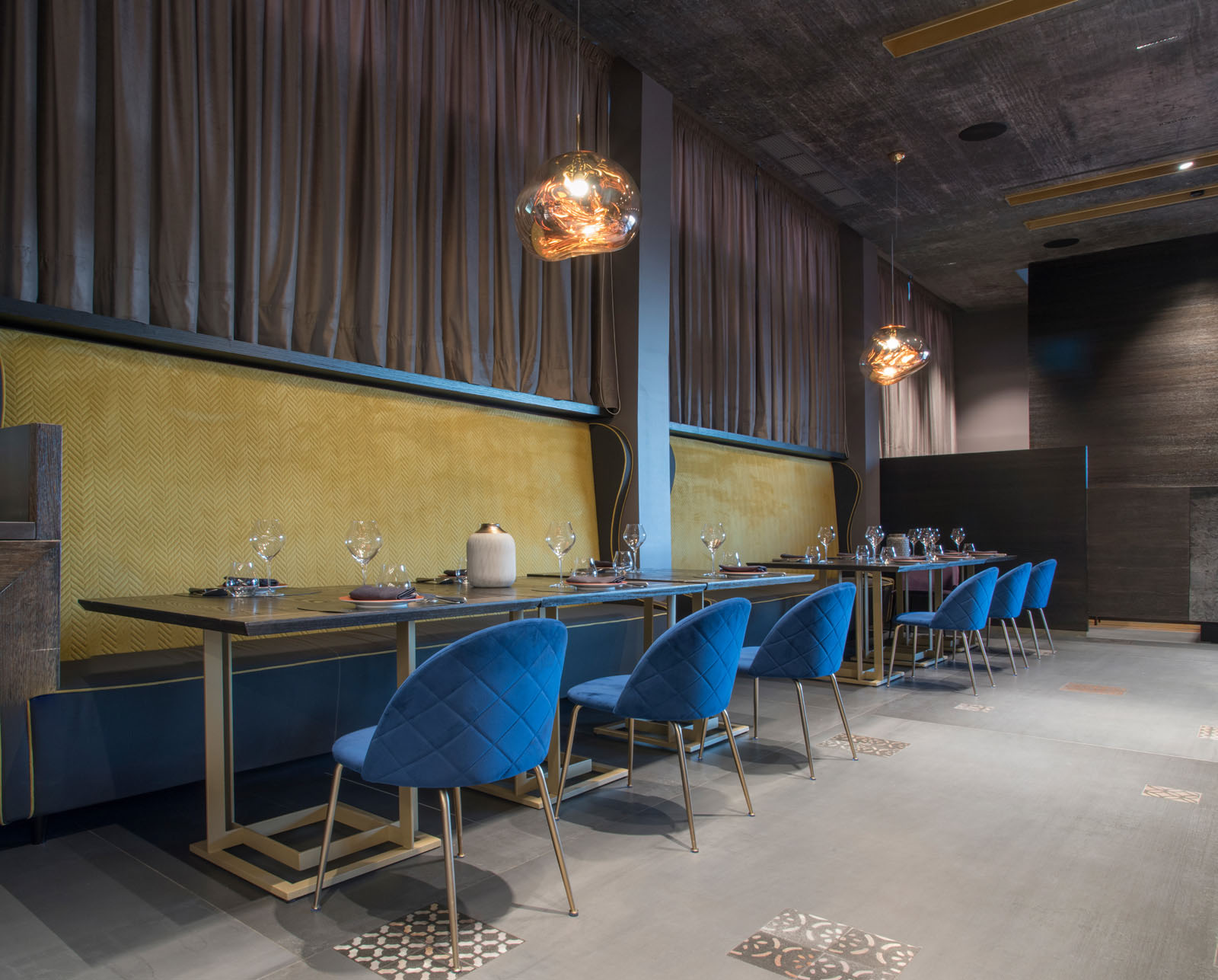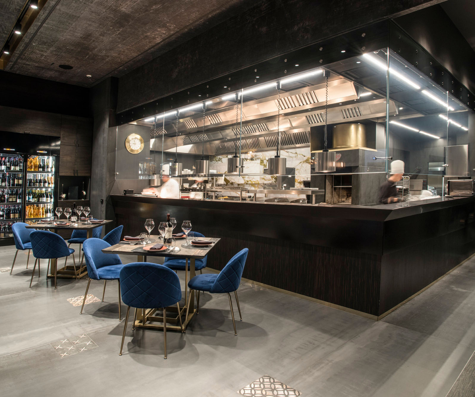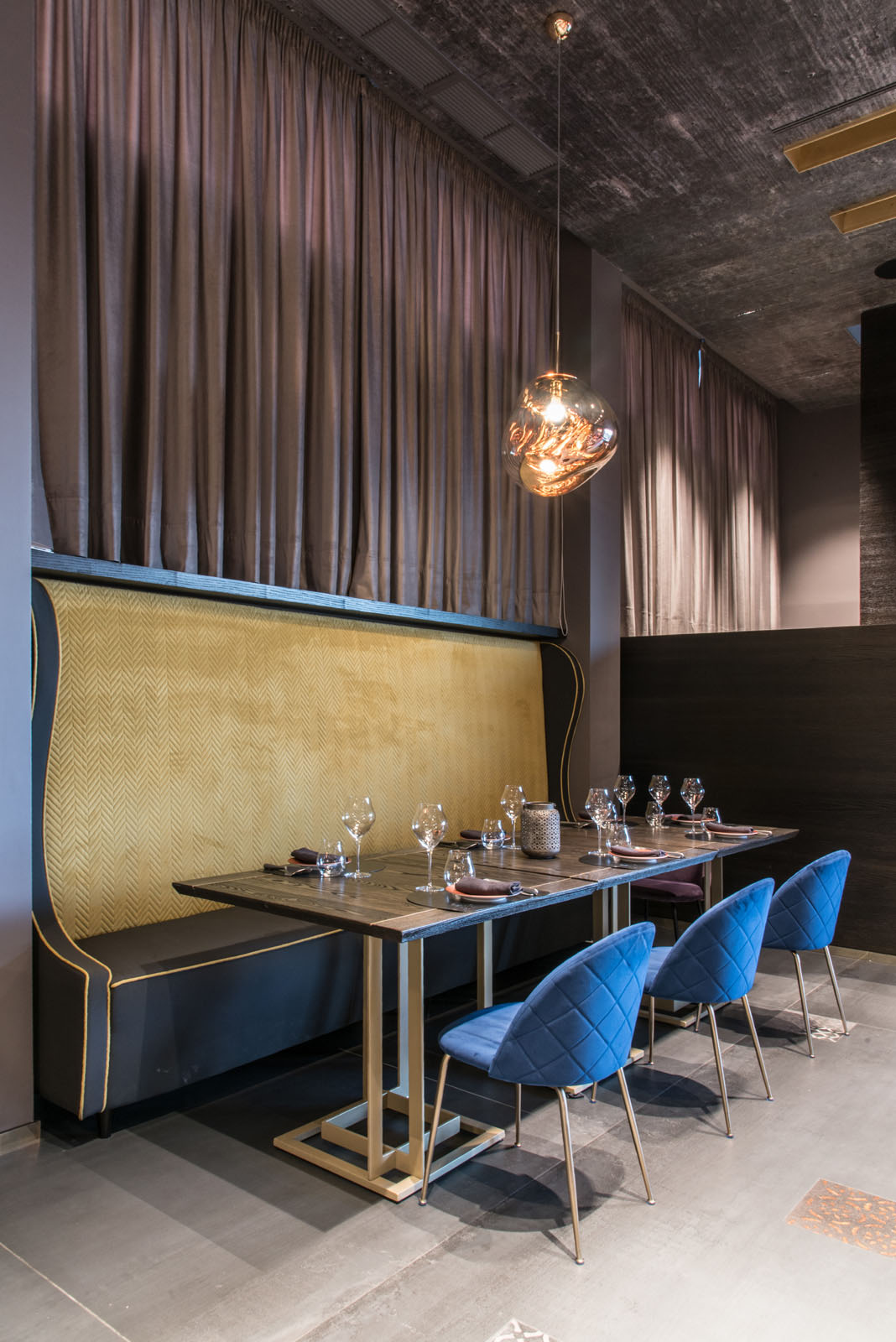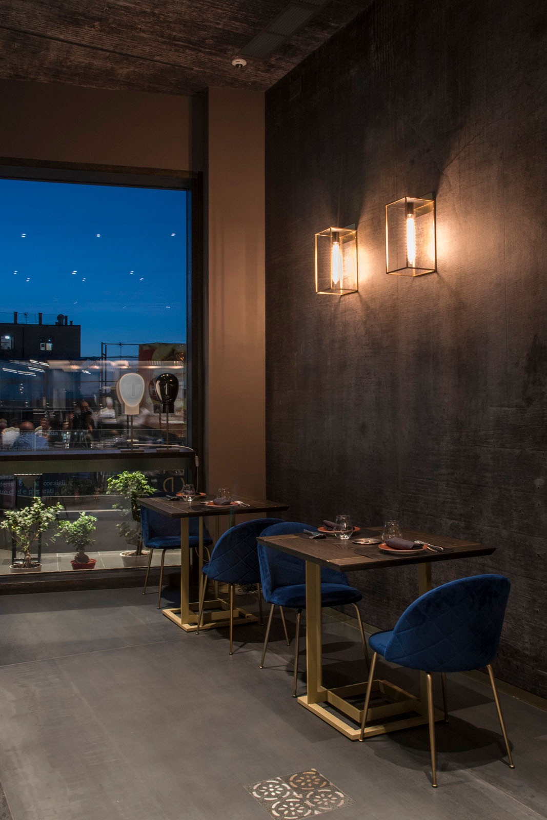 Pentru încăperea magazinului de sandvișuri de la etaj, plăcile mari cu grosime subțire Marazzi Grande Metal Look Iron Dark, cu aspect de metal, au reprezentat o alegere câștigătoare. Datorită formatului mare 160x320 cm al produsului și grosimii sale reduse, de 6 mm, îmbinat cu inserții din material natural, a fost posibilă crearea unui covor mare, cu o textură metalică, fără întreruperea continuității. Reflexiile metalice și inserțiile cu decorații armonizează și încălzesc spațiul, oferind unui mediu industrial o senzație de căldură și atmosferă meditativă.
