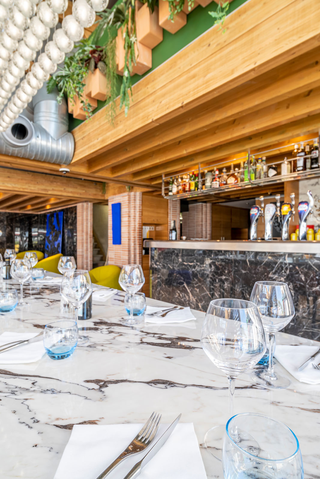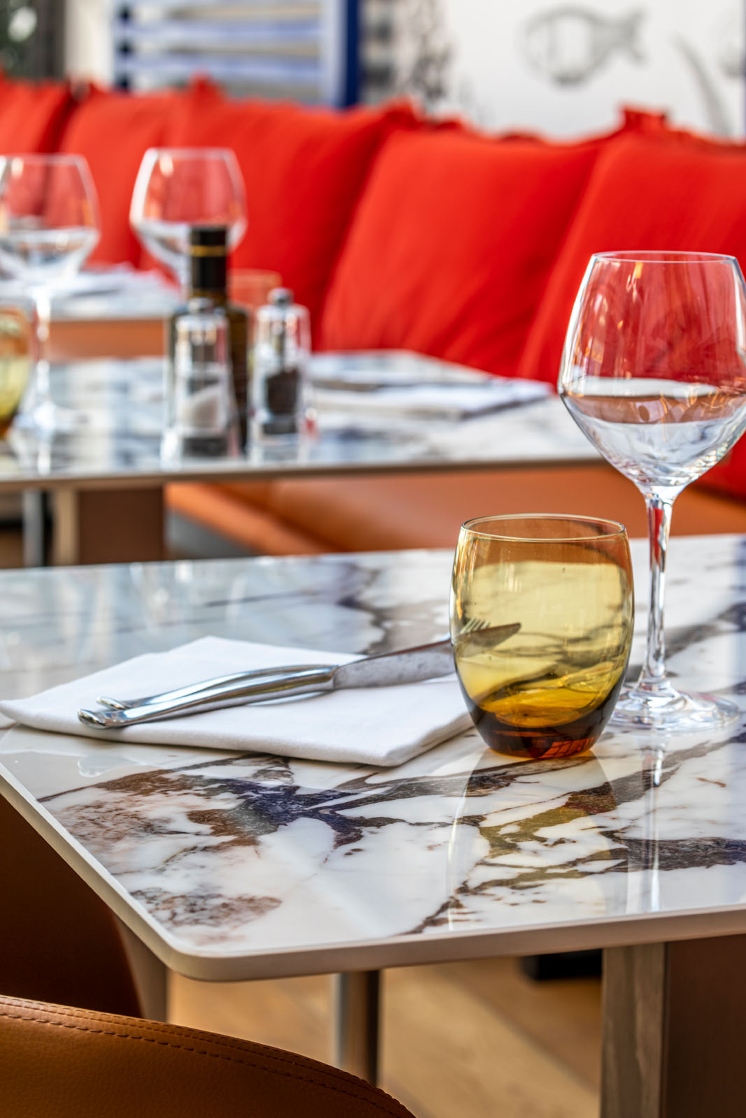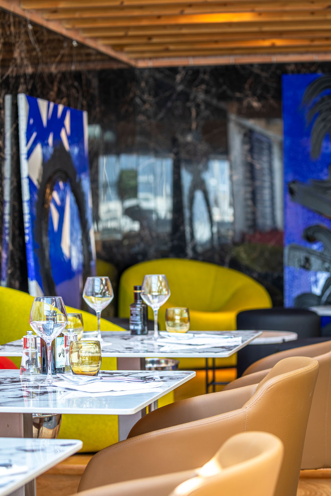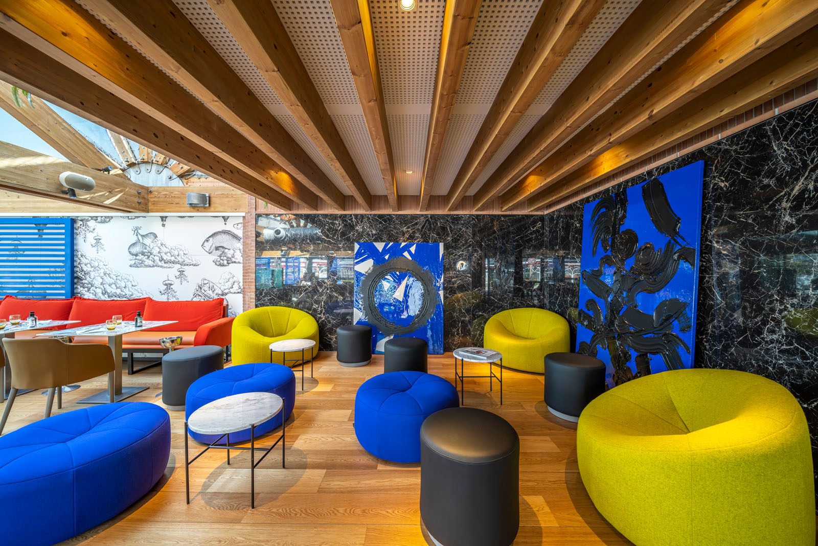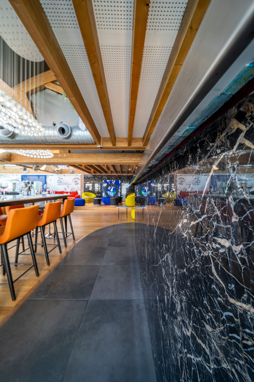 În zona de luat masa, care ocupă aproape tot localul, blatul meselor este placat în gresie porțelanată colorată în masă cu aspect de marmură The Top Marble Look în finisajul lucios Capraia (162x324 cm, 12 mm grosime), folosită și pe peretele cramei în versiunea Grande Marble Look (160x320 cm, 6 mm grosime). Textura lucioasă și întunecată a colecției Grande Marble Look Saint Laurent (120x240 cm, 6 mm grosime) întâmpină oaspeții la tejgheaua barului și acționează ca fundal pentru zona de socializare, animată de scaunele în nuanțe aprinse de puternice galben și albastru.