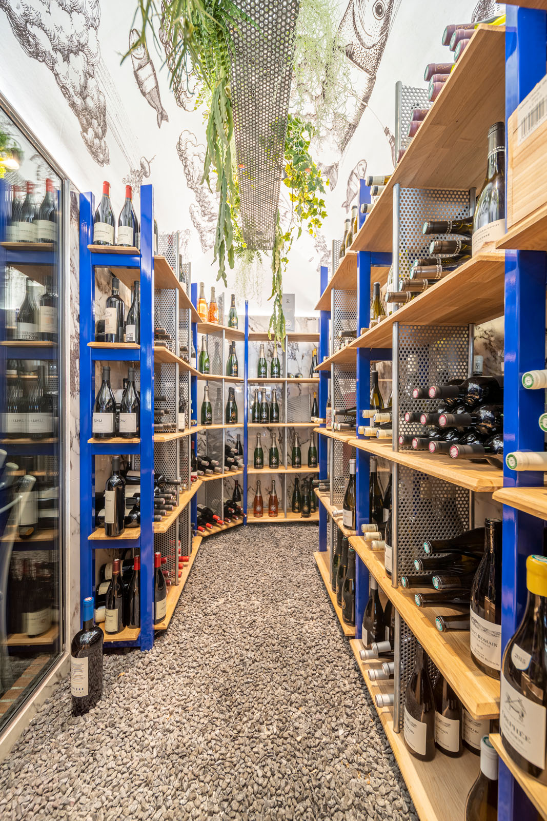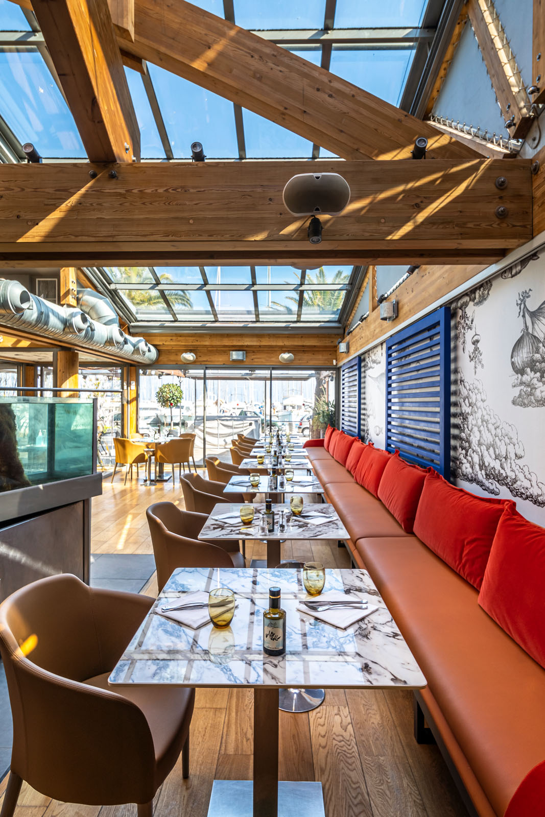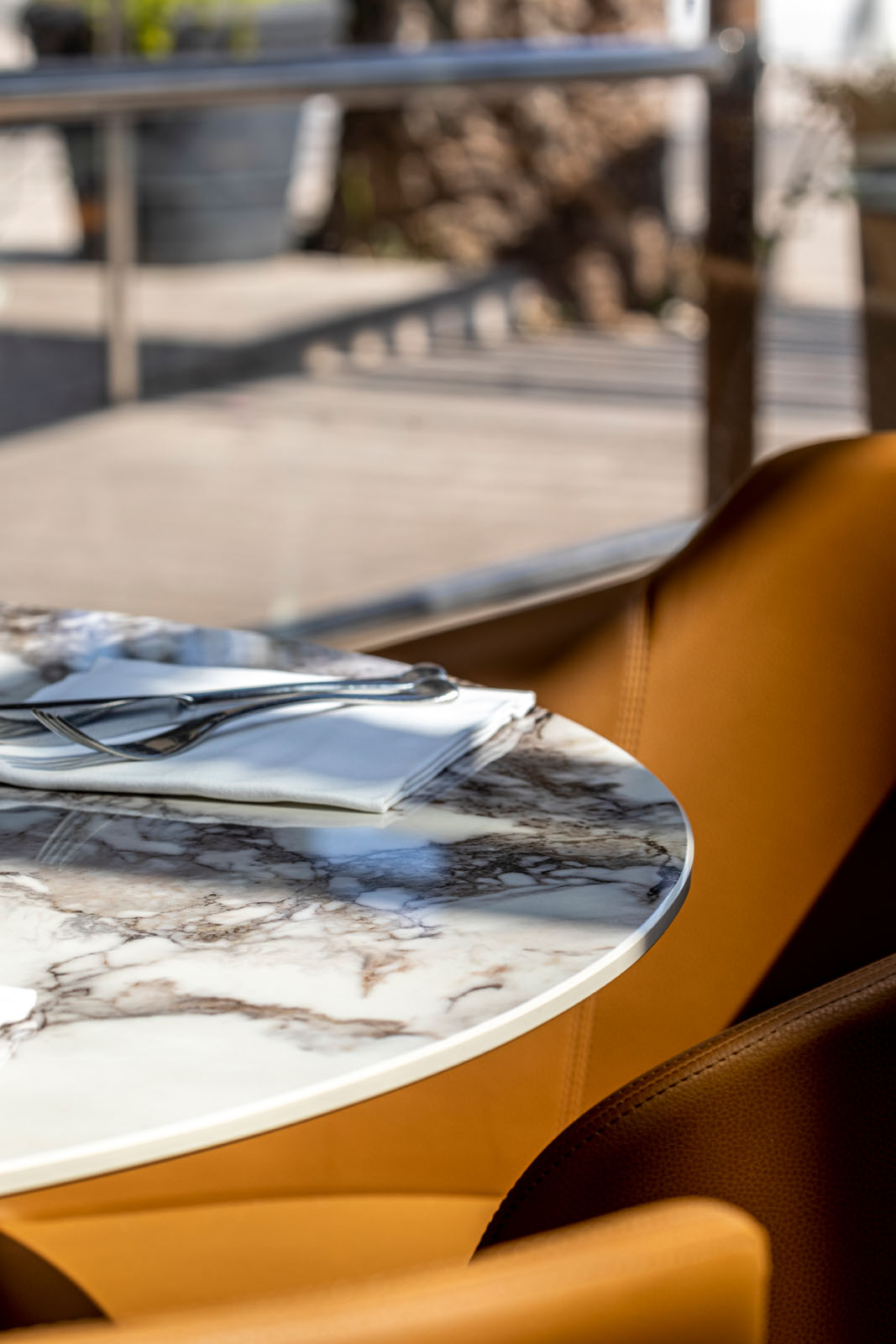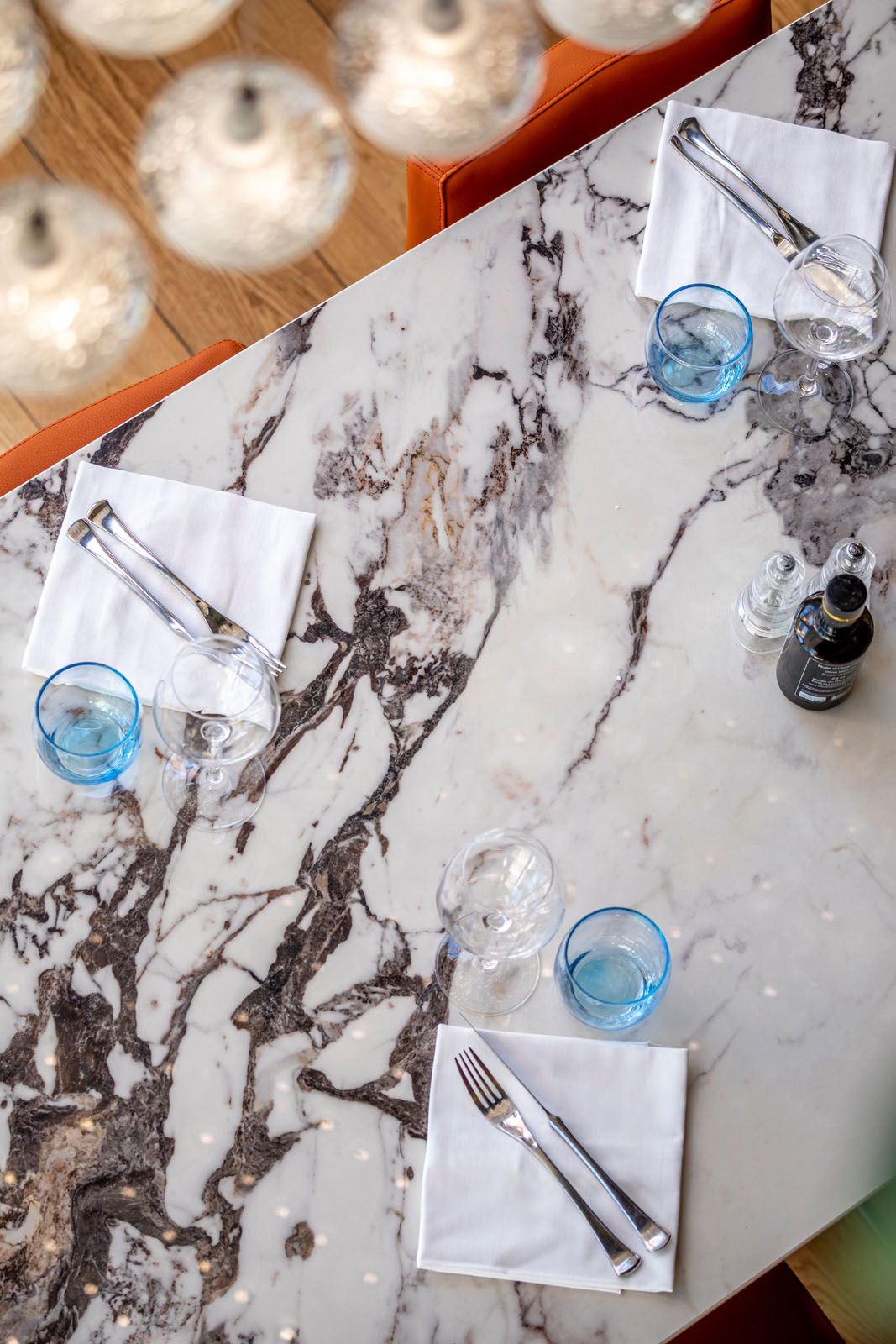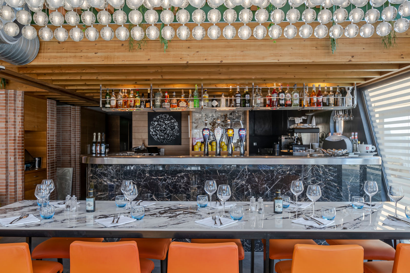 În zona de luat masa, care ocupă aproape tot localul, blatul meselor este placat în gresie porțelanată colorată în masă cu aspect de marmură The Top Marble Look în finisajul lucios Capraia (162x324 cm, 12 mm grosime), folosită și pe peretele cramei în versiunea Grande Marble Look (160x320 cm, 6 mm grosime). Textura lucioasă și întunecată a colecției Grande Marble Look Saint Laurent (120x240 cm, 6 mm grosime) întâmpină oaspeții la tejgheaua barului și acționează ca fundal pentru zona de socializare, animată de scaunele în nuanțe aprinse de puternice galben și albastru.