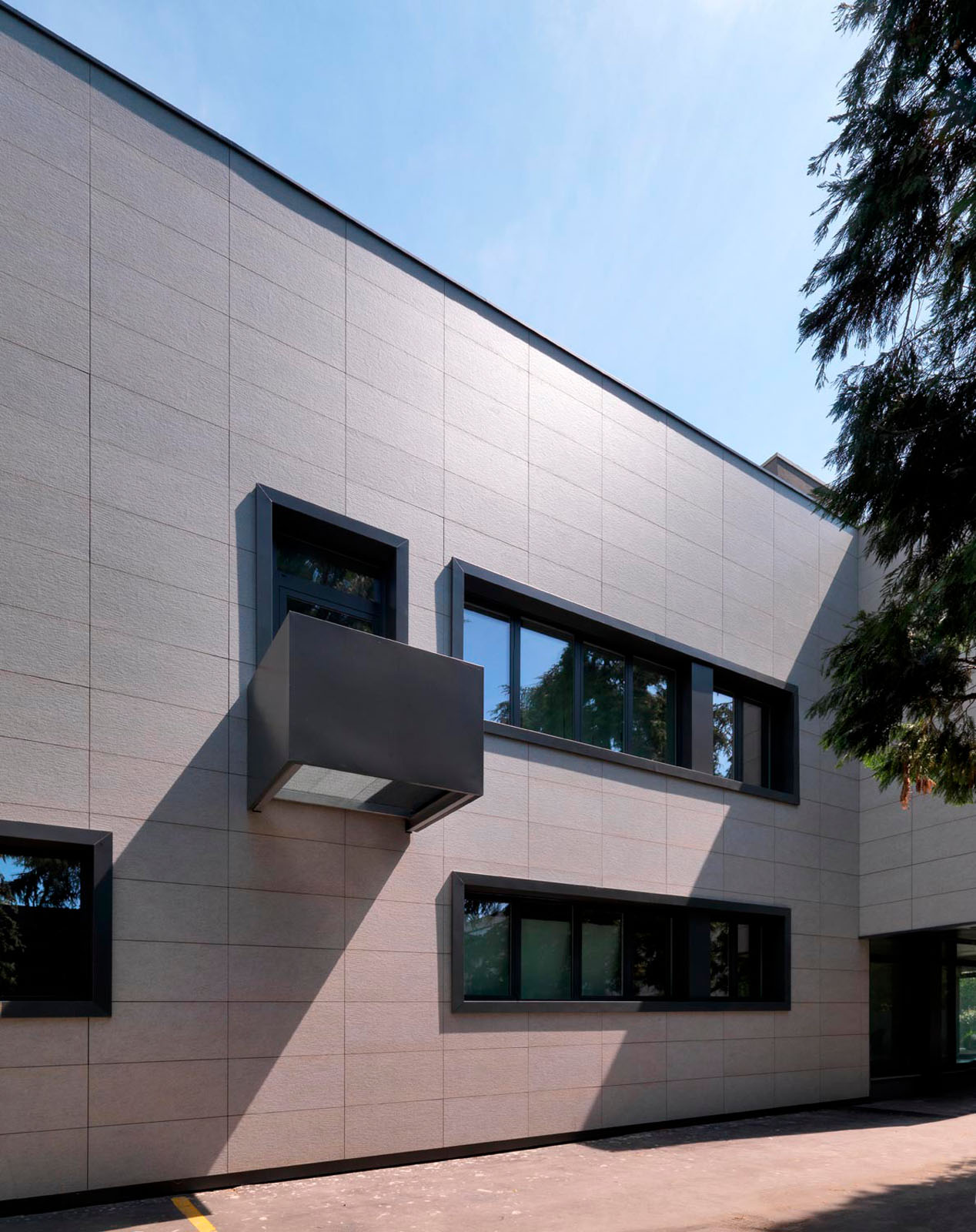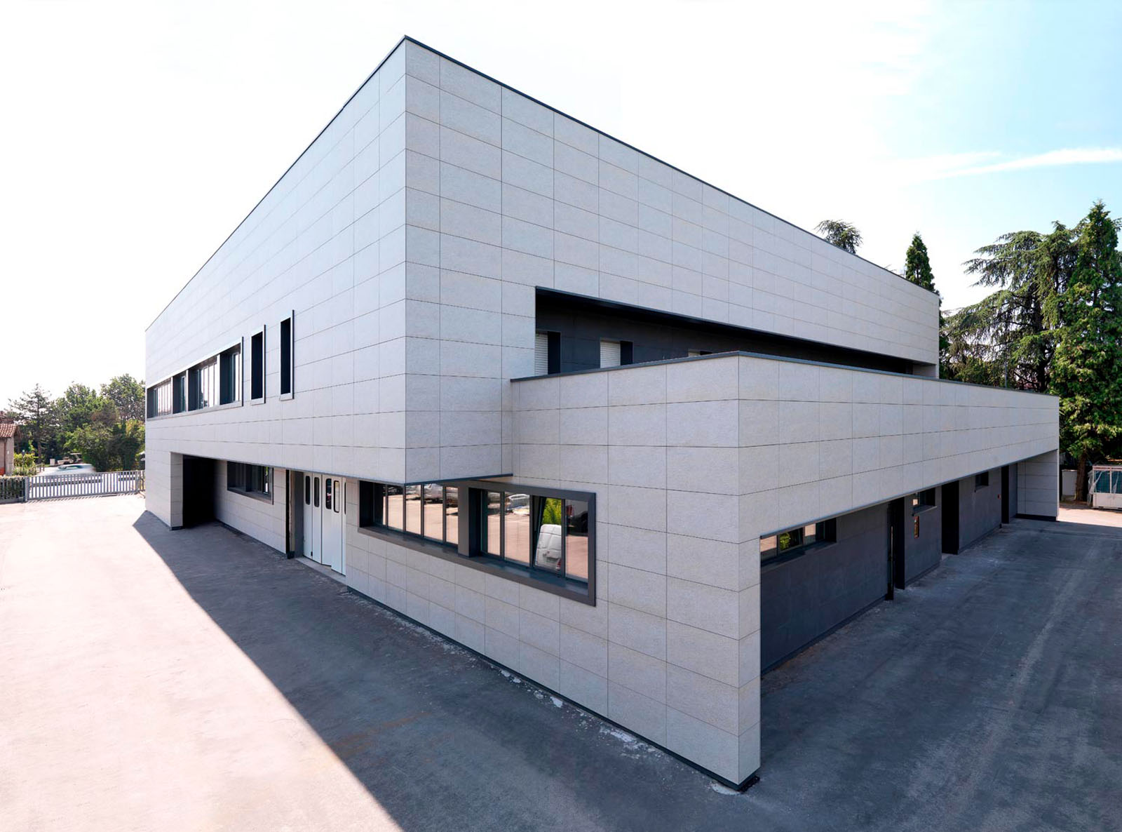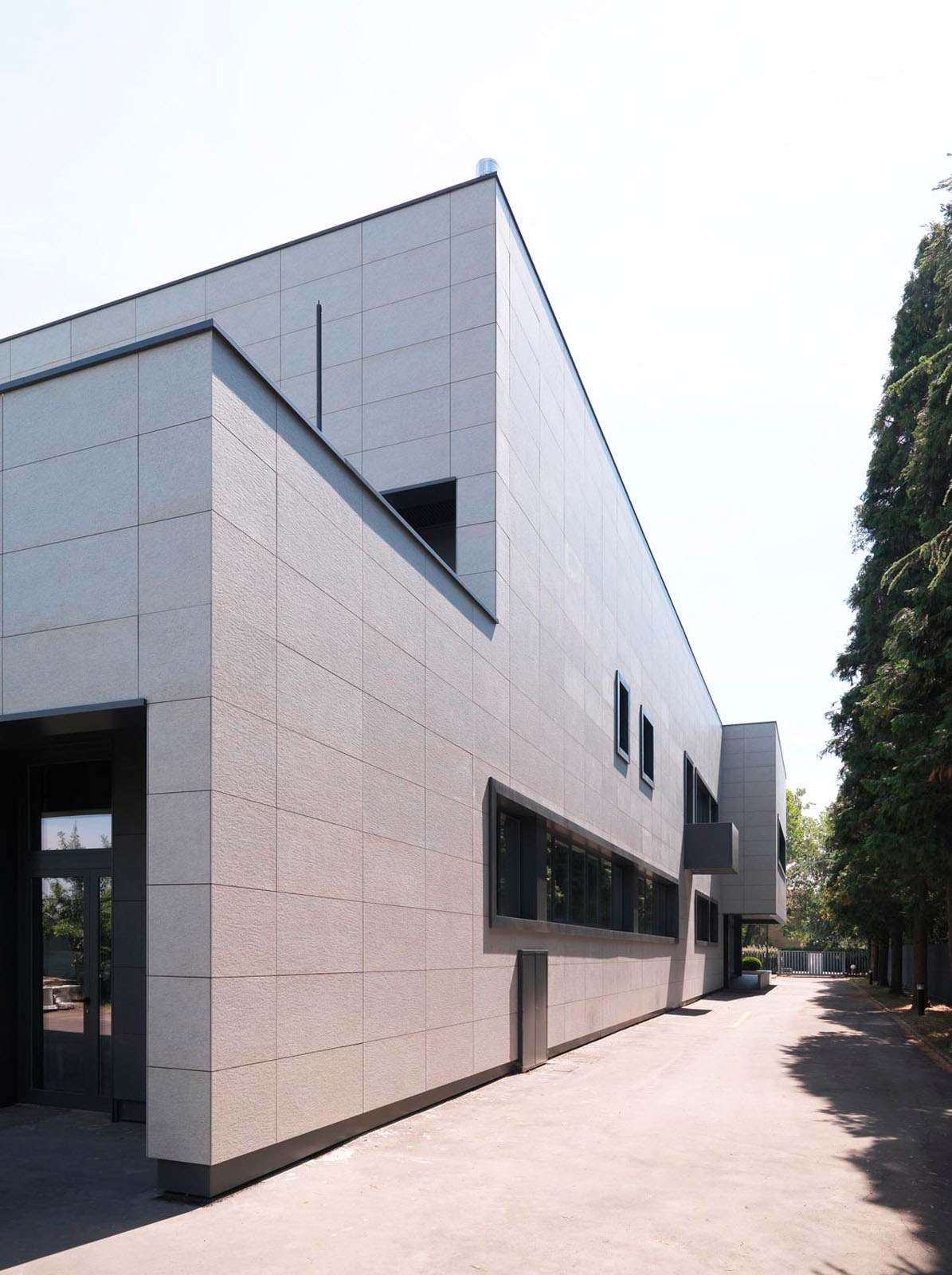 Fără a demola structura preexistentă, clădirii i-a fost dată o formă cu totul nouă, un raport volumetric mai esențial și mai curat, utilizând sistemul de perete ventilat Marazzi Engineering care a contribuit la realizarea a două importante obiective, reabilitarea energetică, obținută prin rezolvarea gravelor defecte de izolație prezente în vechea hală, și o nouă recognoscibilă calitate arhitectonică a clădirii.