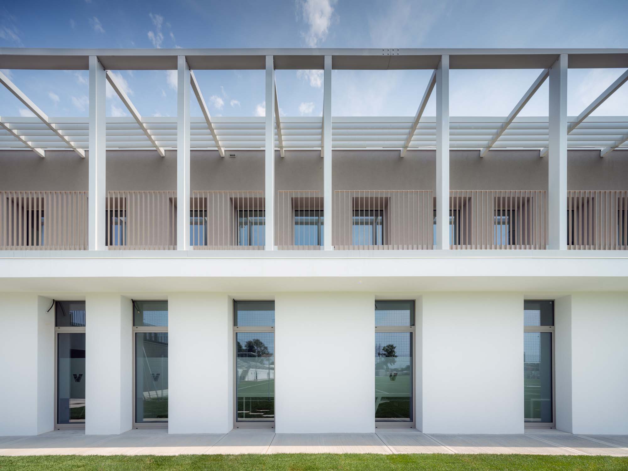Un element arhitectural distinctiv al proiectului este loggia care înconjoară clădirea, oferind vederi panoramice asupra terenurilor de fotbal din jur. Pentru exterior, designerii au optat pentru o pardoseală plutitoare, folosind aceeași colecție cu aspect de ciment în format 60x120 cm în versiunea de 20 mm (Cementum20). Pardoseala supraînălțată este o tehnologie extrem de eficientă, deoarece permite crearea unui volum tehnic continuu sub suprafața circulabilă, în care pot fi adăpostite instalațiile.