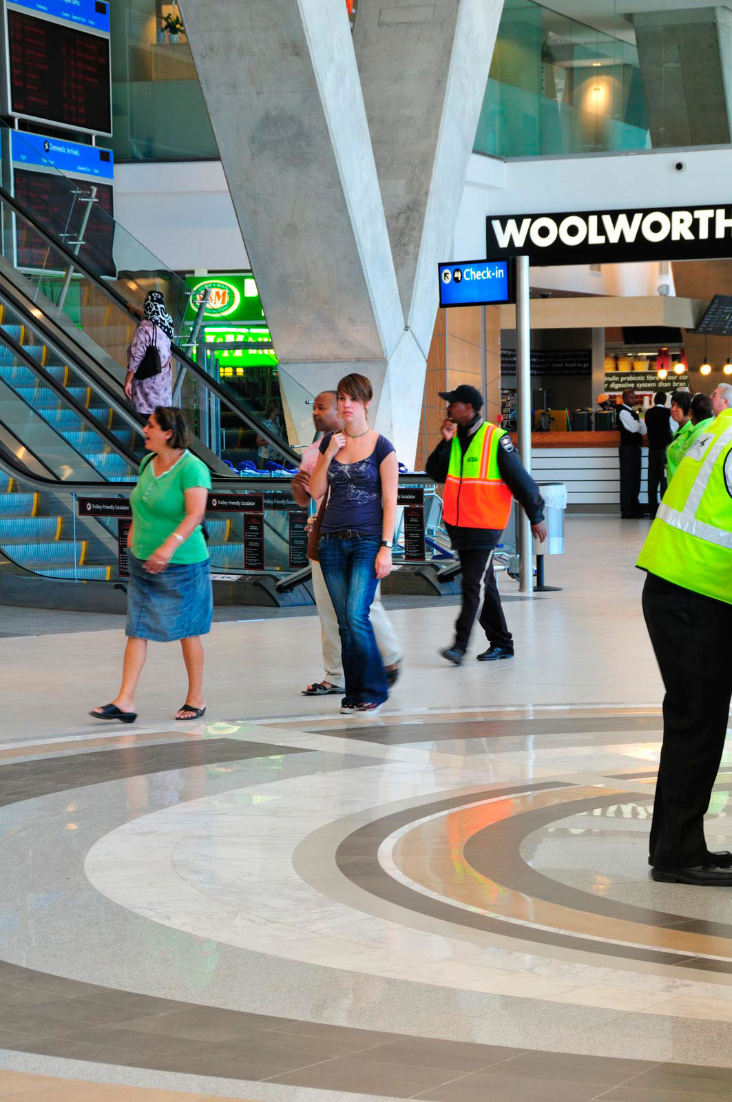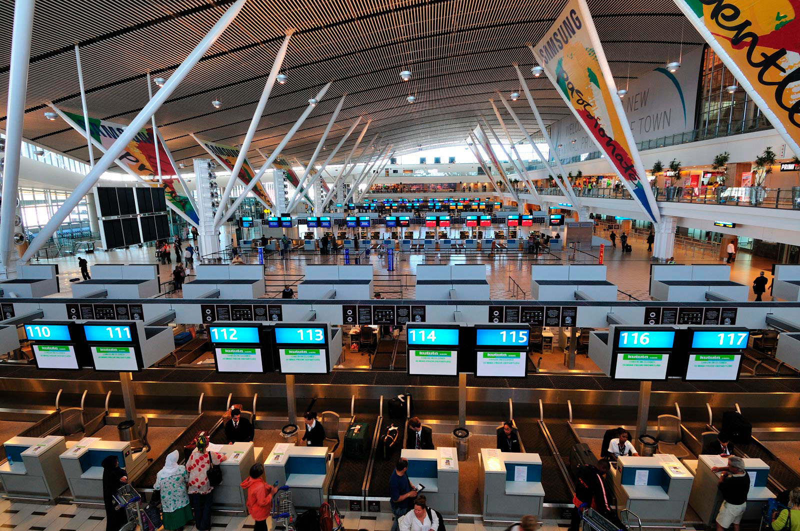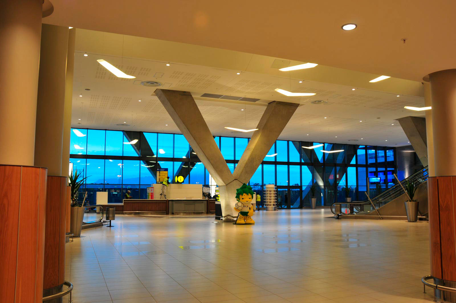 Inaugurat complet cu o lună mai devreme de Mondiale, marele paralelipiped cu sticlă a conectat cele două aripi preexistente dedicate traficului local și internațional, în parte reabilitate, și constituie motorul terminalului, datorită eficientului sistem centralizat de dirijare a fluxului de pasageri și bagaje care ocupă întreaga sală a primului etaj. Acoperit de un amplu acoperiș curbat, tăiat în fața intrării de o copertină cu două aripi, clădirea constituie un landmark urban cu personalitate decisă dar nu invazivă. Aproape o anticipare a interioarelor sale elegante și luminoase, marcate la maximum de confort și unificate vizual de nu mai puțin de 40.000 de mp de pardoseală din gresie porțelanată a seriei GM de la Marazzi, cerută în mod special de constructori care doreau că pună în valoare proiectul cu ceramici valoroase cu design Made in Italy. Suprafața ușor structurată a gresiei evocă țesătura pietrei și satisface înaltele cerințe de rezistență la uzură și la alunecare indispensabile într-un loc cu trafic intens care va primi 15 milioane de pasageri pe an până în 2015.