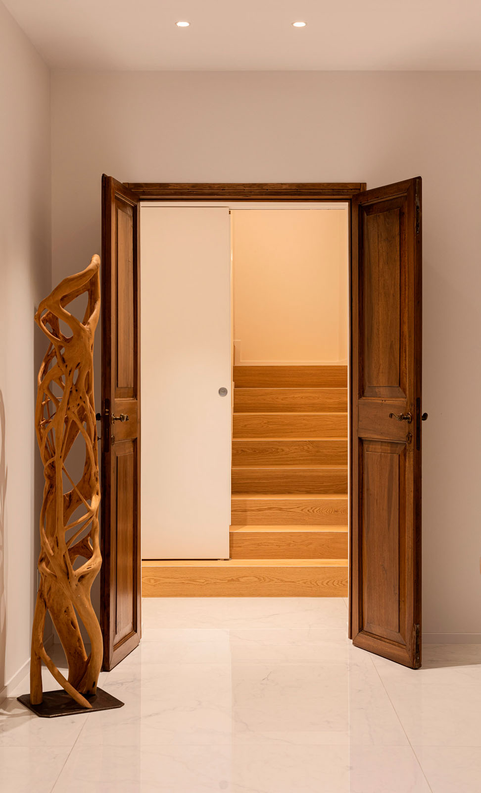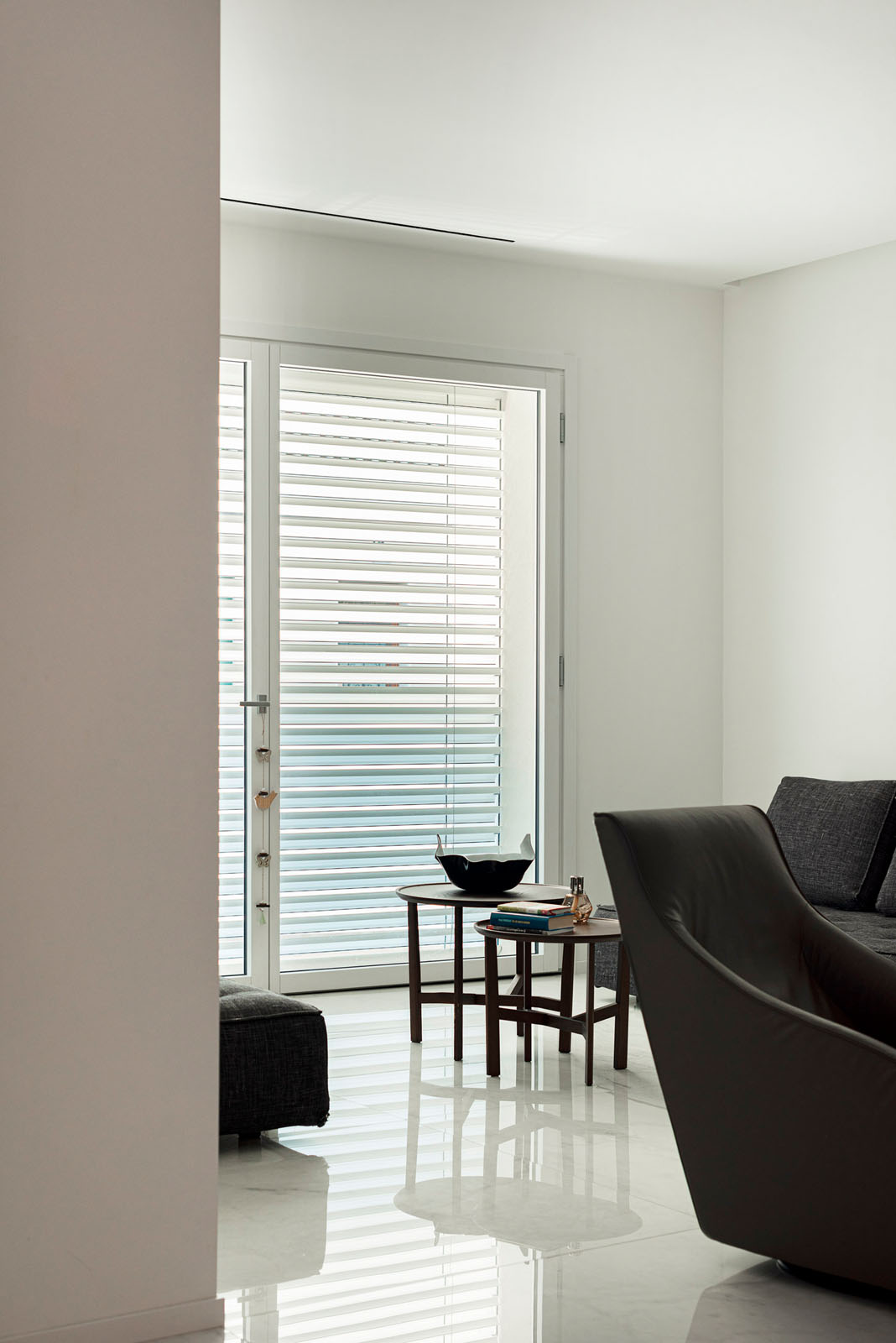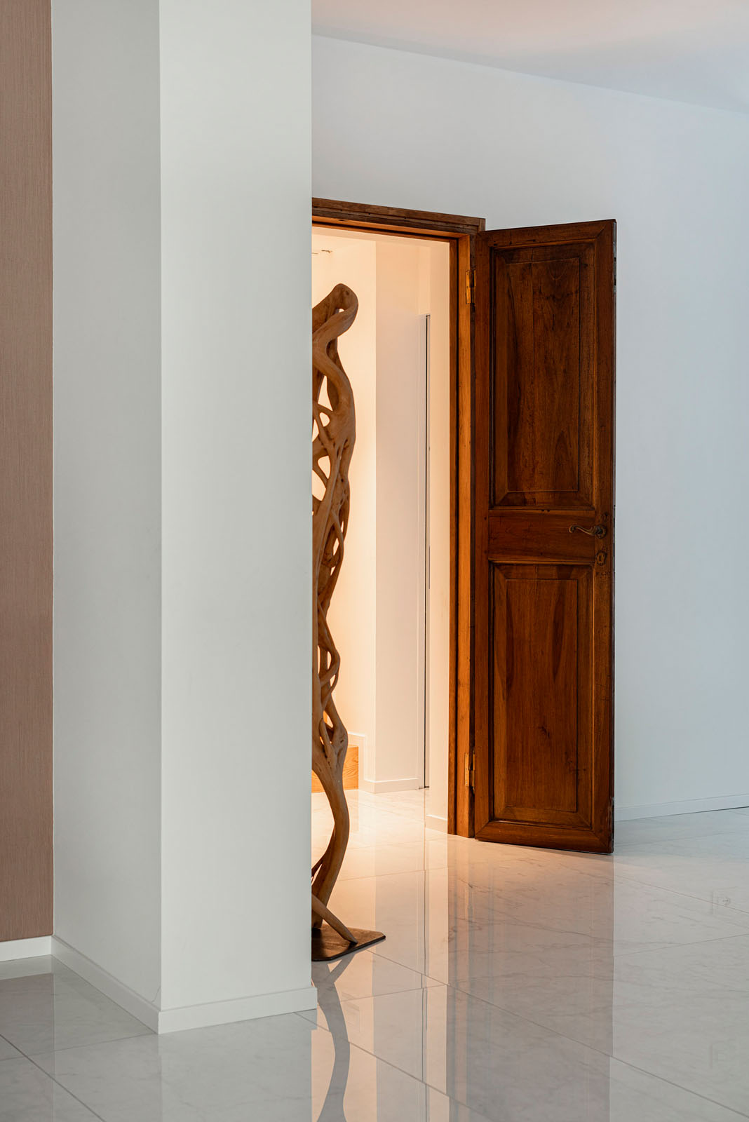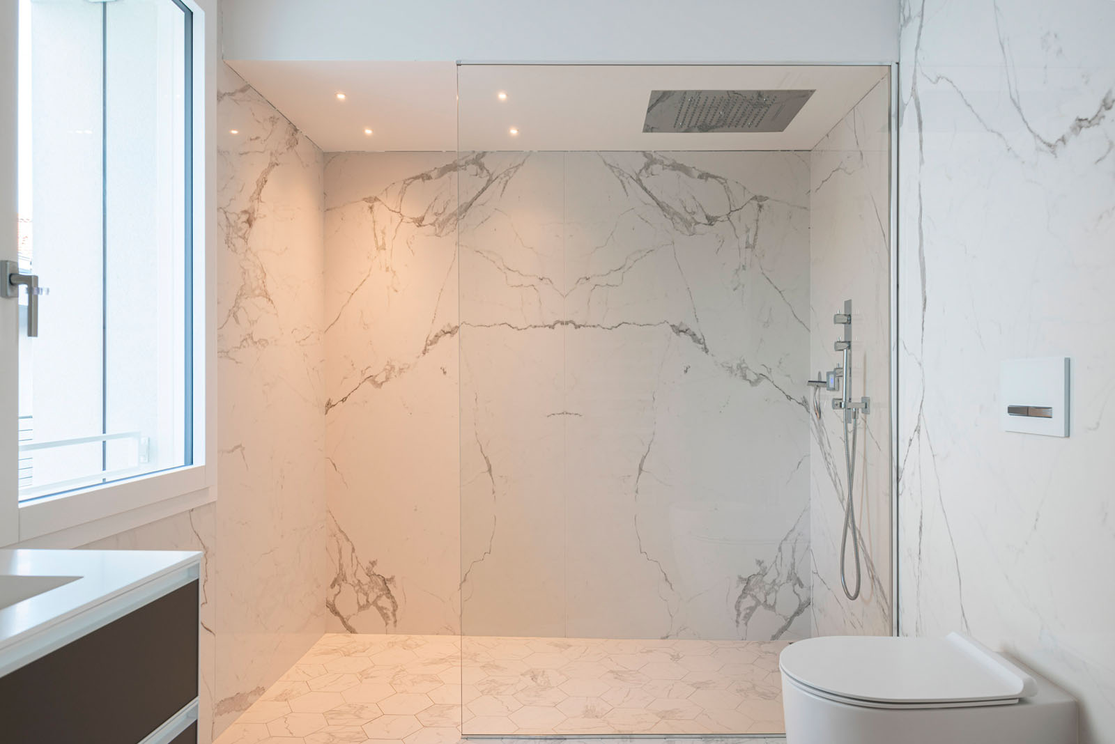 Restaurarea acestor părți a fost însoțită de căutarea uniformității materiale și a aspectului esențializat. În interior, materialele și culorile deschise generează un spațiu neutru: folosirea gresiei porțelanate de un alb monocrom cu nervuri gri din linia Grande Marble Look Statuario, format 120x120, pentru pardoseli și 120x240 Book Match pentru placarea băii, conferă luminozitate spațiului. La exterior, podelele au fost realizate cu colecția Mystone Limestone, grosime de 20 mm, nuanța Ivory, format 60x120, folosind tehnologia pardoselii supraînălțate, sistem care combină elemente modulare și permite crearea unui volum tehnic continuu sub suprafața circulabilă. Această colecție de gresie porțelanată, care reproduce o piatră cu origini străvechi, se remarcă prin caracteristicile sale tehnice de înaltă performanță și prin performanțele antiderapante obținute cu noua tehnologie StepWise. În plus, datorită procesului de producție ce folosește 40% material reciclat, care contribuie la obținerea Creditelor LEED® și a certificării Greenguard Gold pentru emisii scăzute de compuși organici volatili în aerul interior, colecția Mystone Limestone reprezintă o alegere sustenabilă.