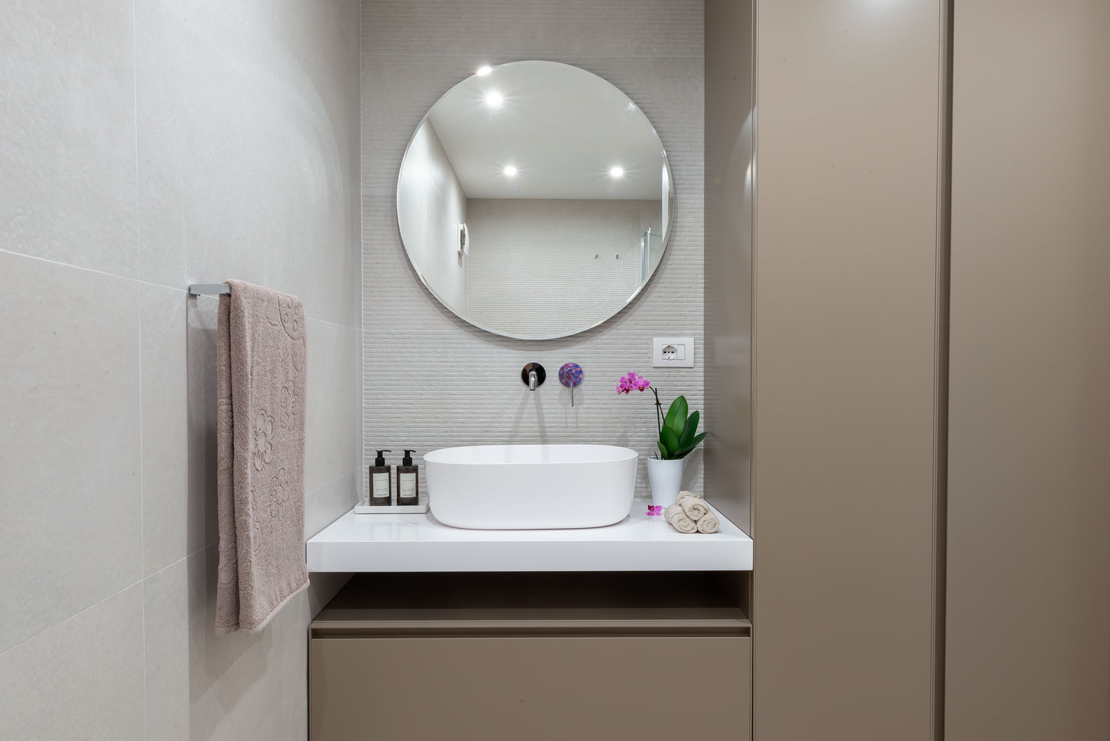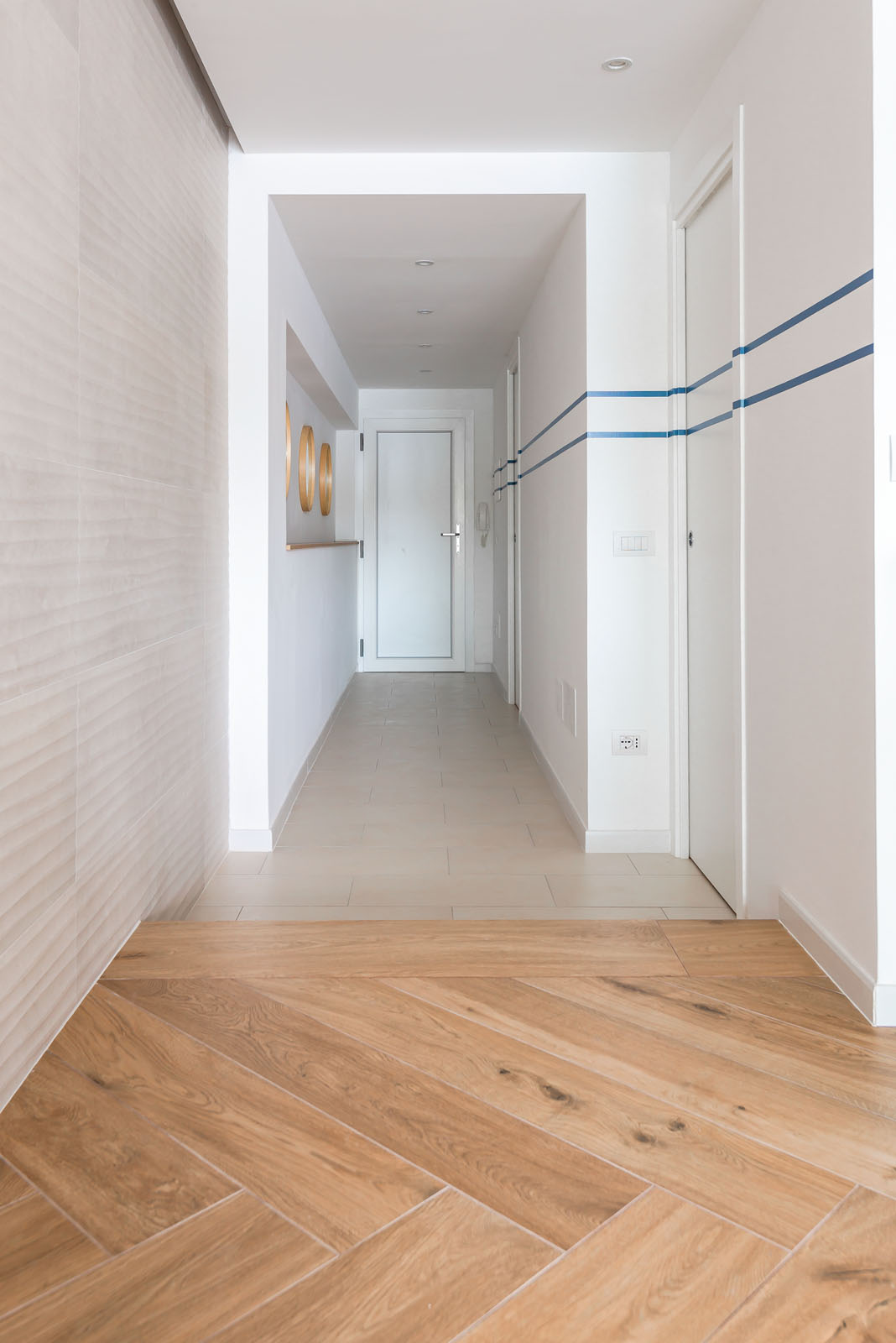 Pentru zona de zi, pentru pardoseală, a fost aleasă gresie porțelanată cu aspect de lemn Vero Natural, așezată în zigzag, în formatul 20x120 cm, o colecție sustenabilă deoarece este realizată din material reciclat 40% și cu tehnologia Sublime Sync, datorită căreia designul se potrivește perfect în textura materialului, în timp ce colecția Stone_Art Steel în versiunea structură Move 3D este folosită ca placare a peretelui pentru a reaminti desenele provocate de valurile mării pe nisip.