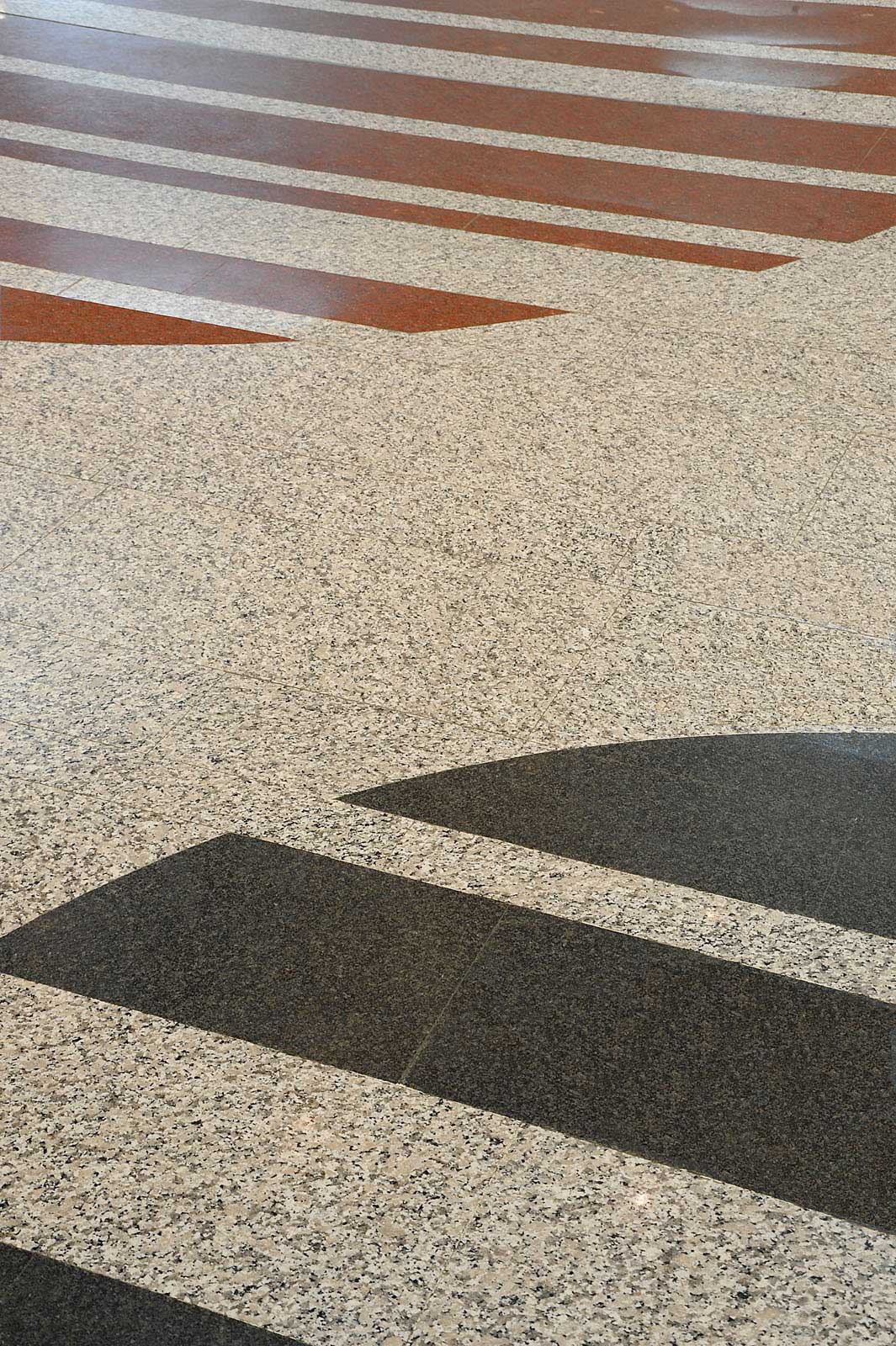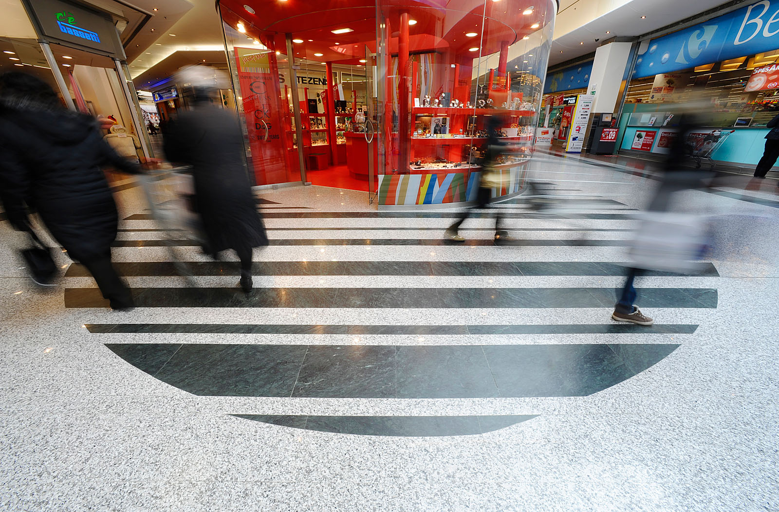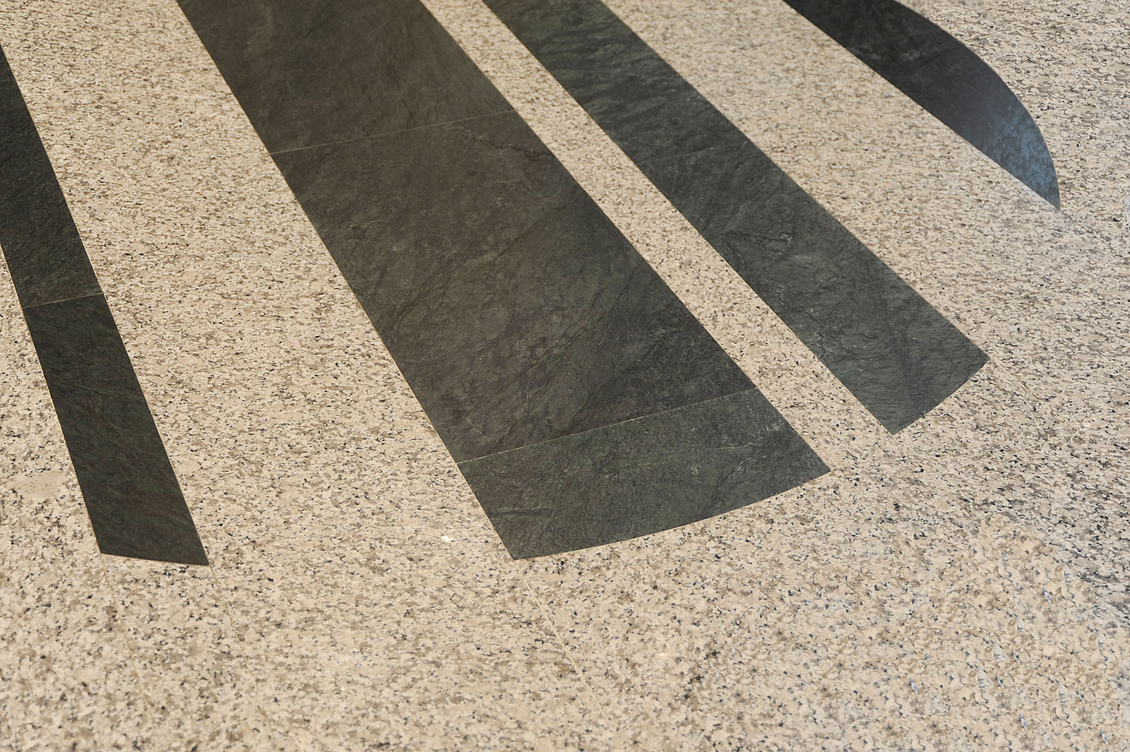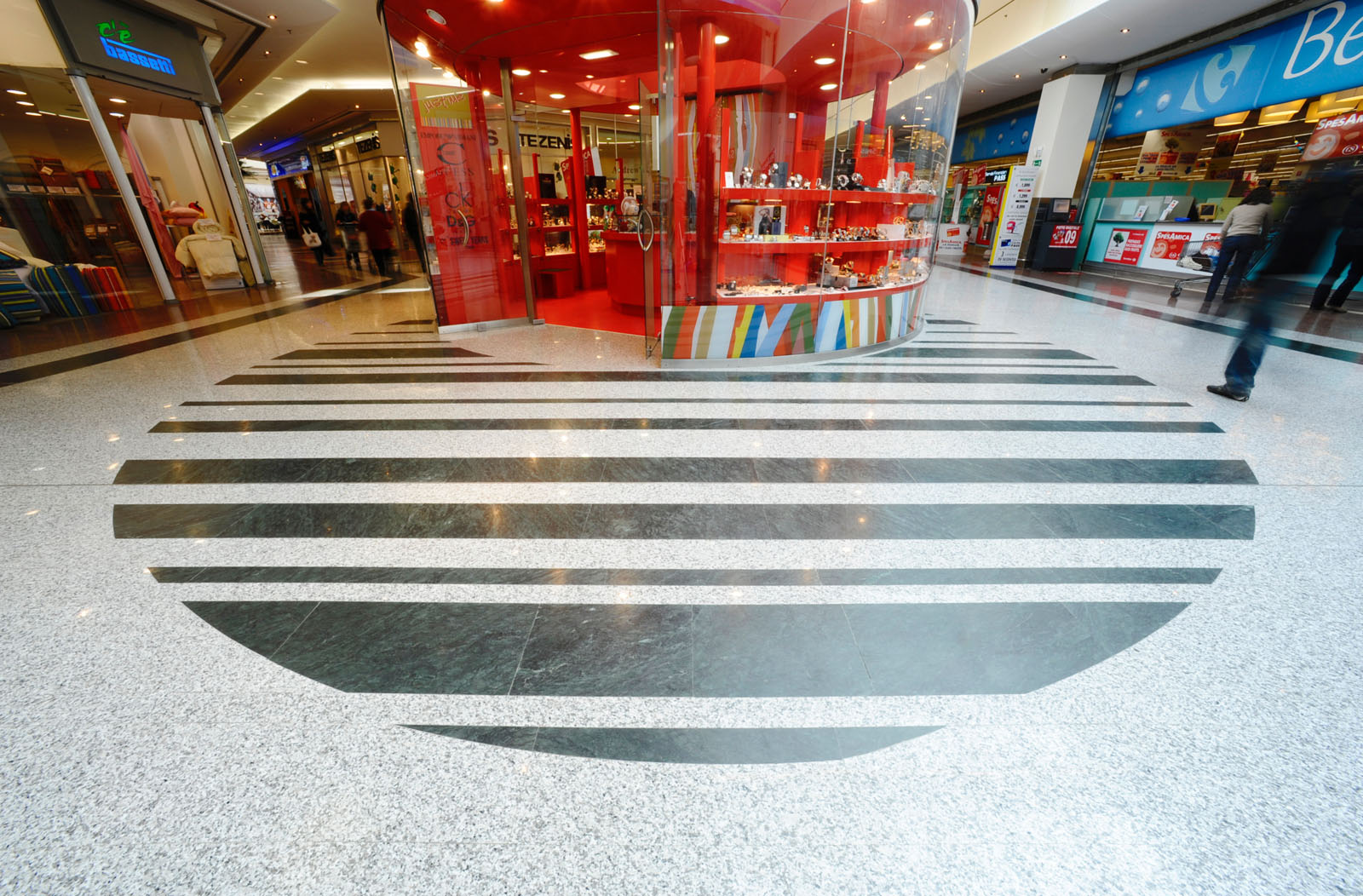 Plăcile subțiri, cu patru lărgimi diferite, au fost montate end-to-end cu marginile unite, o grijă specială cerând executarea cercurilor mari care reproduc logo-ul centrului comercial, pentru care s-a apelat la tăierea de precizie cu jet de apă. Toate pietrele au fost furnizate lucioase, pentru a asigura maxima omogenitate a tonalităților și lustruite din nou după montare.