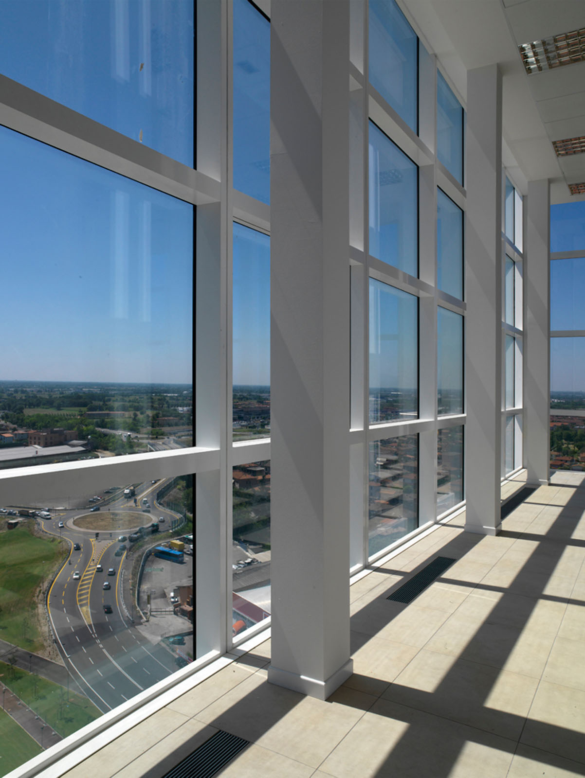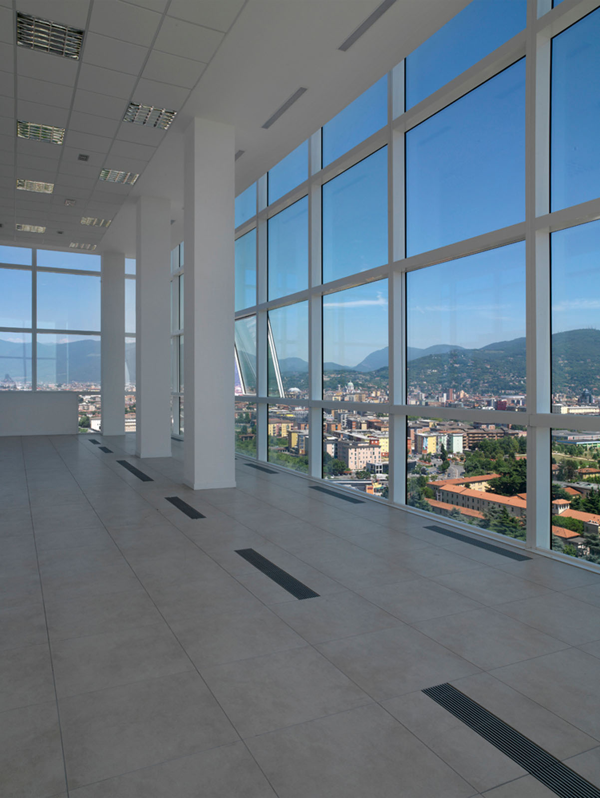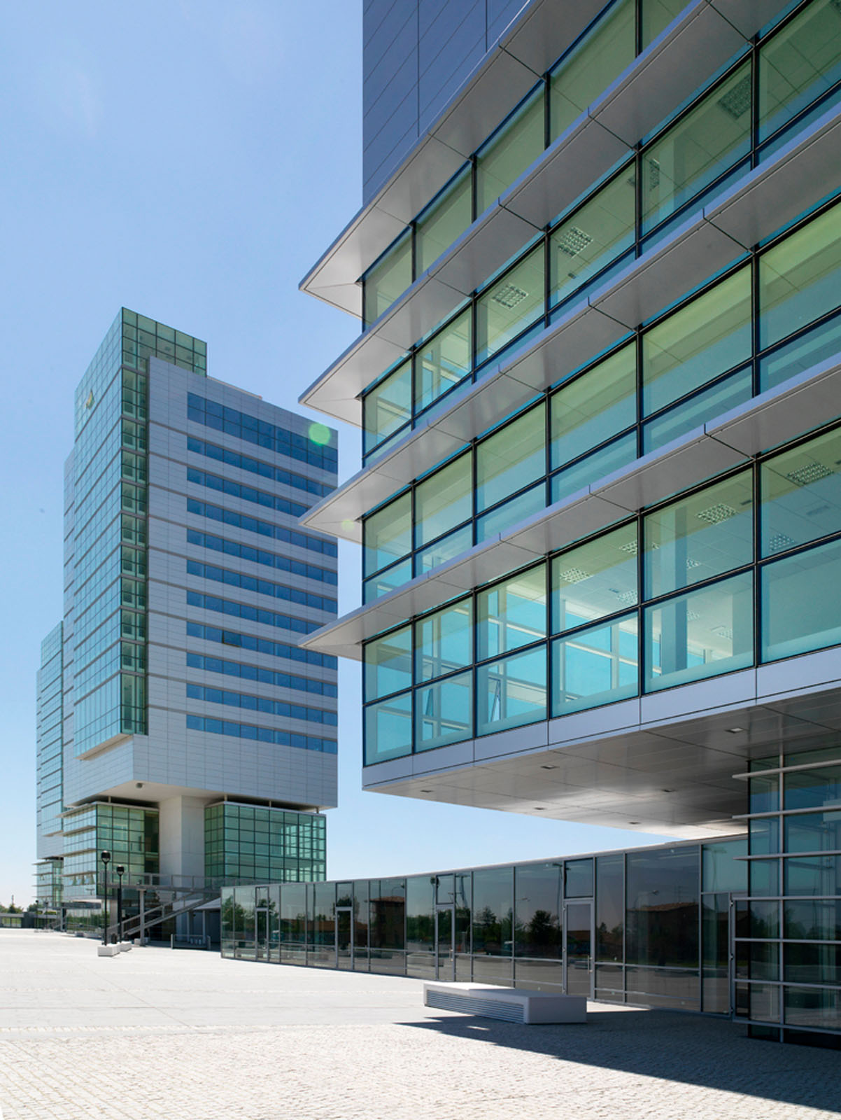 Cele trei turnuri destinate sectorului terțiar, interconectate cu parterul unei piețe la care se alătură serviciile și spațiile de restaurante, răsar într-un cartier în nouă expansiune legat direct la rețeaua de autostrăzi locală. Profilurile înalte ale clădirilor se ies în evidență pe orizontala plată a companiei cu ambiția de a deveni noi obiective turistice urbane. Luminoasele loft-uri vitrate, toate cu dublă înălțime, necesitau o pardoseală cu estetică sobră și cu culori moi, capabile să pună în valoare raționalitatea liniilor fără a interfera cu amplele vederi ale peisajului și ale orașului. Marazzi Engineering a furnizat și instalat pardoselile supraînălțate ale tuturor etajelor superioare, realizate cu plăci de gresie porțelanată smălțuită Marazzi aplicate pe panouri de sulfat de calciu cu grosimea de 30 de mm. Împreună cu tehnicile companiei constructoare (care era și beneficiar) au fost proiectate cu atenție și tăierile în pardoseală în care să se introducă orificii de aerisire pentru extragerea aerului din camera de dedesubt. Un aspect relevant al intervenției a constat în respectarea întocmai a programelor de montare, încadrate în termene foarte comprimate legate destinația comercială a imobilelor.