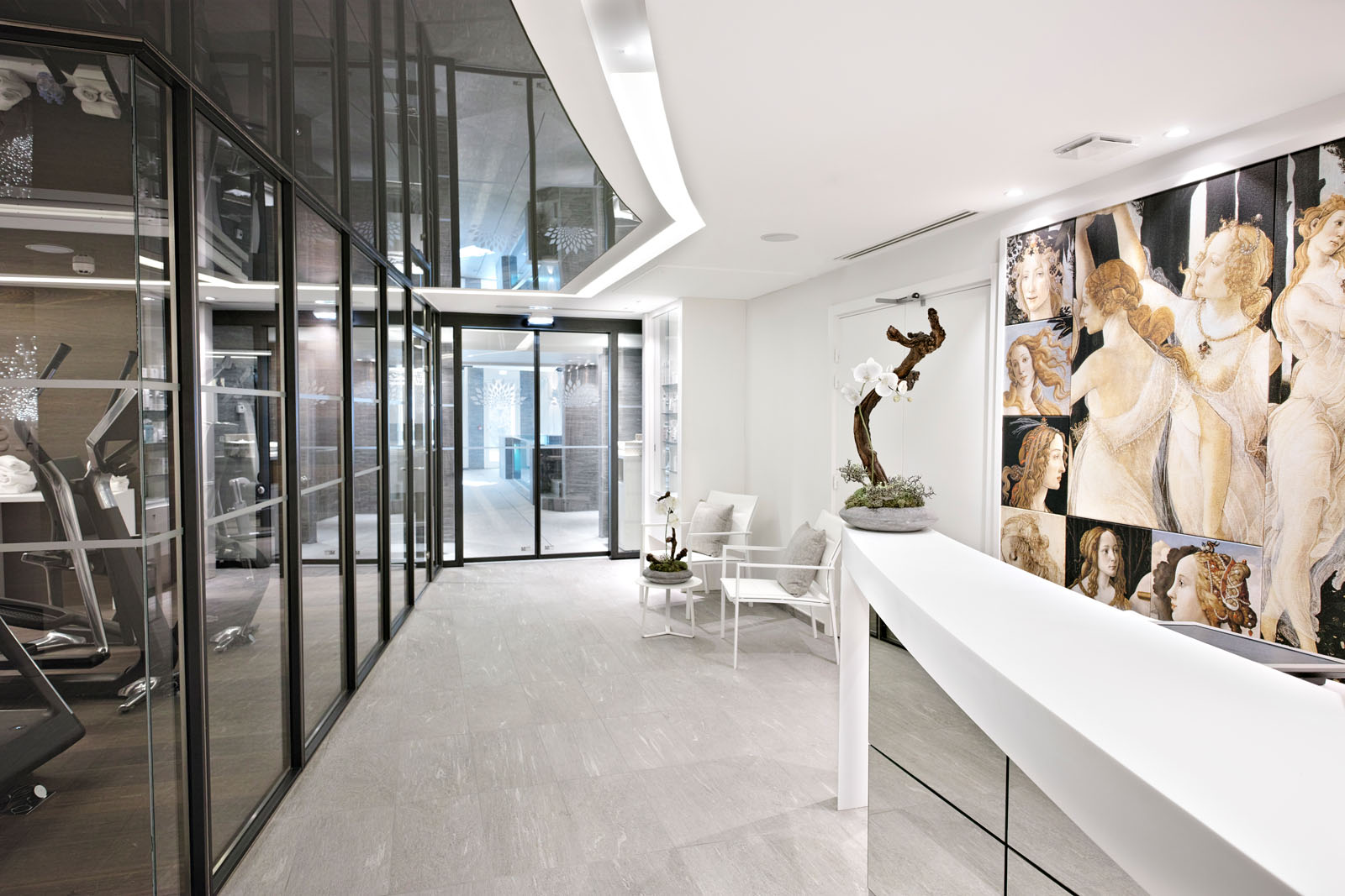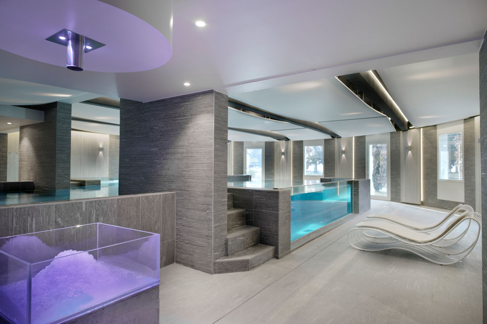 Aleasă în formatul 30x60 cm și în versiunea structurată, Mystone Pietra di Vals Gri acoperă pardoseala Spa-ului, în timp ce pentru placare a fost selectată colecția în versiunea ei mozaic 30x60 cm. Marea protagonistă a centrului wellness este piscina, placată cu Mystone Pietra di Vals Antracite, tonalitate mai închisă față de restul spațiului pentru a sublinia volumetria bazinului.