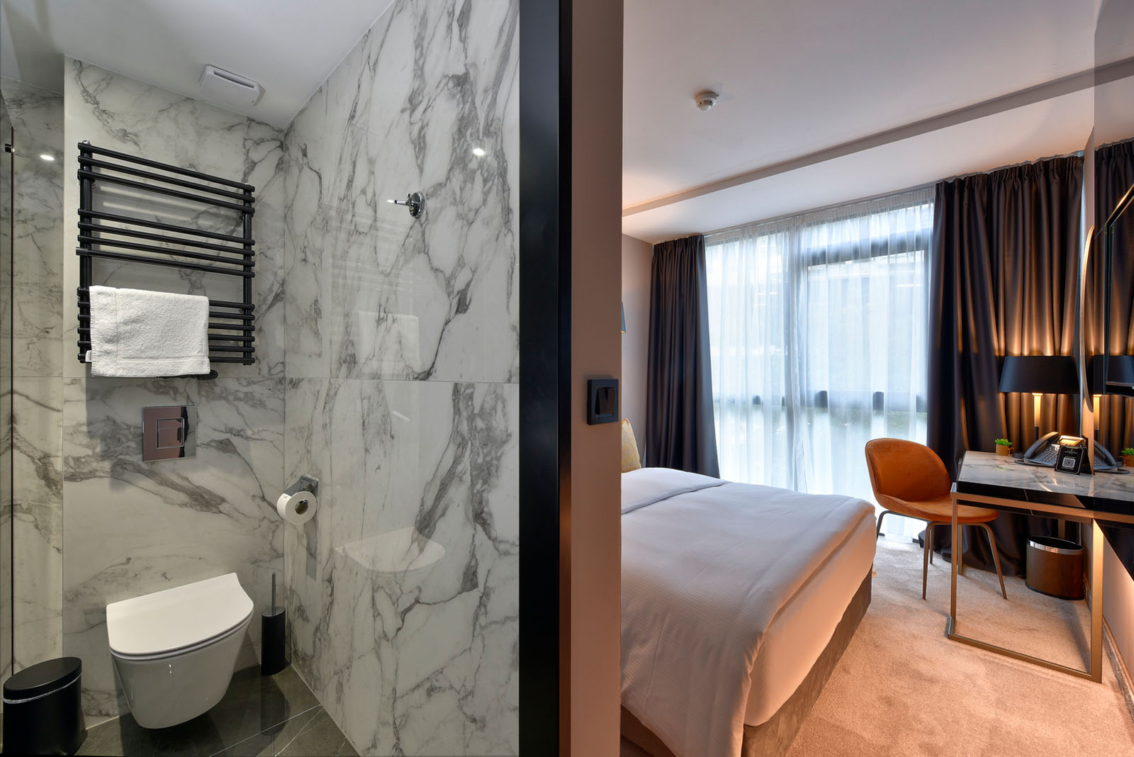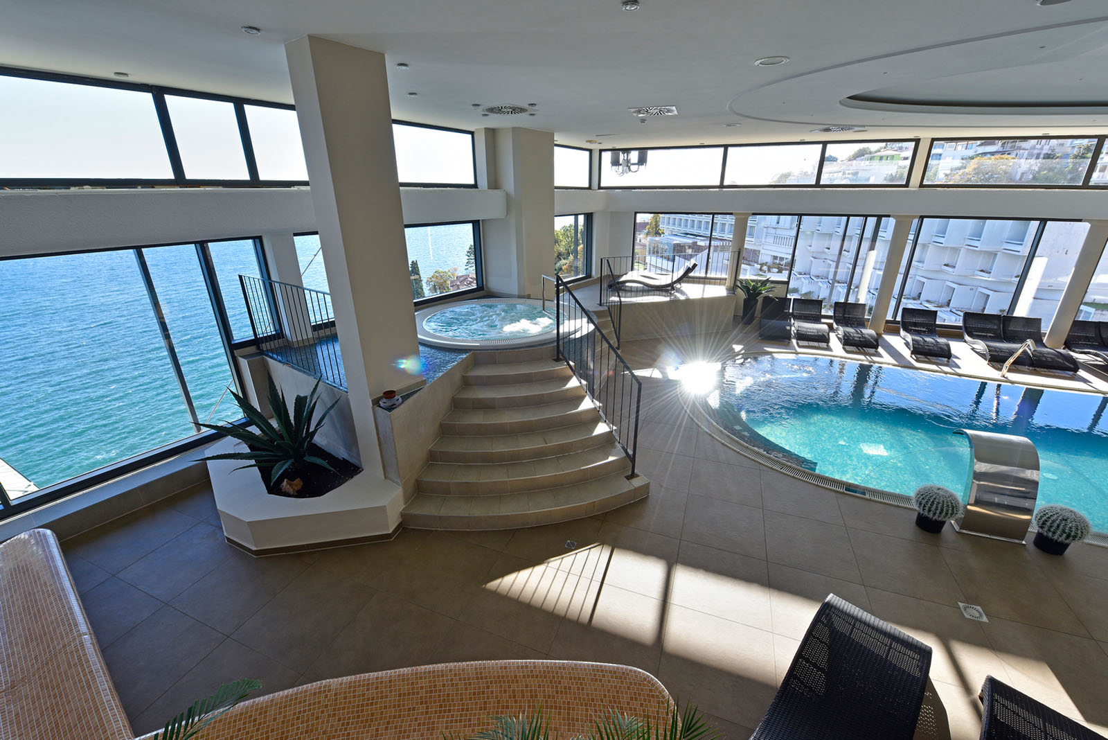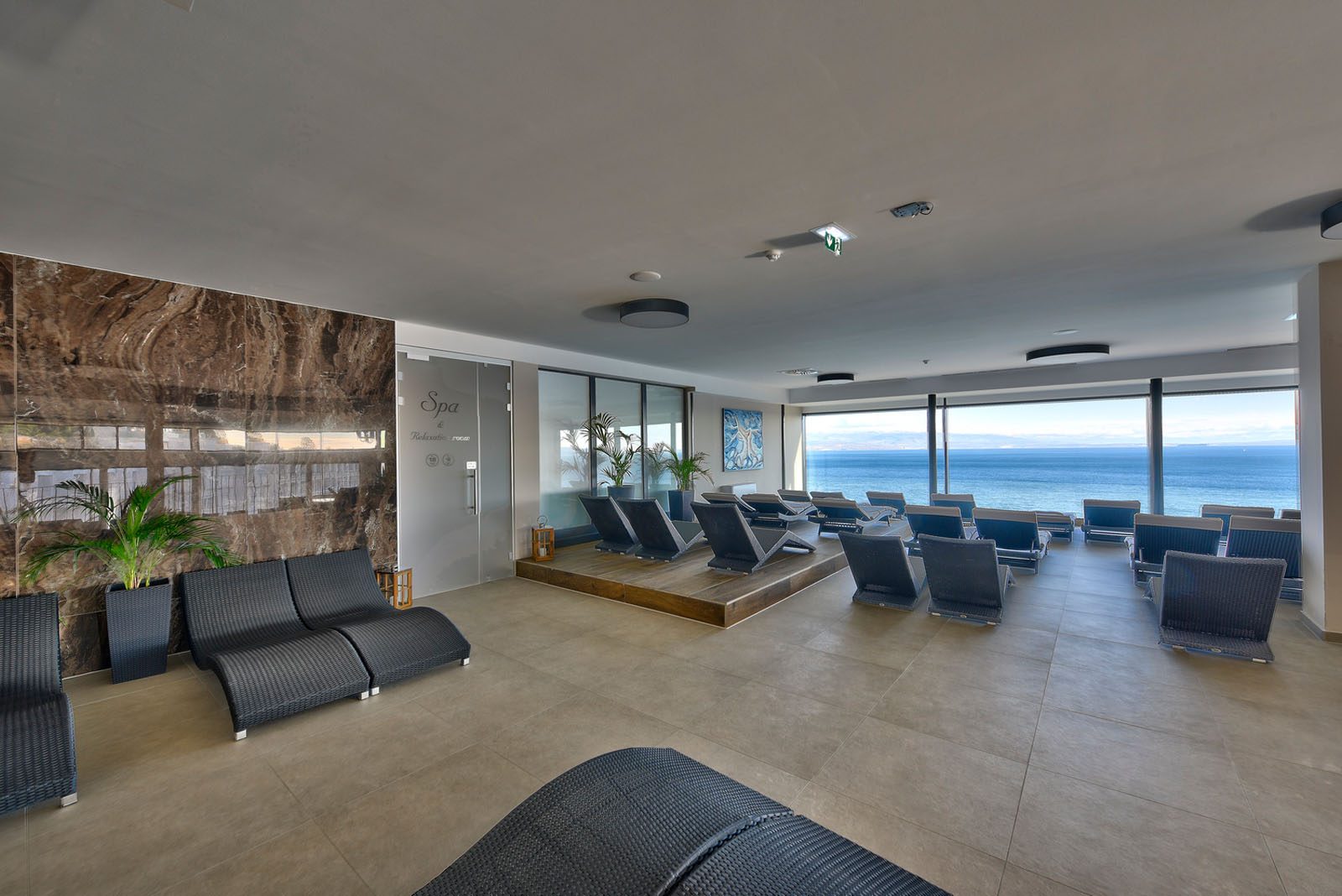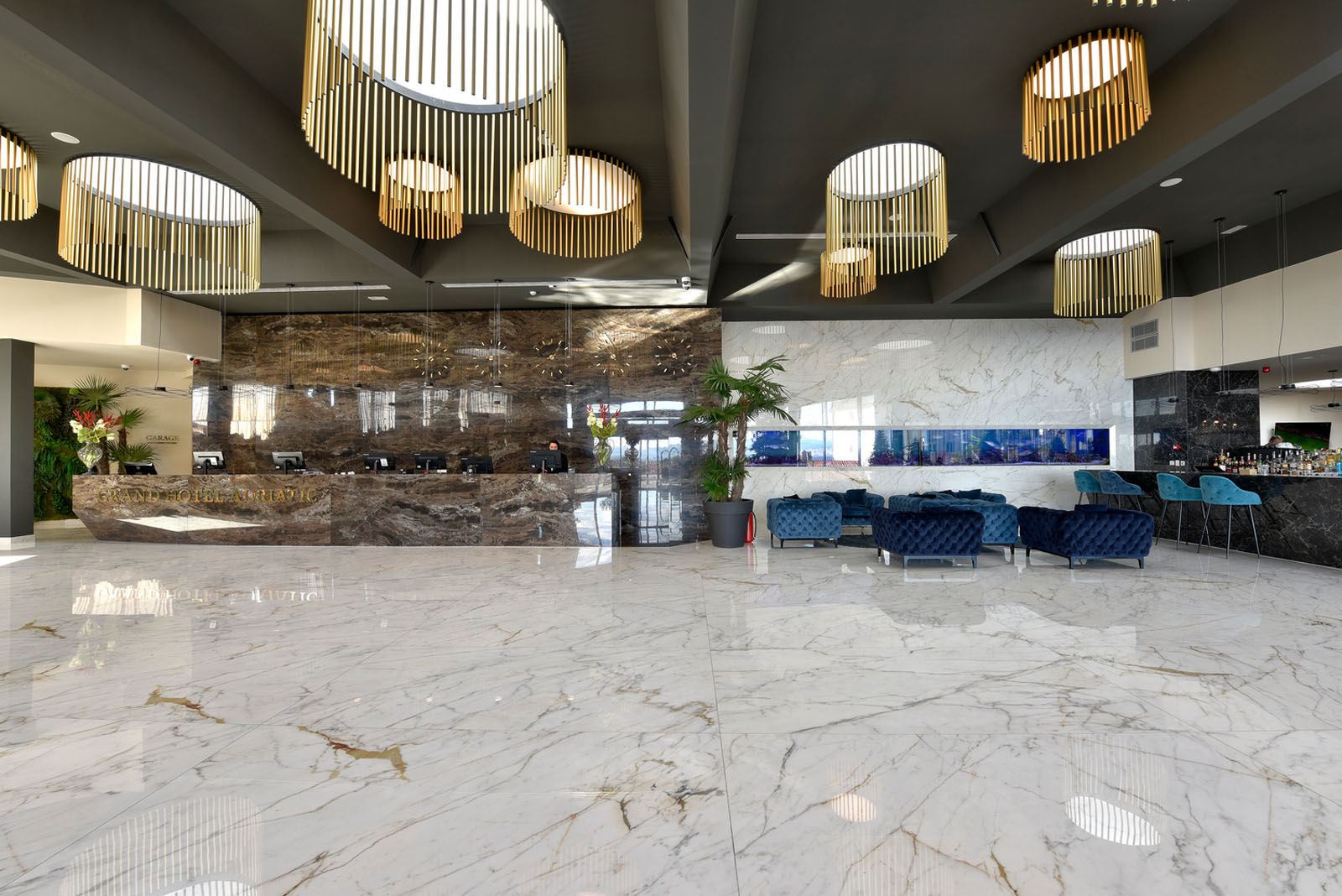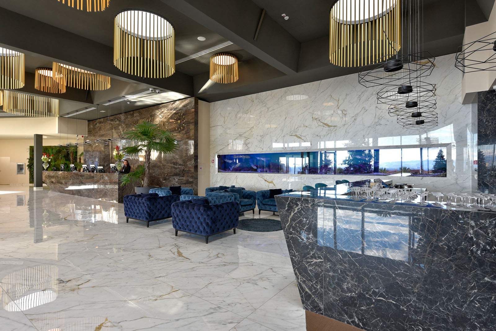 Plăci mari Grande Marble Look Frappuccino au fost folosite pentru placarea luxosului Adriatic Sky Spa, situat la etajul opt al hotelului, înconjurat de ferestre mari, cu o priveliște uluitoare asupra mării din jur. Pentru pardoseală s-a optat pentru alternarea diferitelor efecte de materiale; gresie cu aspect de ciment Terratech în format 75x75 cm, o colecție tehnică care aprofundează legătura dintre material și culoare și reprezintă o nouă frontieră a produselor de înaltă performanță, tot prin includerea noii tehnologii antiderapante StepWise, în nuanțele Cannella, Avorio și Senape alături de colecția Vero, dedicată spațiilor exterioare, cu o grosime mare de 20 mm, aleasă în varianta Rovere 40x120 cm, ce încorporează tonurile și finisajul lemnului natural. Pentru camere și apartamente, pe pardoseli și placarea băilor s-au folosit plăci Grande Marble Look în nuanțele Imperiale, Calacatta Extra și Elegant Black ce contribuie la crearea unor spații elegante și contemporane.
