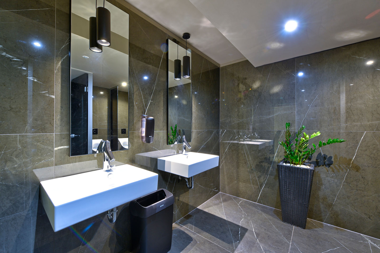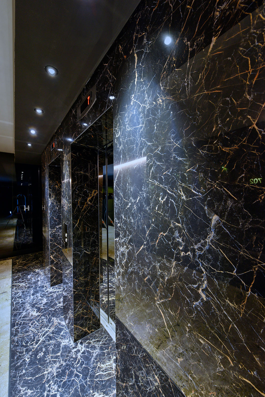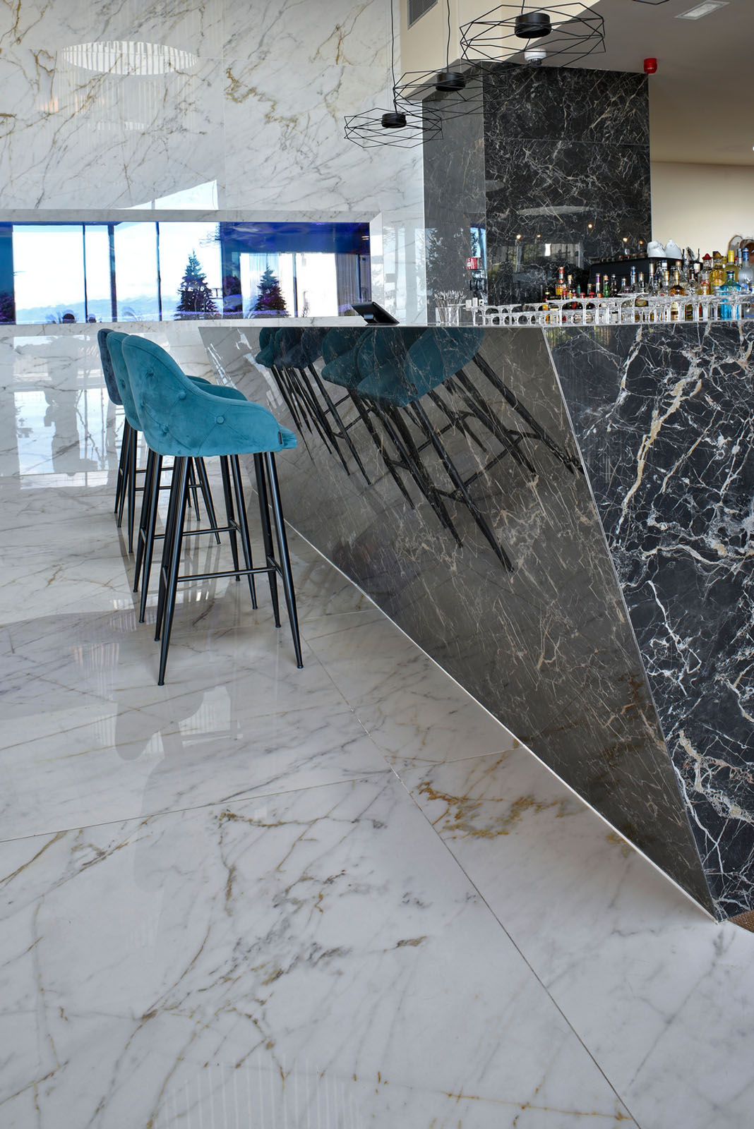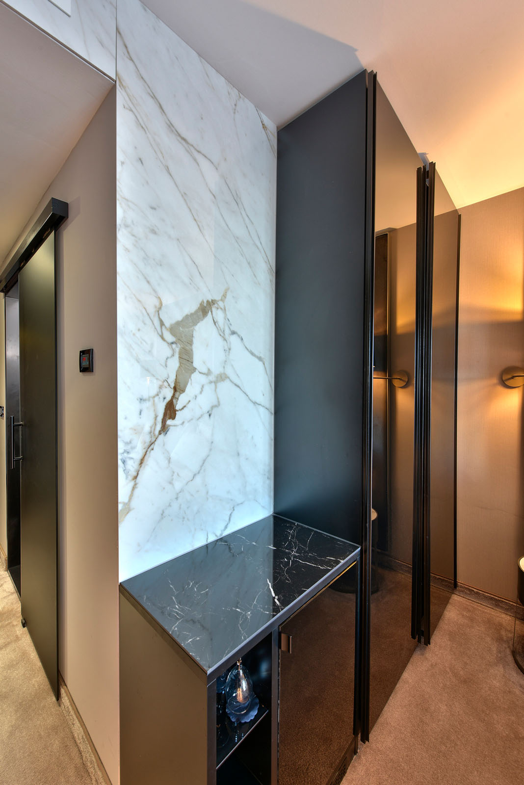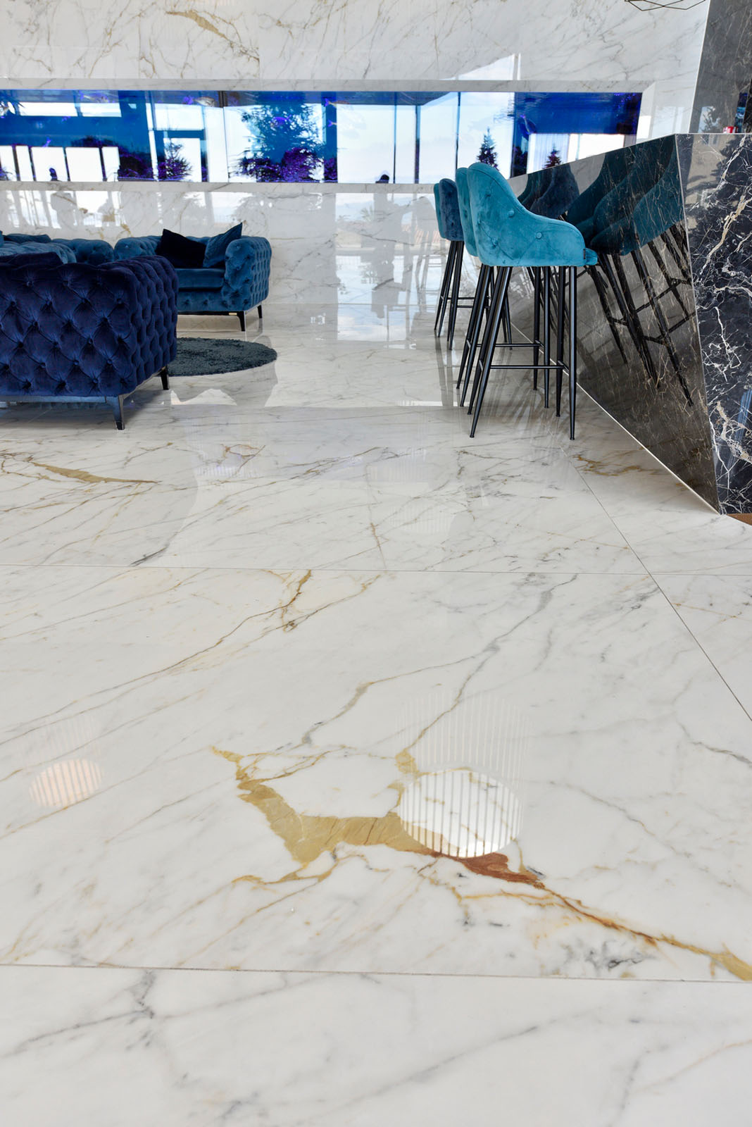 Colecțiile Marazzi au jucat un rol decisiv in acest proiect, conferind personalitate diverselor medii in care au fost folosite. Farmecul marmurei clasice, cu nervuri contrastante, alternanța de nuanțe deschise și închise și reproducerea nuanțelor multiple grație tehnologiei digitale, sunt reinterpretate in același timp păstrându-și caracterul prețios și unic cu ajutorul plăcilor mari de gresie porțelanată ale colecției Grande Marble Look, folosit aici în nuanțele Golden White, Saint Laurent și Frappucino în format 120x240 cm alese pentru spațiile comune.